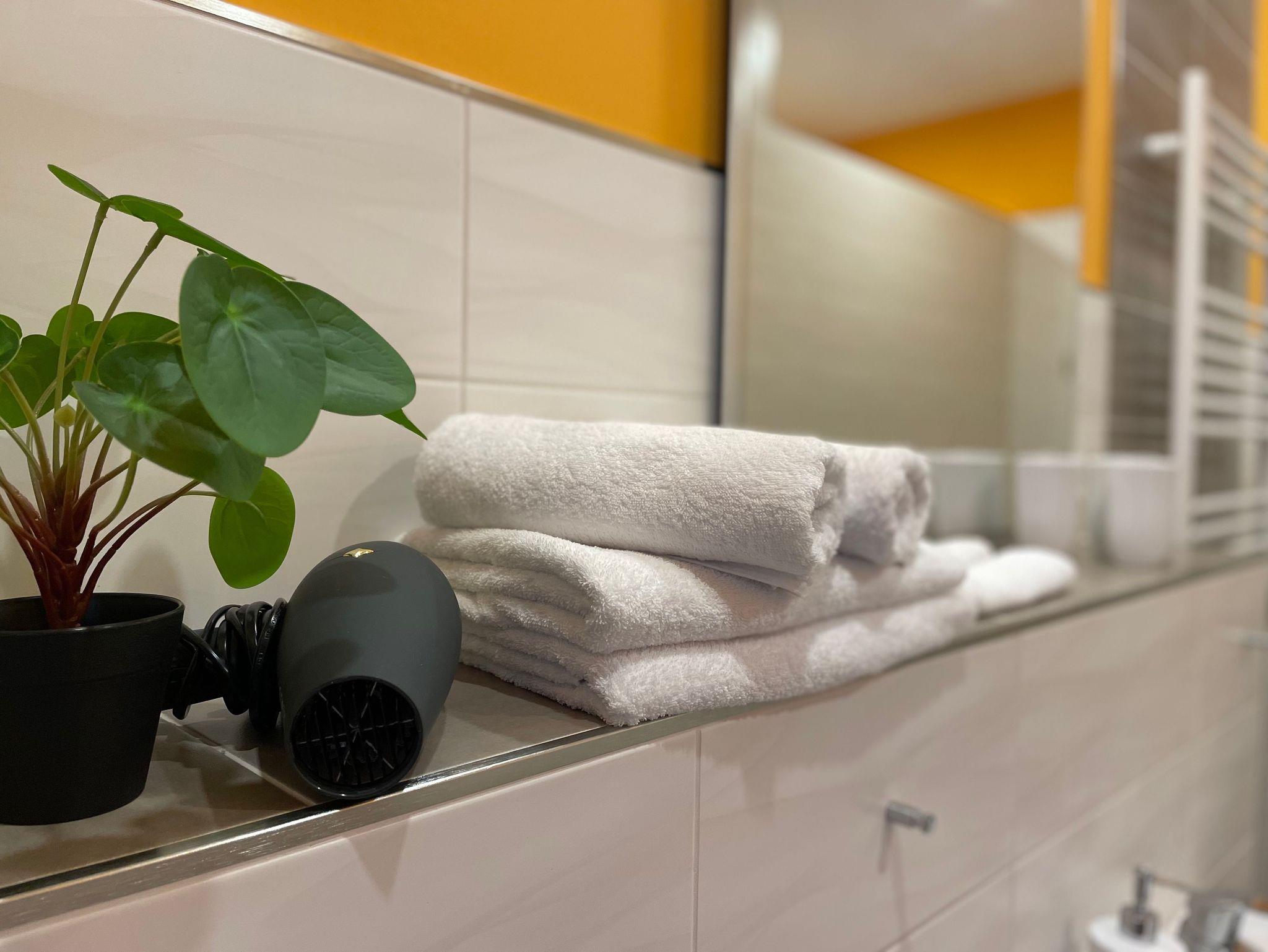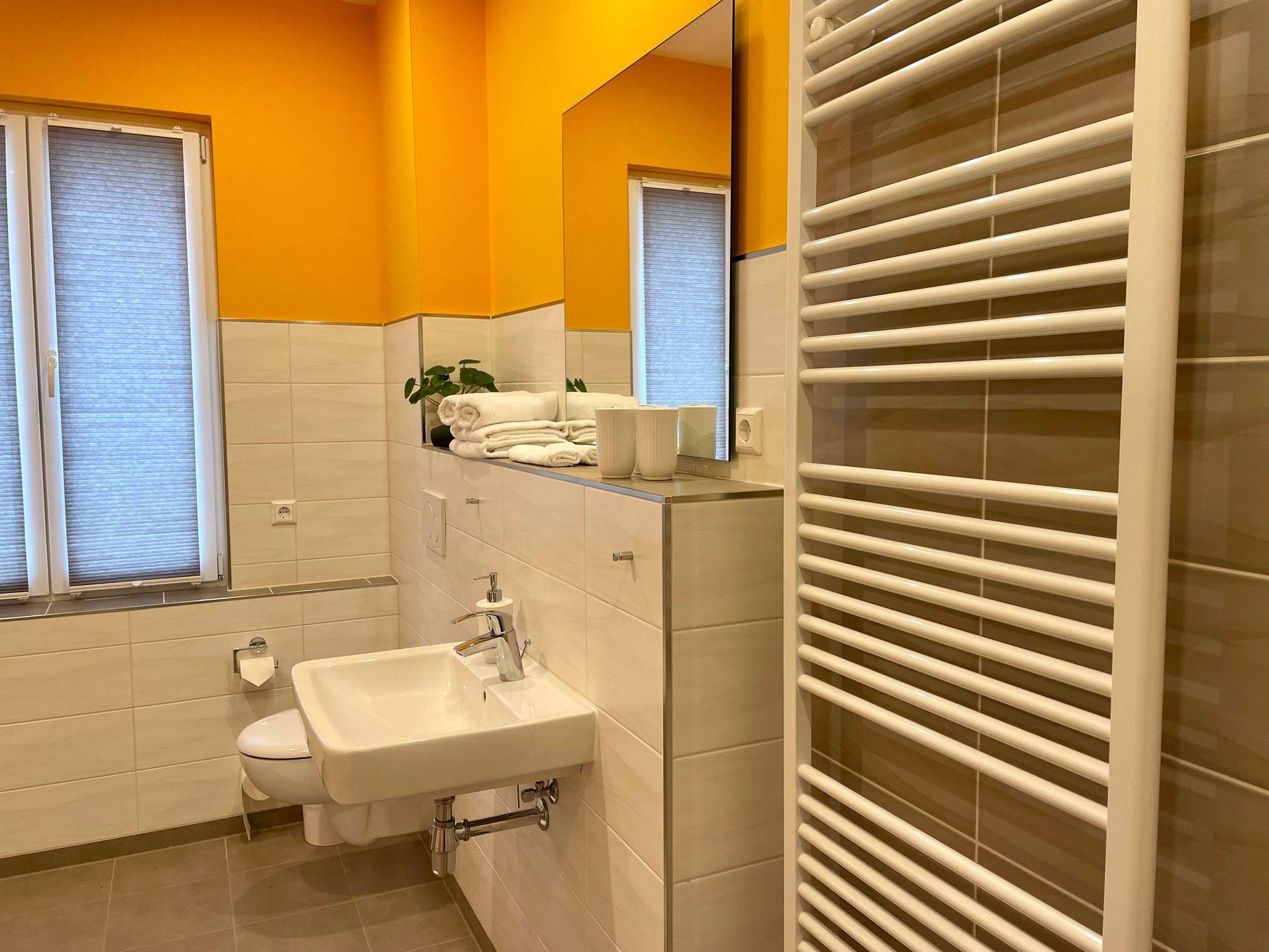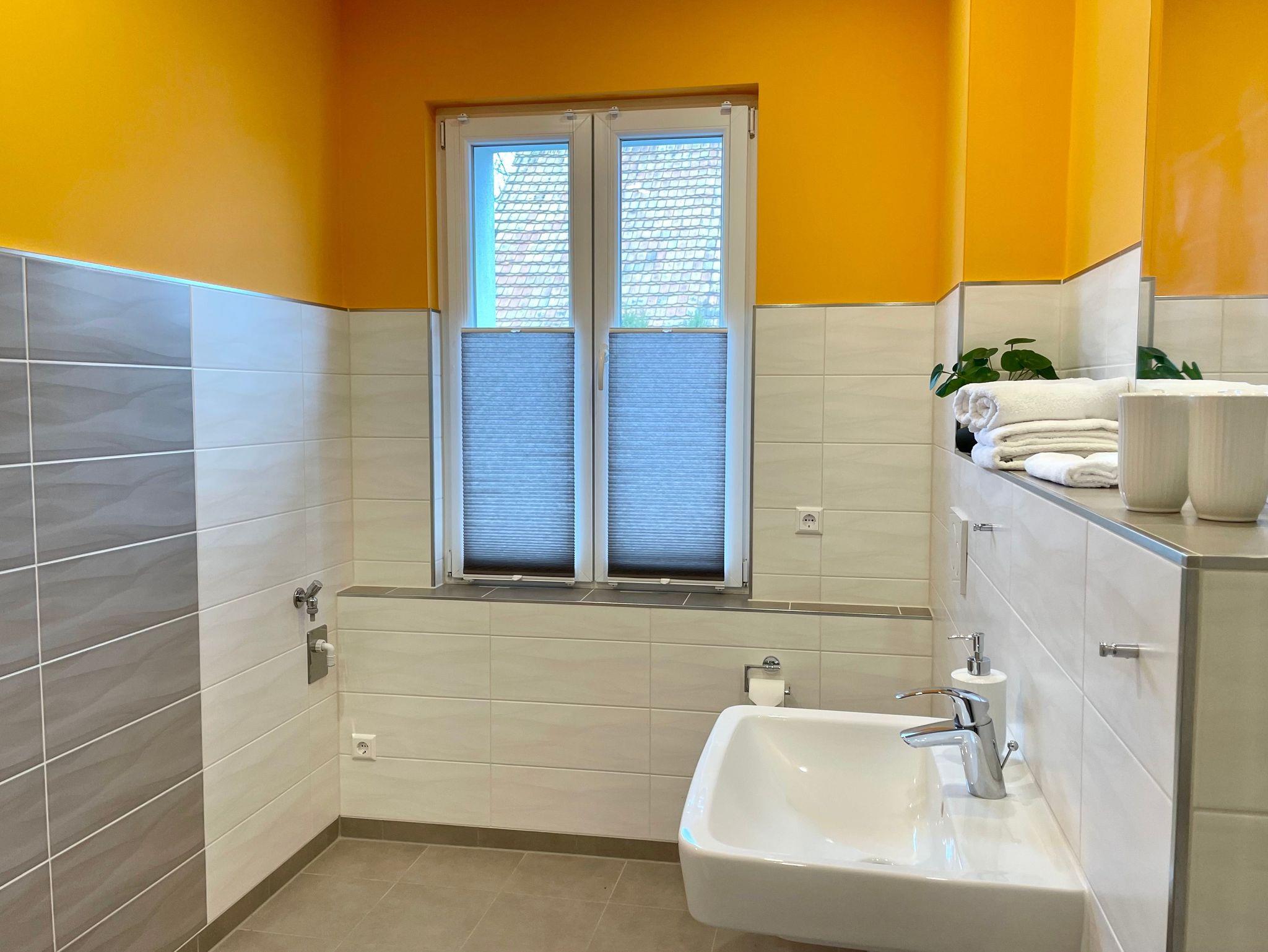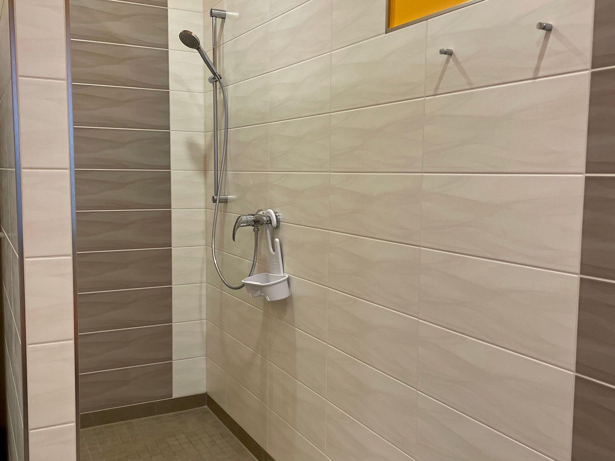 Das separate Bad mit Dusche/ WC schließt sich dem Flur an und hat eine ebenerdige große Dusche. Das helle Badezimmer hält Handtücher, Gästehandtücher, einen Föhn und Seife für Sie bereit. Es hat ein Fenster und ist verdunkelbar.