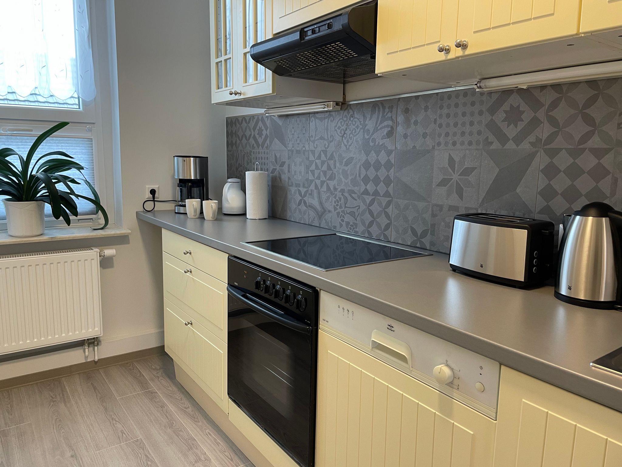Die helle und moderne Küche verfügt über eine Kaffeemaschine, Toaster, einer Mikrowelle und einem Koch/- und Backofen. Ein moderner Geschirrspüler ist als Küchenhelfer dienlich.