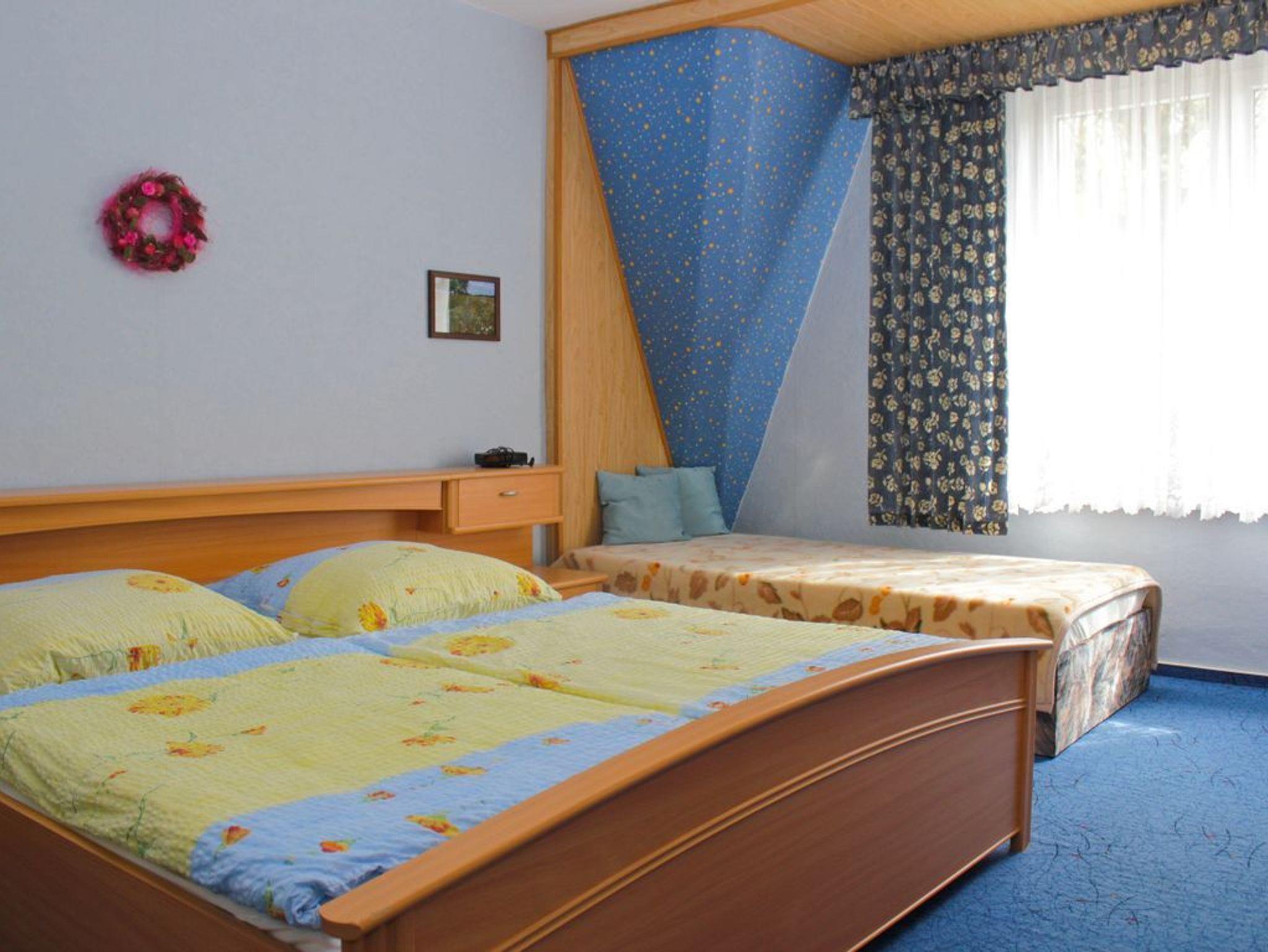 Die 2016 neu gebaute Ferienwohnung liegt in der unteren Etage des Hauses und ist über die vordere Eingangstür zu erreichen. Die Wohnung besteht aus einem Wohn-/Schlafraum, einer Küche, Bad (Dusche/WC) sowie einem Flur. Auf ca. 42 qm können hier gemütlich zwei Personen wohnen. Die geräumige Wohnküche ist ein Erkerzimmer, in dem neben der sehr gut ausgestatteten Küche auch eine Sitzgelegenheit vorhanden ist. Der Wohn-/Schlafbereich ist mit Teppichboden, einer Polstergarnitur mit Sessel, Couch und Tisch gut ausgestattet. Im hinteren Teil des Raumes bildet ein klassisches Doppelbett mit entsprechenden Nachtschränkchen und Beleuchtung den Schlafbereich des Raumes. Im Garten ist Grillen, Tischtennis oder Federballspielen möglich.