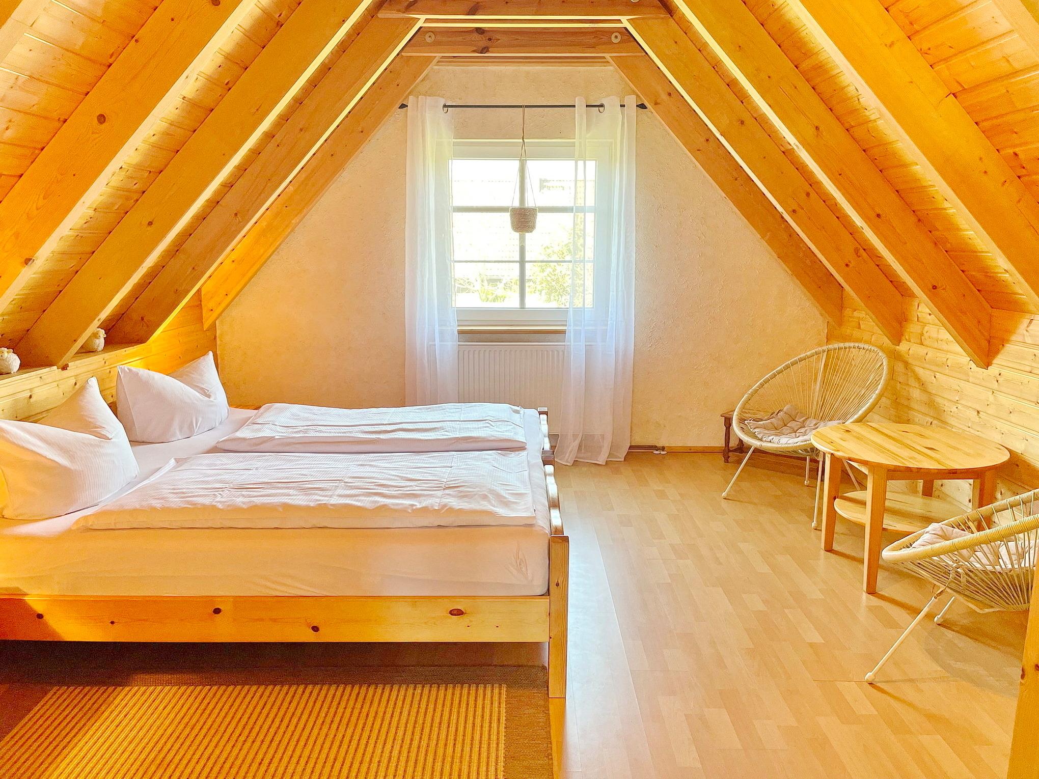 Das spreewaldtypische Haus hat eine überdachte Terrasse am Eingangsbereich, mit einem großen Esstisch und Bestuhlung. Der Flur ist kombiniert mit einer Küchenzeile (2 Platten-Herd, Abwaschbecken, Toaster, Kaffeemaschine, Wasserkocher und zahlreiche Küchenutensilien) und Zugang zum Esszimmer, mit Tisch und Sitzecke. Das Bad, mit Dusche und WC, sowie das offene Kinderzimmer befinden sich im Erdgeschoss. Das Schlafzimmer mit einem Doppelbett sowie einem Flachbild TV steht Ihnen im Obergeschoss zur Verfügung.