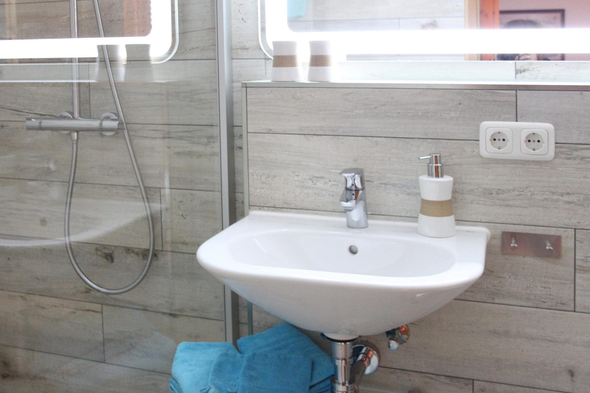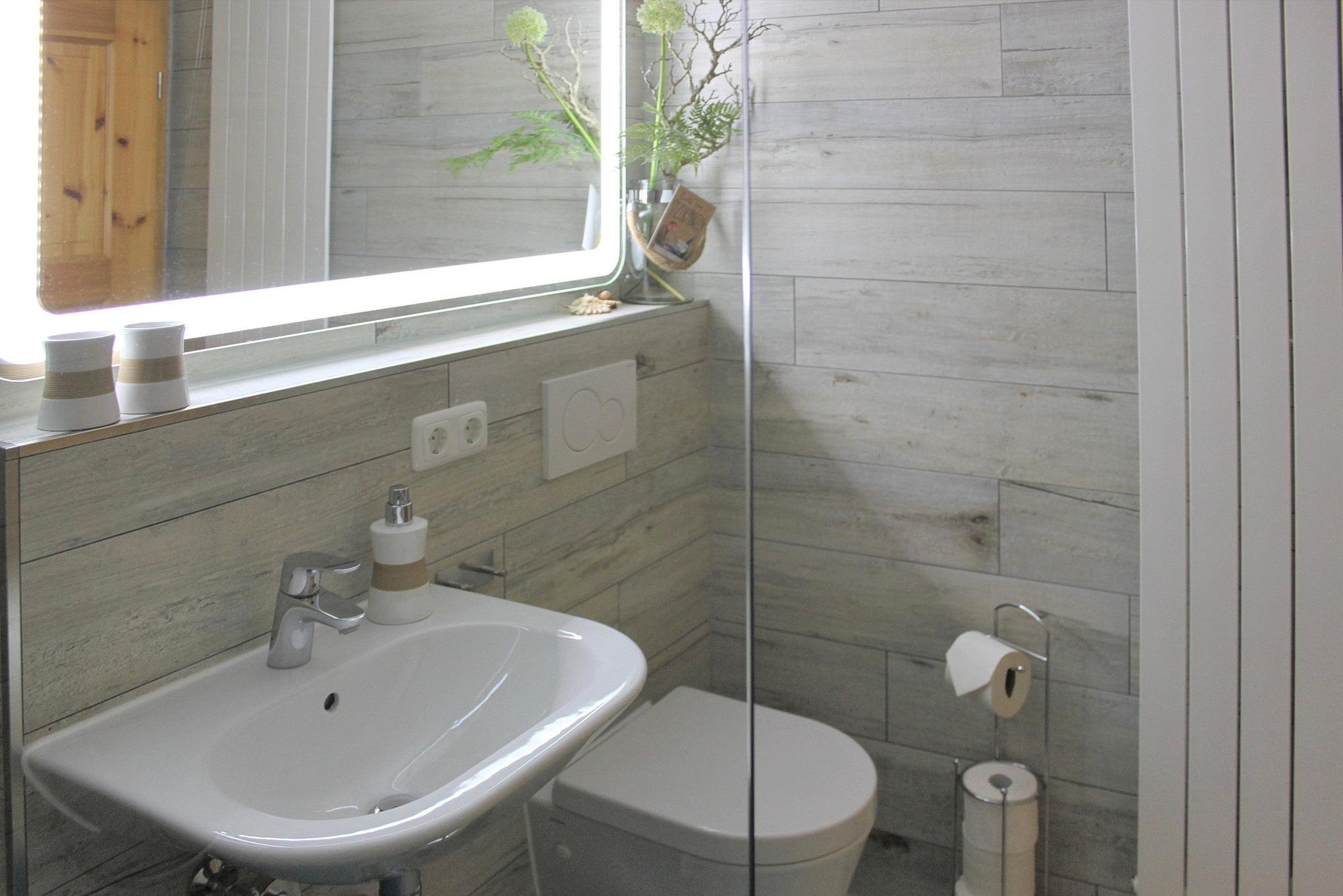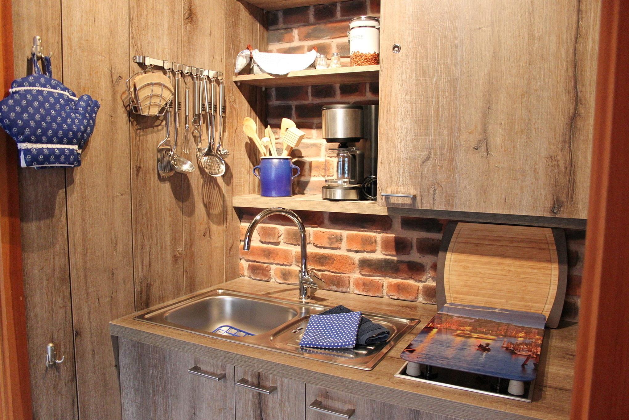 Sie ist hochwertig und mit Liebe zum Detail ländlich eingerichtet. Die Pantryküche befindet sich im Eingang der Ferienwohnung und ist ausgestattet mit einer Spüle, einem Ceran Herd mit zwei Platten, Kühlschrank mit Gefrierfach, Wasserkocher Toaster und Kaffeemaschine. Der Schlafraum bietet neben einem großzügigen Doppelbett (1,80 x 2,00 m), einem Kleiderschrank mit viel Stauraum auch einen Essbereich mit gemütlicher Sitzecke. Sowohl vom Bett als auch von der Sitzecke kann man dem Fernsehprogramm auf dem Flachbild TV folgen. Der Schlafraum verfügt über ausreichend Platz für ein Babyreisebett. Das moderne Bad mit Fliesen in Holzoptik ist mit einer ebenerdigen Dusche und einer Toilette ausgestattet. Über dem Waschbecken befindet sich ein großer beleuchteter Spiegel. Außerdem sind ein Föhn sowie Handtuchtrockner vorhanden. Aus Rücksicht auf andere Gäste ist das Rauchen in der Wohnung nicht gestattet. WLAN ist vorhanden und kostenfrei.