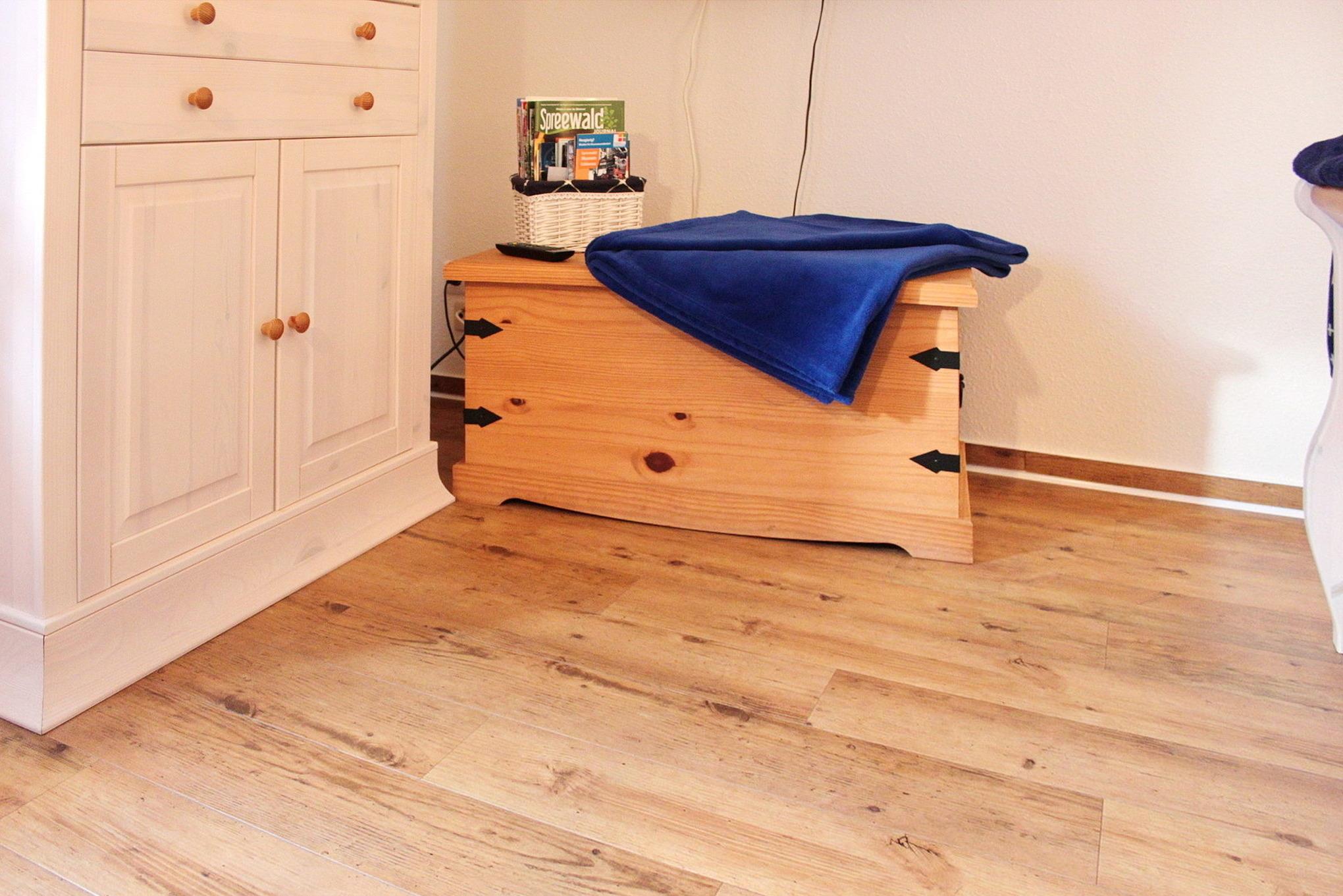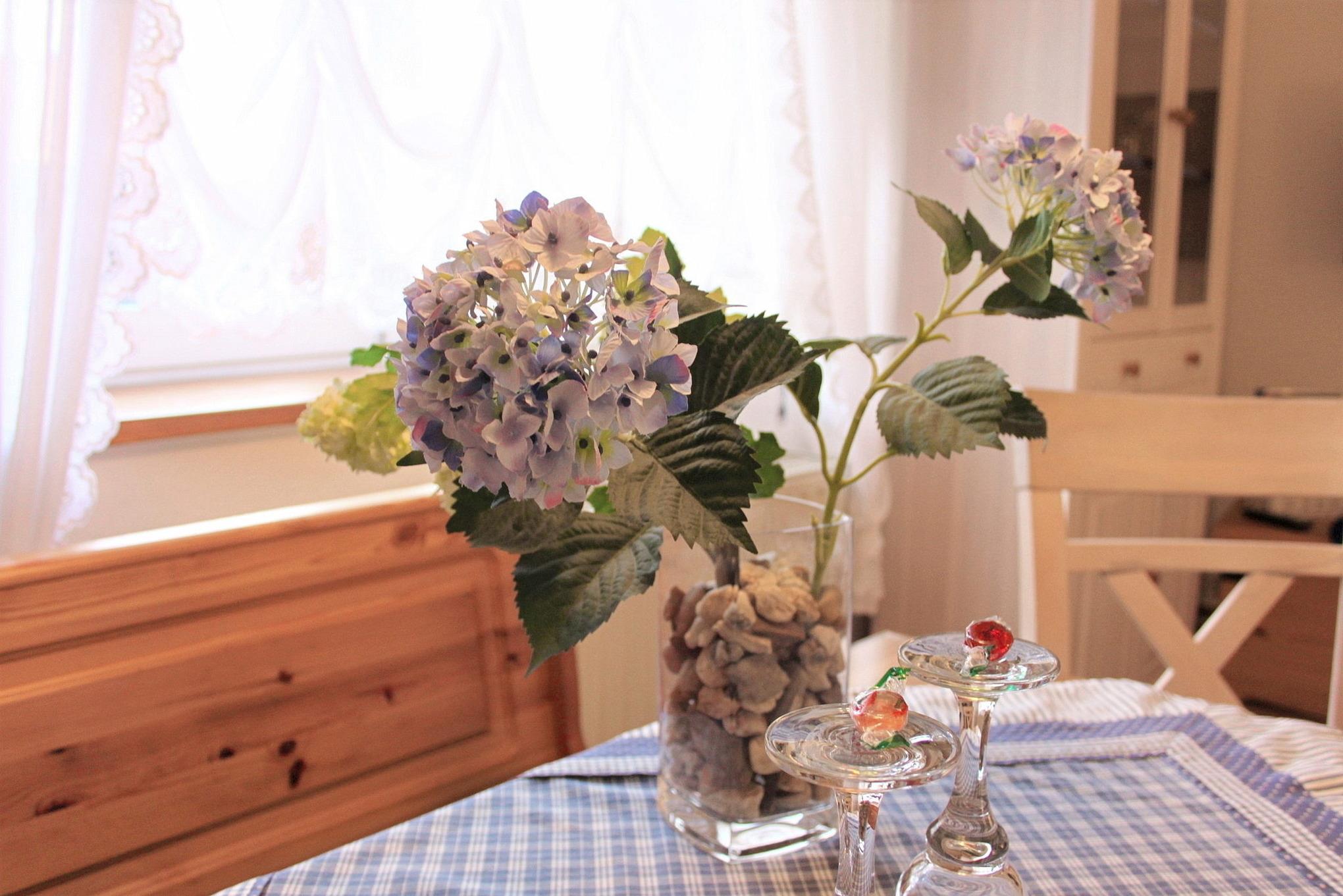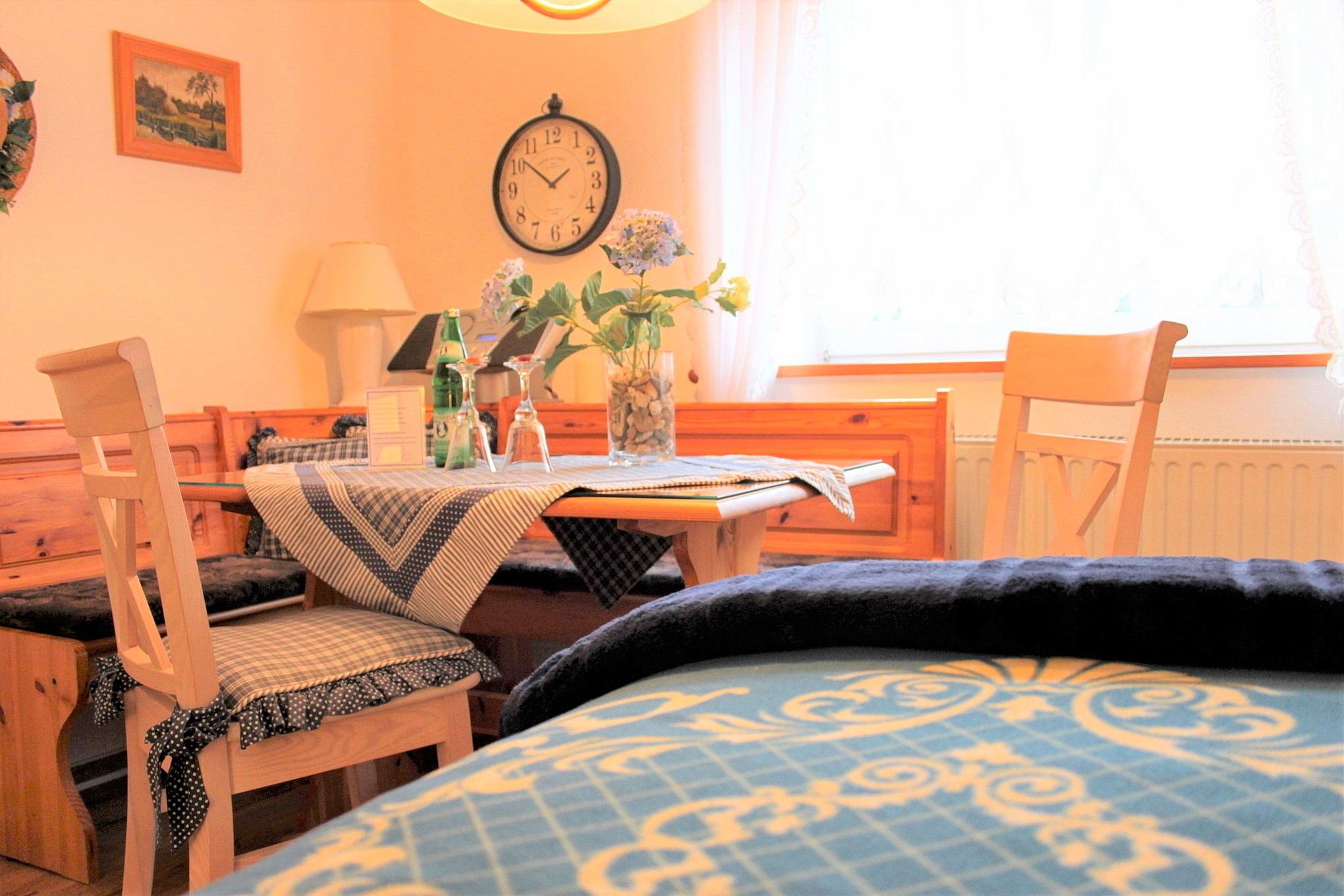 Sie ist hochwertig und mit Liebe zum Detail ländlich eingerichtet. Die Pantryküche befindet sich im Eingang der Ferienwohnung und ist ausgestattet mit einer Spüle, einem Ceran Herd mit zwei Platten, Kühlschrank mit Gefrierfach, Wasserkocher Toaster und Kaffeemaschine. Der Schlafraum bietet neben einem großzügigen Doppelbett (1,80 x 2,00 m), einem Kleiderschrank mit viel Stauraum auch einen Essbereich mit gemütlicher Sitzecke. Sowohl vom Bett als auch von der Sitzecke kann man dem Fernsehprogramm auf dem Flachbild TV folgen. Der Schlafraum verfügt über ausreichend Platz für ein Babyreisebett. Das moderne Bad mit Fliesen in Holzoptik ist mit einer ebenerdigen Dusche und einer Toilette ausgestattet. Über dem Waschbecken befindet sich ein großer beleuchteter Spiegel. Außerdem sind ein Föhn sowie Handtuchtrockner vorhanden. Aus Rücksicht auf andere Gäste ist das Rauchen in der Wohnung nicht gestattet. WLAN ist vorhanden und kostenfrei.