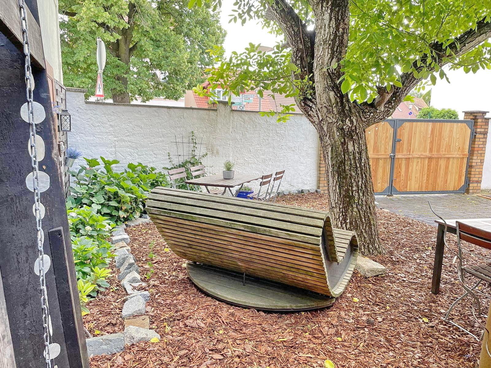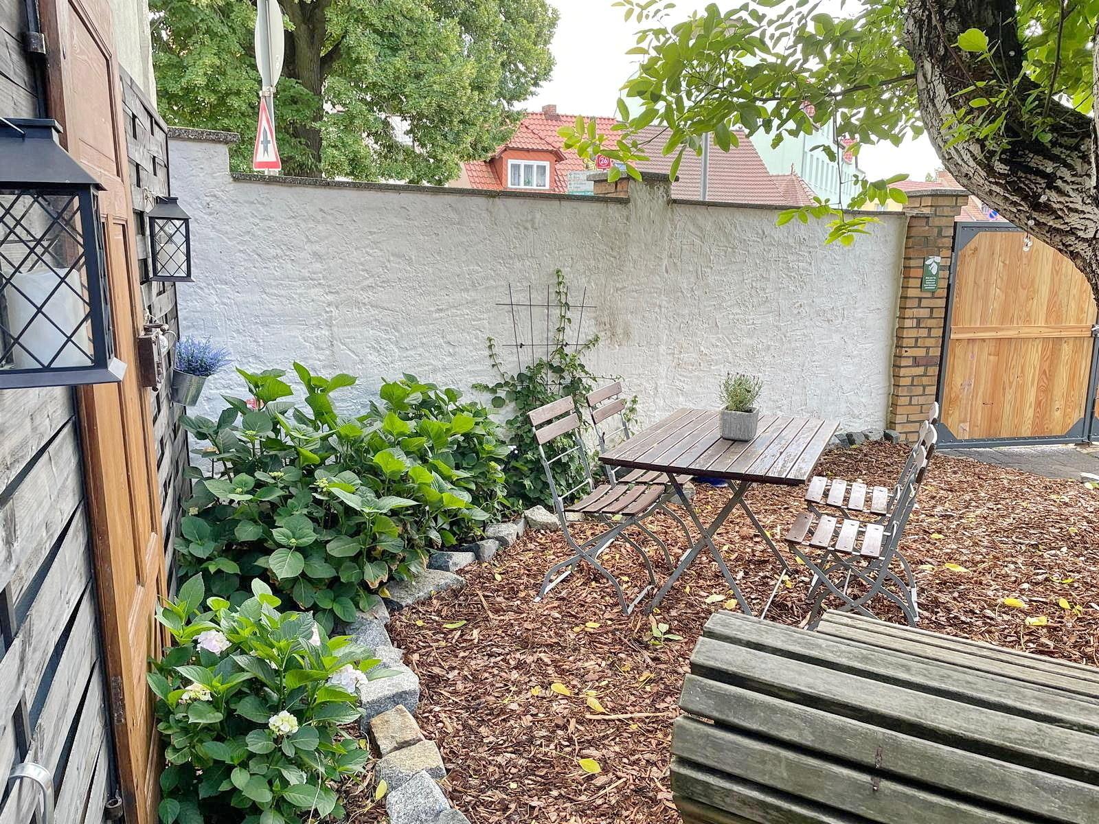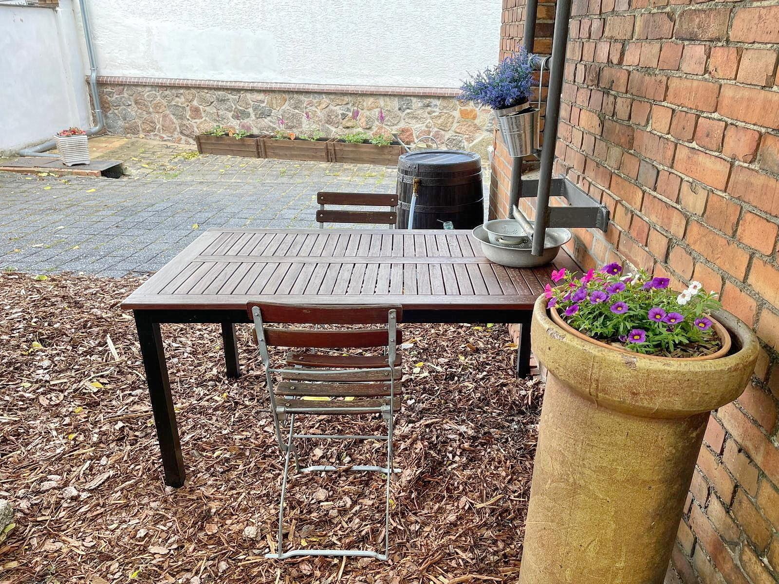 Zur Wohnung gehört auch ein wunderschöner gemeinschaftlicher Gästebereich, der ideal zum Entspannen und Grillen im Freien ist.Parkplätze sind kostenfrei verfügbar. Der Hauseingang ist durch eine kleine Treppe zu erreichen. Es gibt Fahrradstellplätze auf dem abgeschlossenen Grundstück.