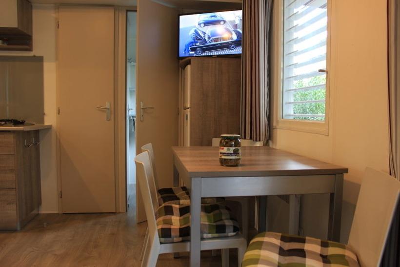 Aufgeteilt ist das Mobilehome auf zwei Schlafräume. Darunter ein Zimmer mit einem Doppelbett