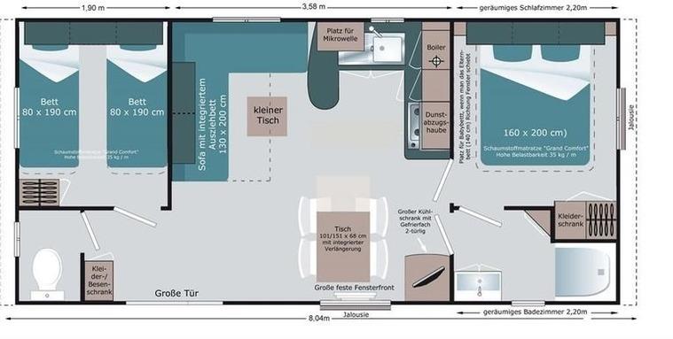 Aufgeteilt ist das Mobilehome auf zwei Schlafräume. Darunter ein Zimmer mit einem Doppelbett und ein Zimmer mit zwei Einzel- und einem Hochbett. Die Konstellation ist besonders Familien mit Kindern zu empfehlen, da hier drei Kinder platz finden.