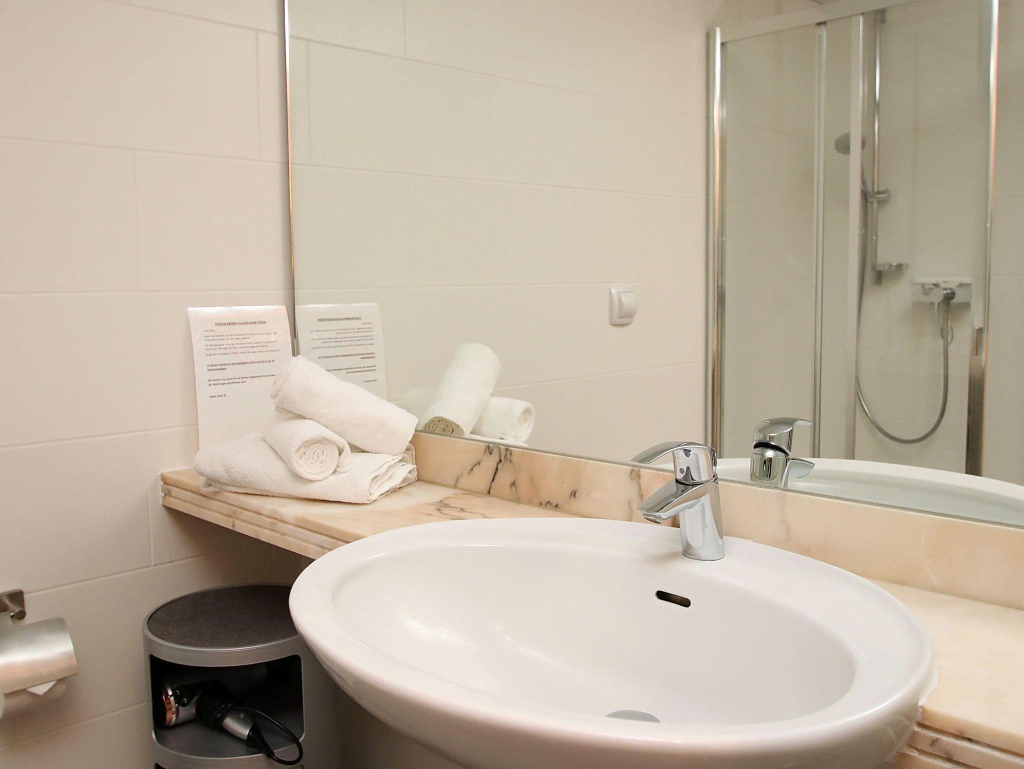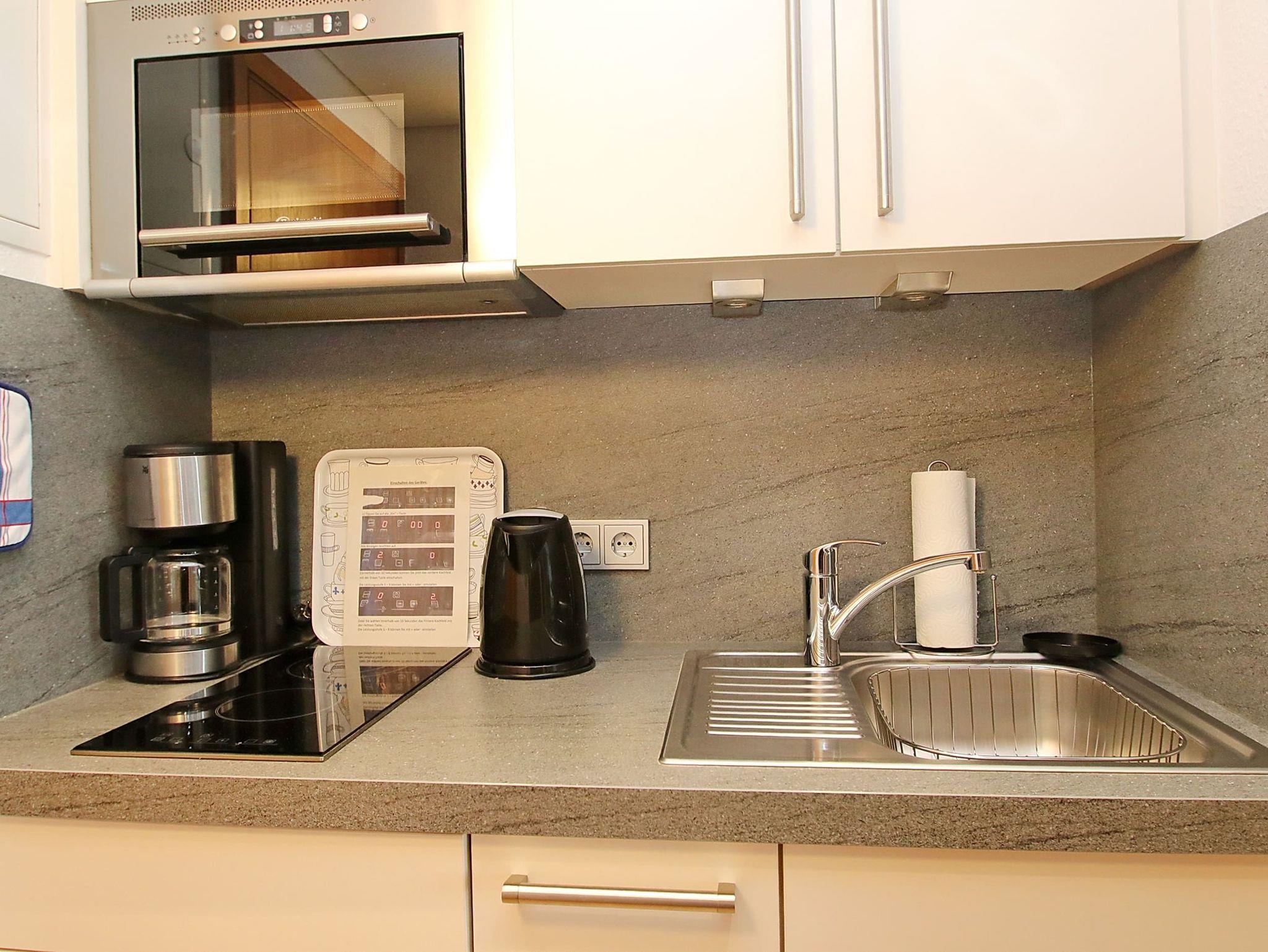 Balkon, Markise, Küchenzeile, Mikrowelle, Duschbad/WC, Fön, TV, Stereoradio mit CD, kostenl. W-Lan, Aufzug, inkl. Tiefgaragenstellplatz (Einfahrtshöhe: 1,85 m).