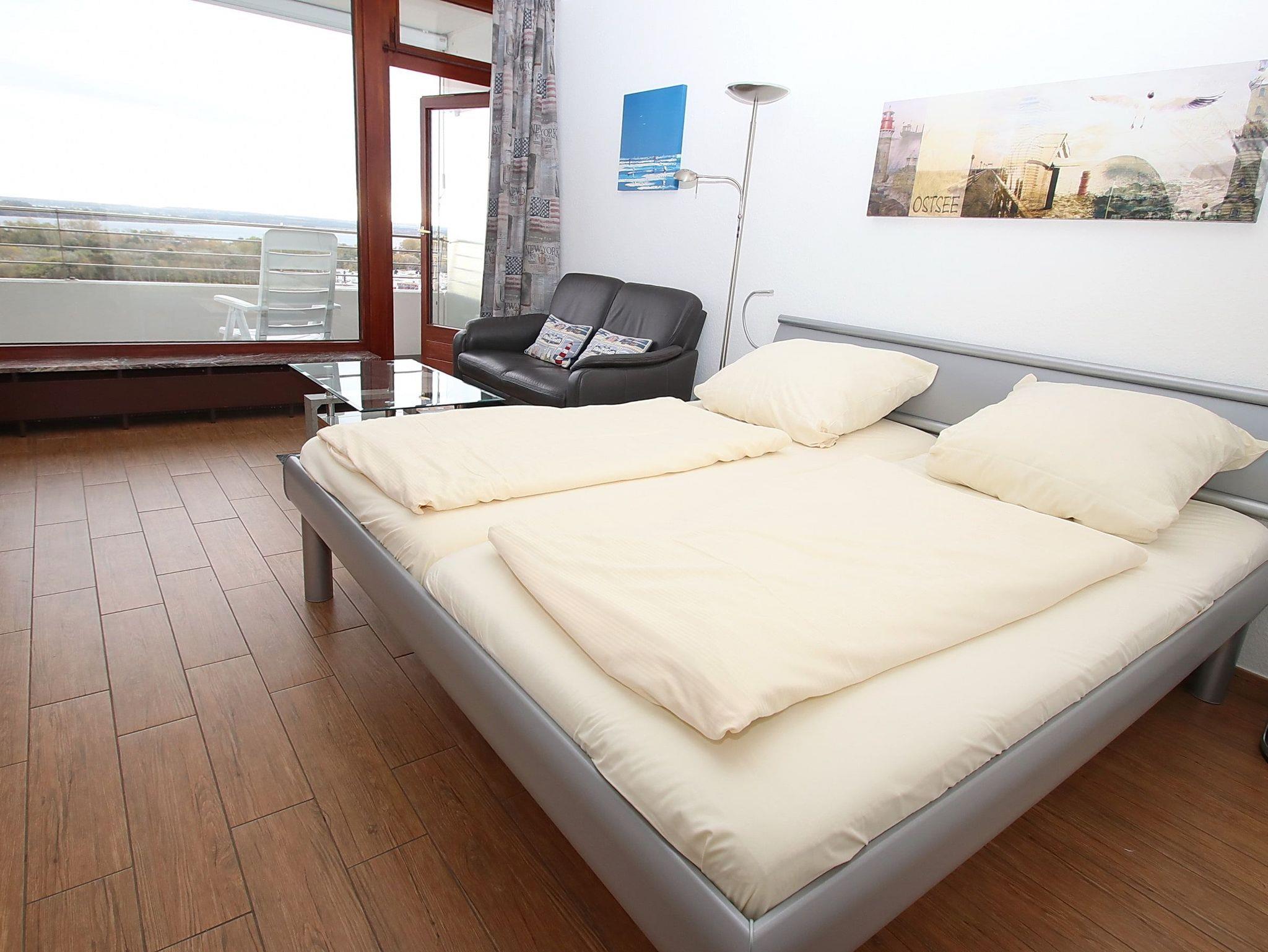 Dieses hochwertige Appartement entspricht allen Ansprüchen und lädt von Anfang an zum Wohlfühlen ein. Der helle Wohnraum besteht aus einem komfortablen Doppelbett (2x 90 cm x 200 cm) und einer bequemen Ledercouch mit Tisch. Des Weiteren gehören zu der geschmackvollen Einrichtung eine Essecke mit Stühlen und ein Kleiderschrank. Der gesamte Wohnbereich ist mit Designerfliesen in Holzoptik ausgestattet. Die moderne Küche ist im Eingangsbereich integriert. Das neue, luxuriöse Duschbad erreichen Sie vom Flur. Diese fantastische Wohnung hat die besten Voraussetzungen für einen erholsamen Urlaub. Vom Balkon genießen Sie einen traumhaften Blick auf die Mecklenburger Bucht und zur Trave mit ein- und ausfahrendem Schiffsverkehr.