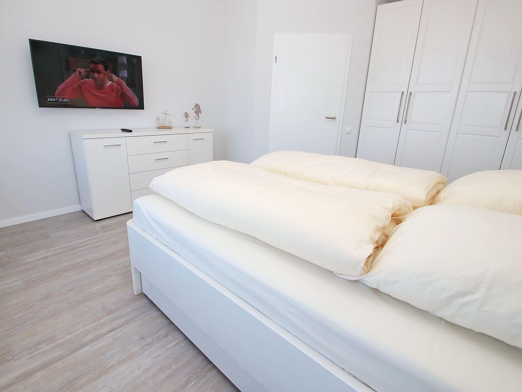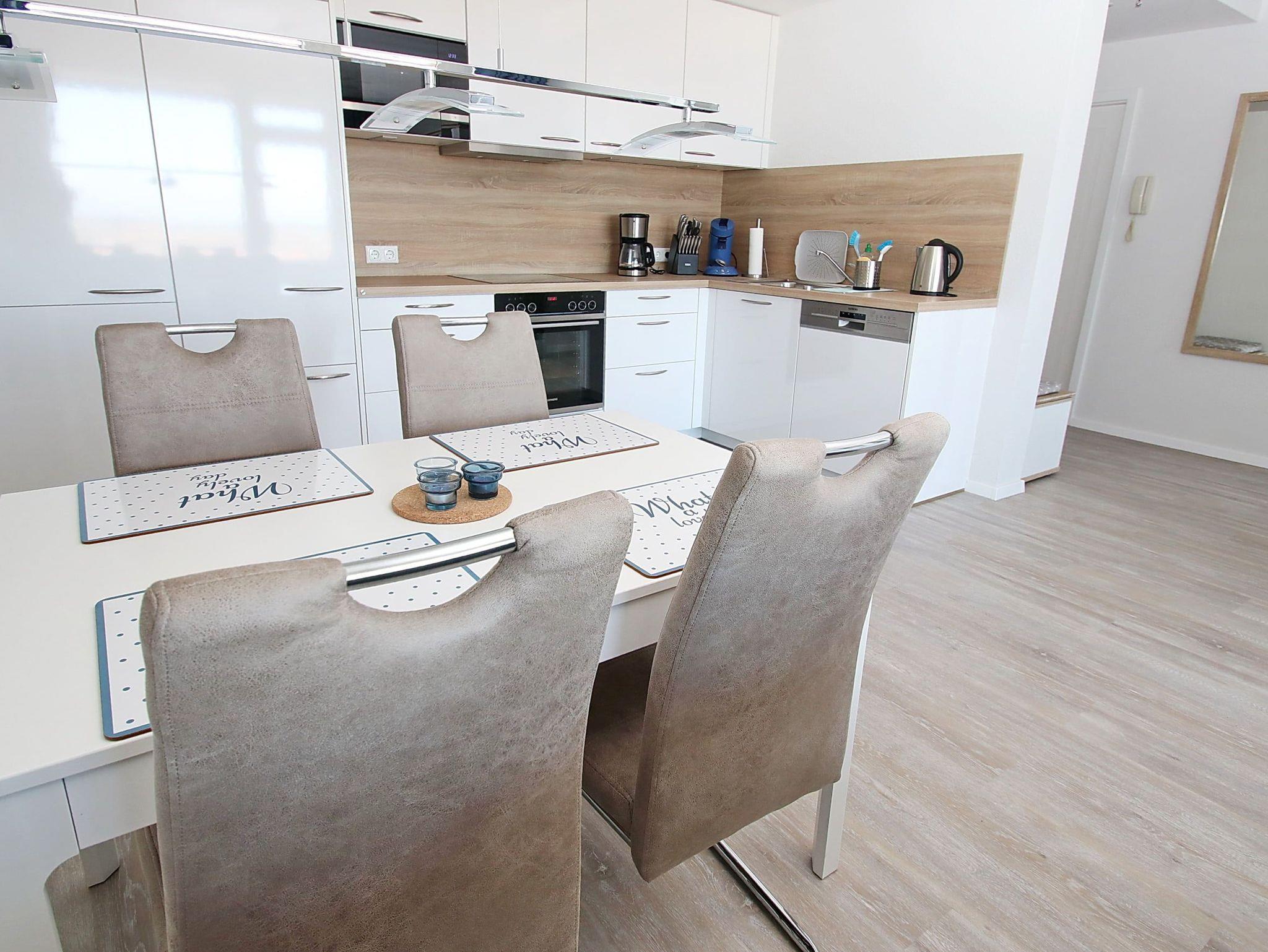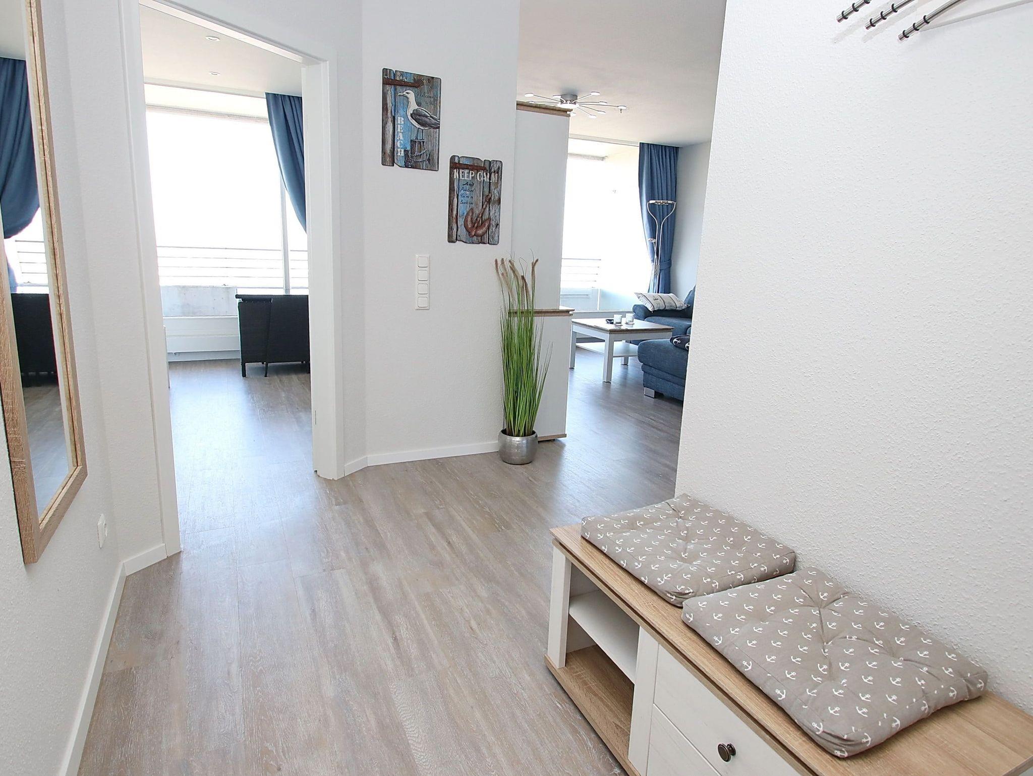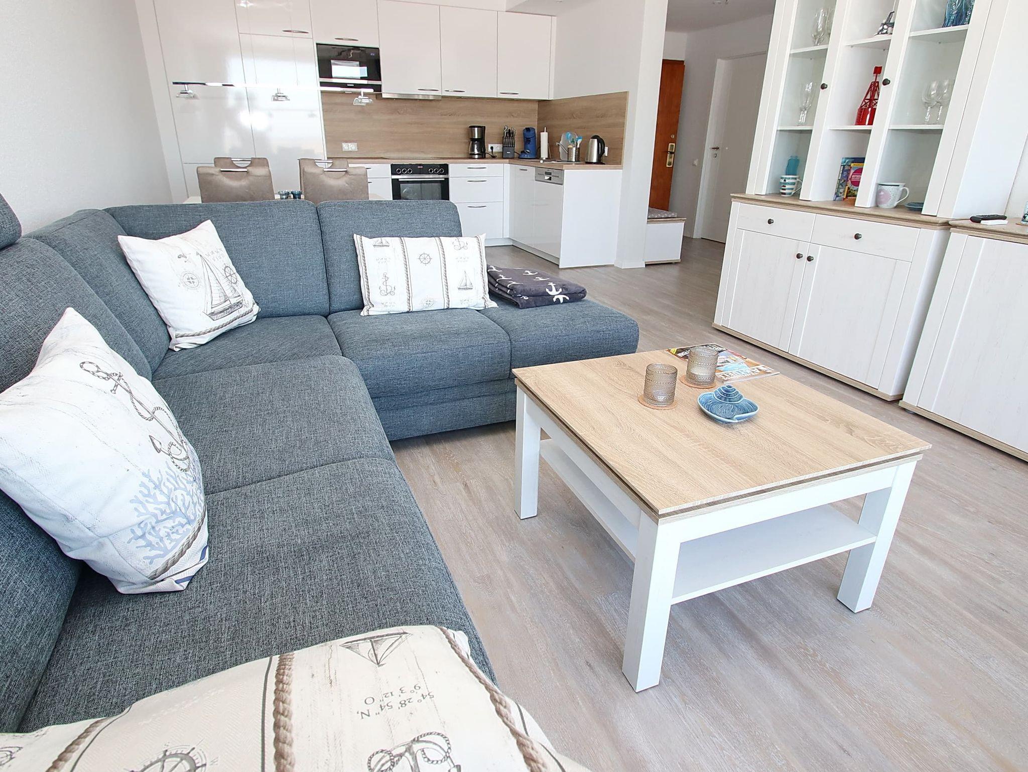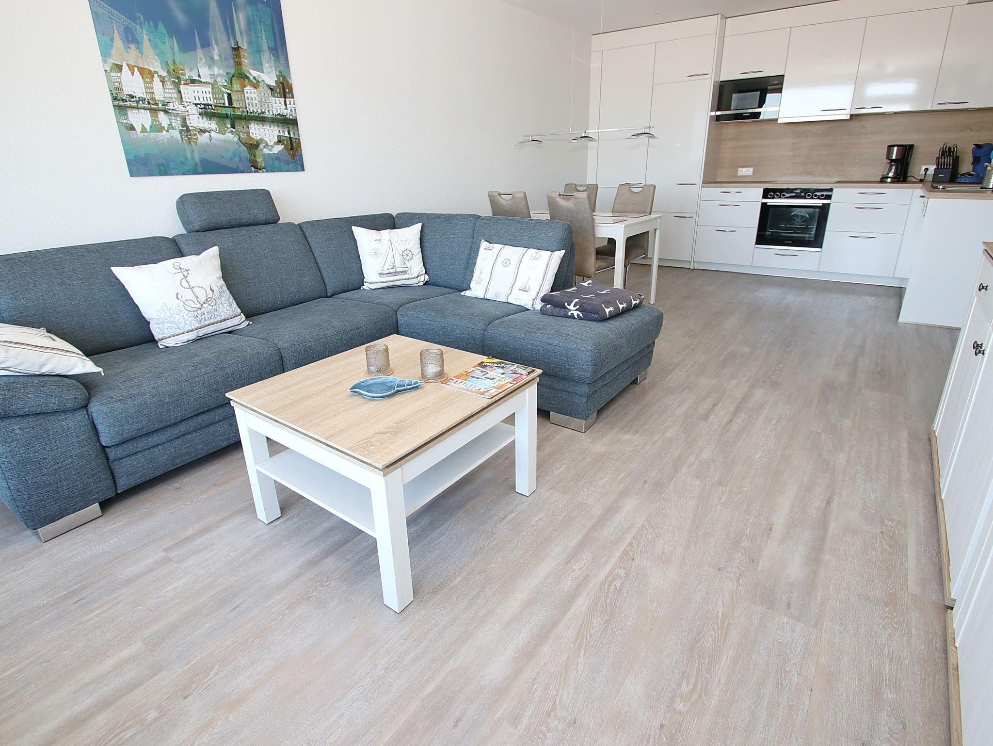 Direkt am Strand erwartet Sie hier ein modernes, im maritimen Stil möbliertes 2-Zimmer-Appartement mit allem Komfort zum Wohlfühlen. Im Wohnraum befinden sich eine gemütliche Eckcouch mit einem Couchtisch sowie ein Esstisch mit vier Stühlen. Dank der gut ausgestatteten Küchenzeile, die sich ebenfalls im Wohnraum befindet, können Sie entscheiden, ob Sie selber kochen oder sich durch die kulinarische Küche Travemündes schlemmen möchten. Im Schlafzimmer stehen ein bequemes Doppelbett (2x 90 cm x 200 cm) und ein Kleiderschrank. Das Duschbad, das Sie vom Flur erreichen, ist in warmen Farben gehalten. Die sehr geschmackvoll eingerichtete Wohneinheit lässt keine Wünsche offen und lädt zu einem wunderschönen Urlaub an der Ostsee ein. Den großen Balkon erreichen Sie von beiden Zimmern. Hier genießen Sie einen fantastischen Blick auf den Strand und die Lübecker Bucht.