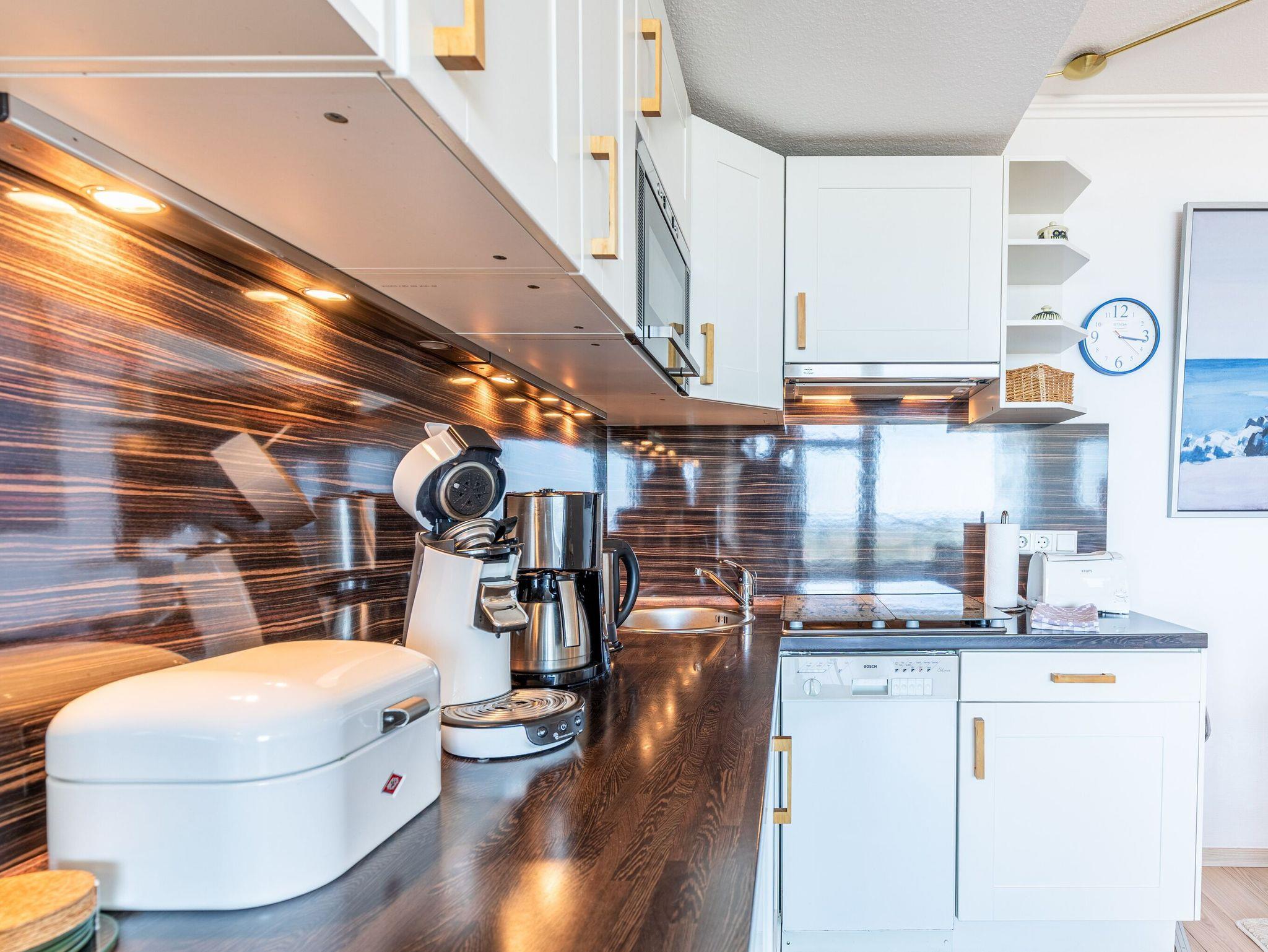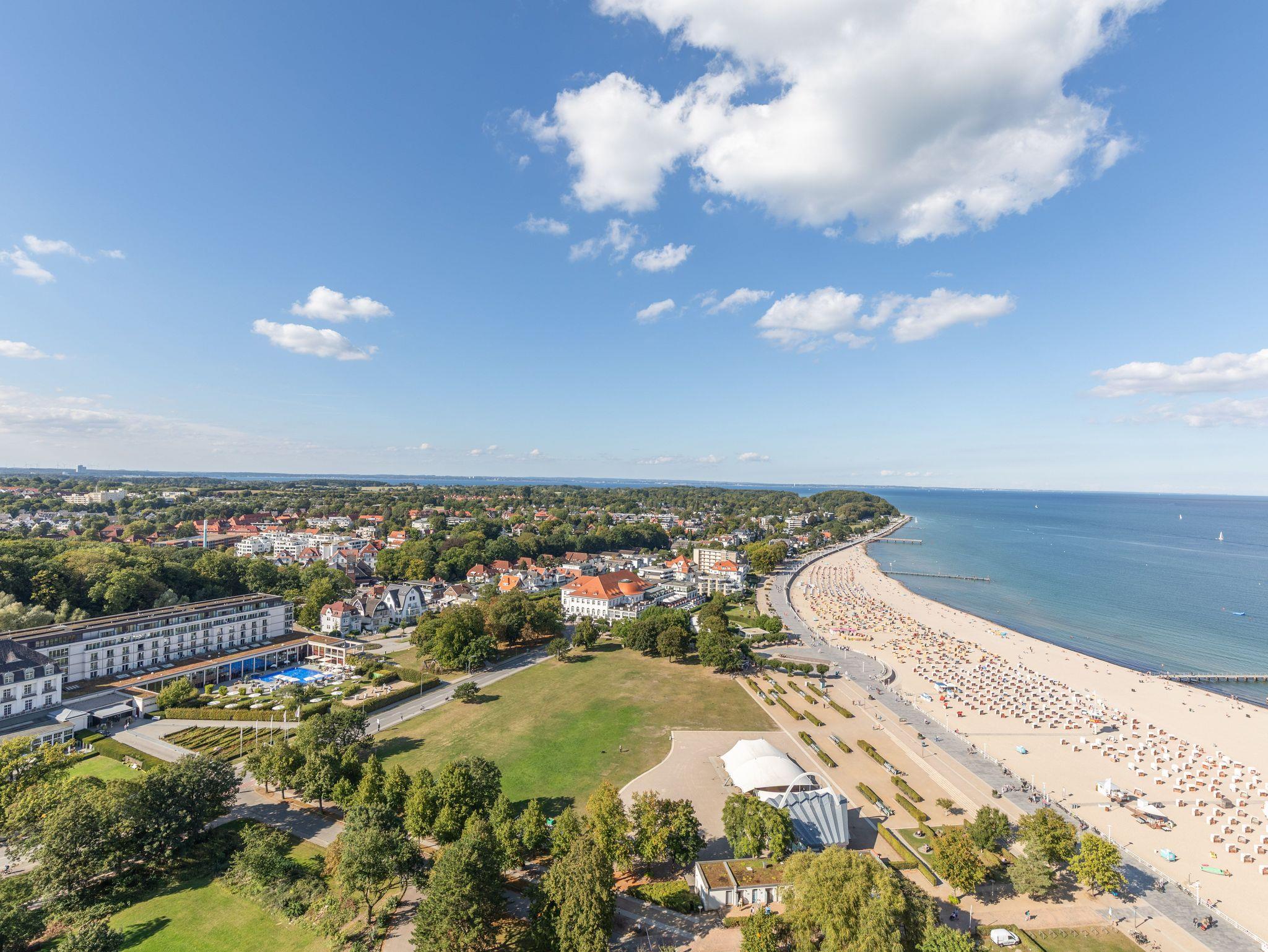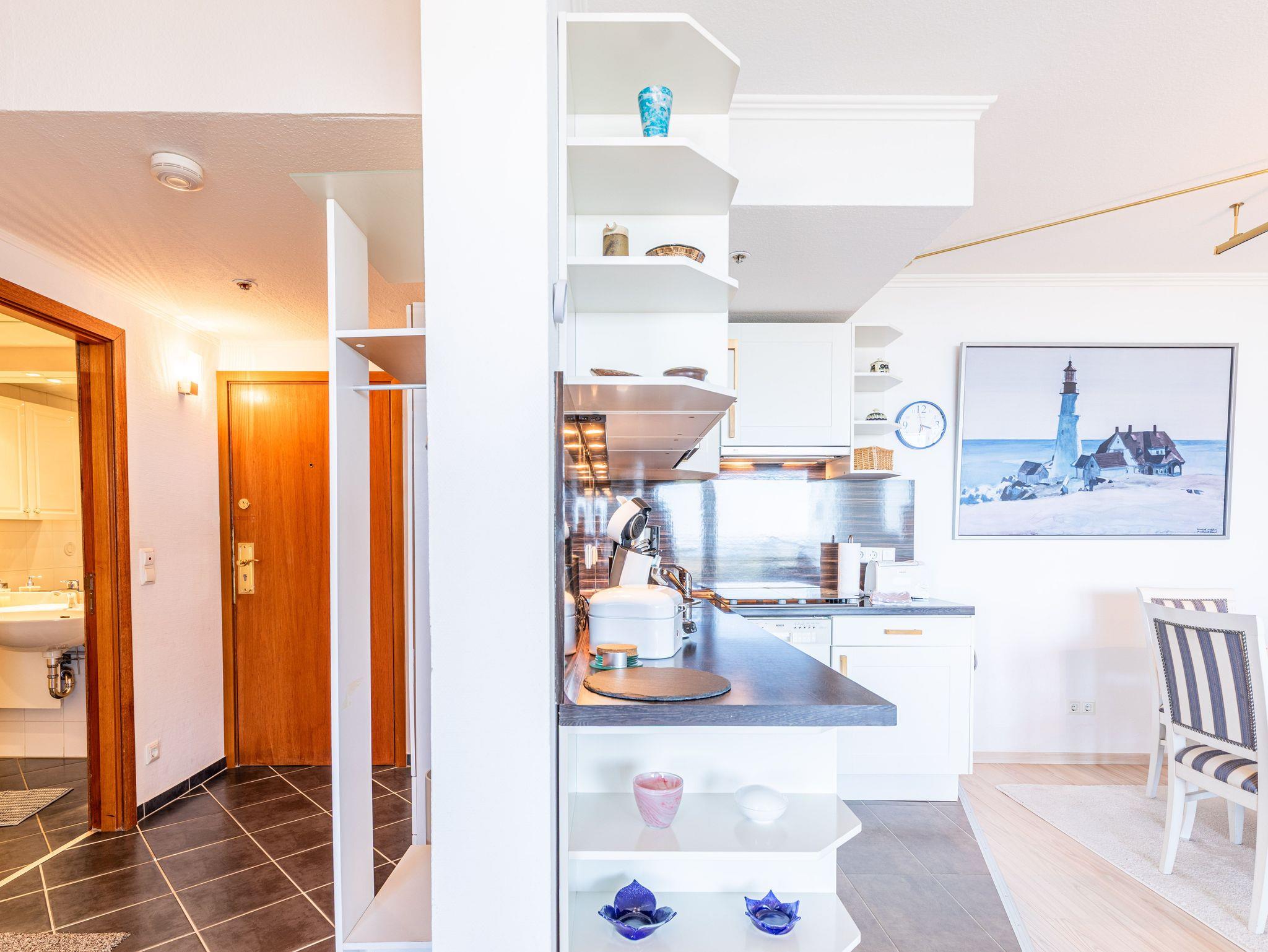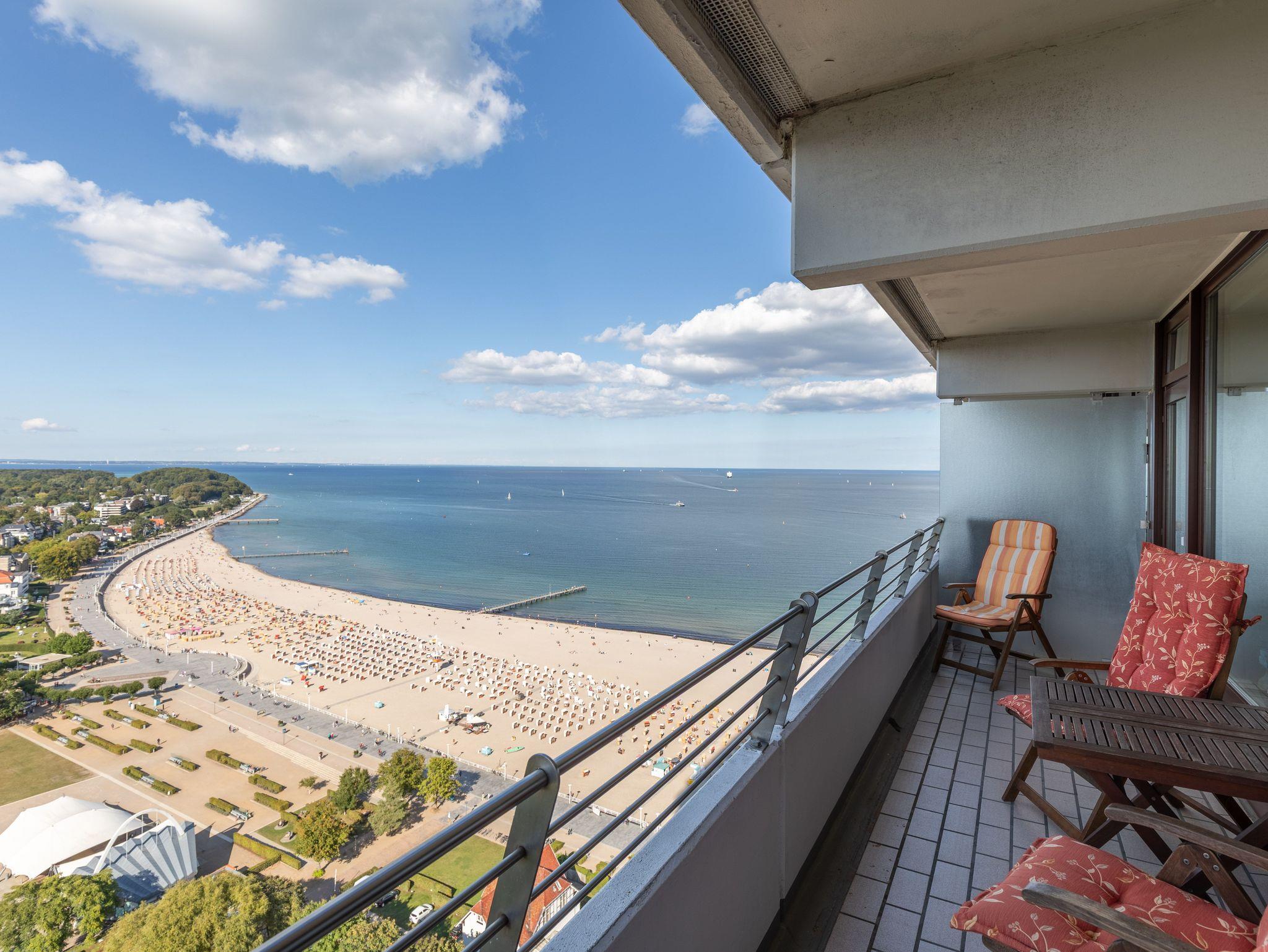Direkt am Strand erwartet Sie hier ein modernes, im maritimen Stil möbliertes 2-Zimmer-Appartement mit allem Komfort zum Wohlfühlen. Im Wohnraum befinden sich ein gemütlicher Dreisitzer und ein Sessel mit einem Couchtisch sowie ein Esstisch mit vier Stühlen. Dank der gut ausgestatteten Küchenzeile, die sich ebenfalls im Wohnraum befindet, können Sie entscheiden, ob Sie selber kochen oder sich durch die kulinarische Küche Travemündes schlemmen möchten. Im Schlafzimmer stehen ein bequemes Doppelbett (180cm x 200 cm) und ein Kleiderschrank.In der Wohnzimmernische befindet sich eine Sitz-/Schlafcouch (140 cm x 200 cm). Das Duschbad, das Sie vom Flur erreichen, ist in warmen Farben gehalten. Die sehr geschmackvoll eingerichtete Wohneinheit lässt keine Wünsche offen und lädt zu einem wunderschönen Urlaub an der Ostsee ein. Den großen Balkon erreichen Sie von beiden Zimmern. Hier genießen Sie einen fantastischen Blick auf den Strand und die Lübecker Bucht.
