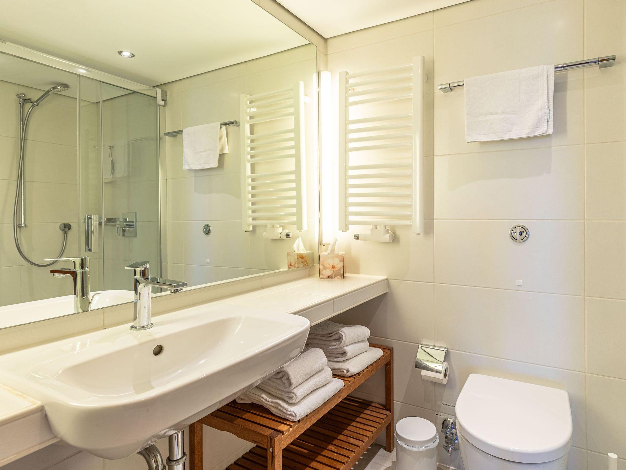 Wellnessangebote wie Schwimmbad, Sauna, Beauty sowie Restaurants und Cafés sind im Haus.