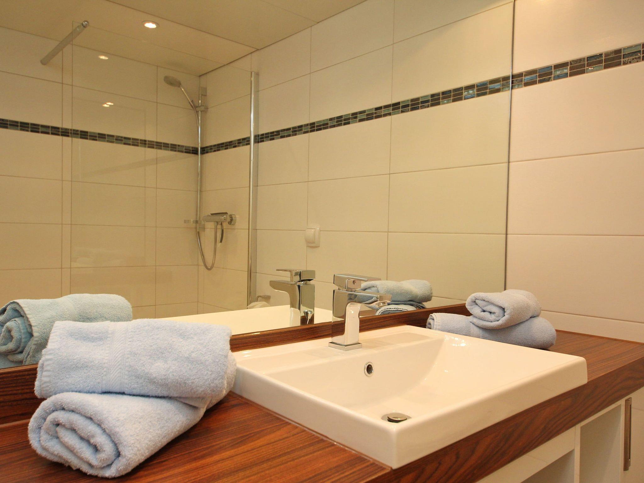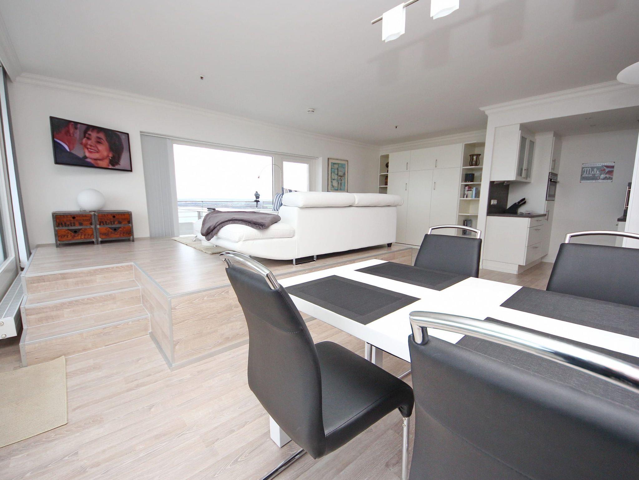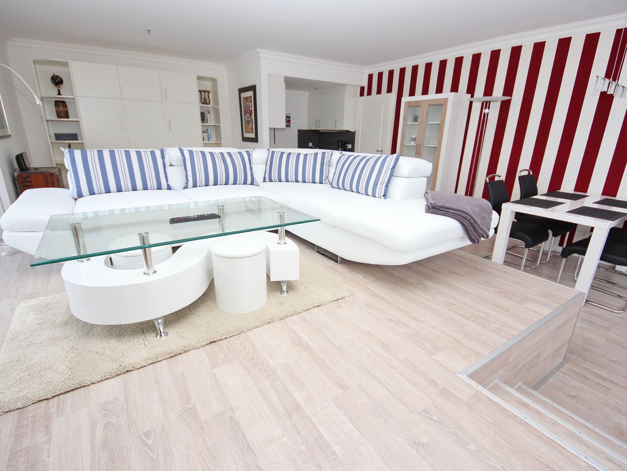 Umlaufende Loggia von ca. 26 m², Küche, Geschirrspüler, Mikrowelle, Duschbad/WC, Fön, 2x TV, Stereoanlage, kostenl. W-Lan, Aufzug, inkl. Tiefgaragenstellplatz (Einfahrtshöhe: 1,85 m).