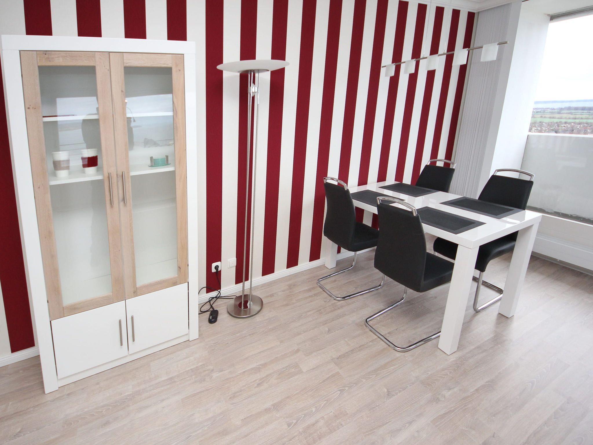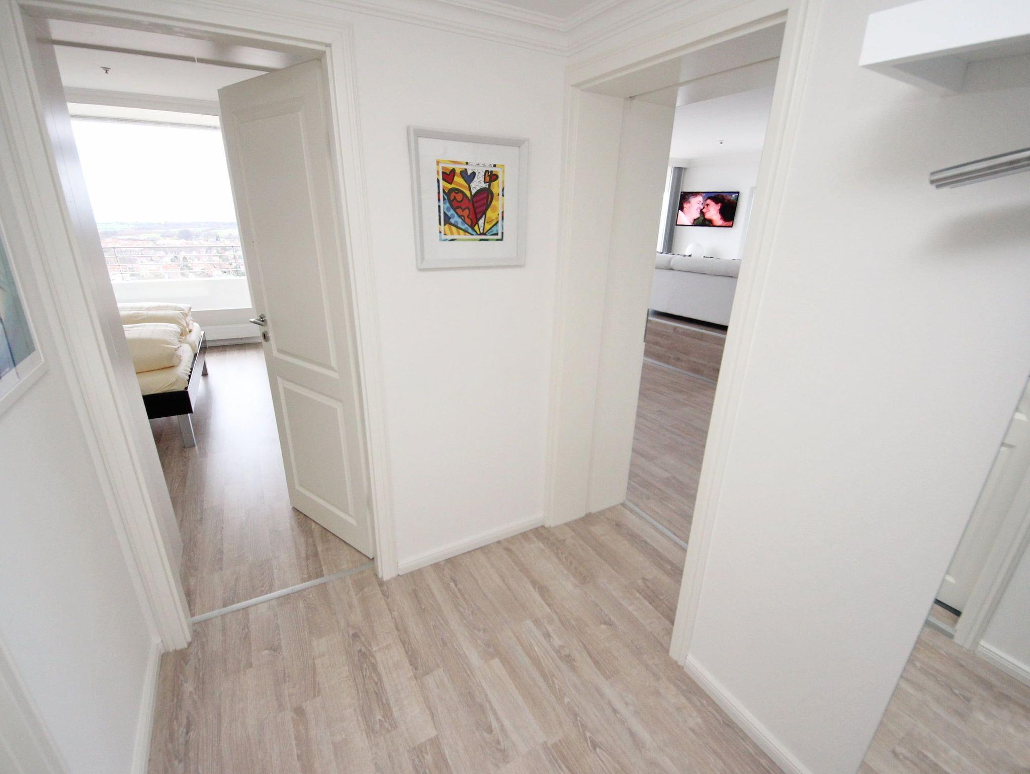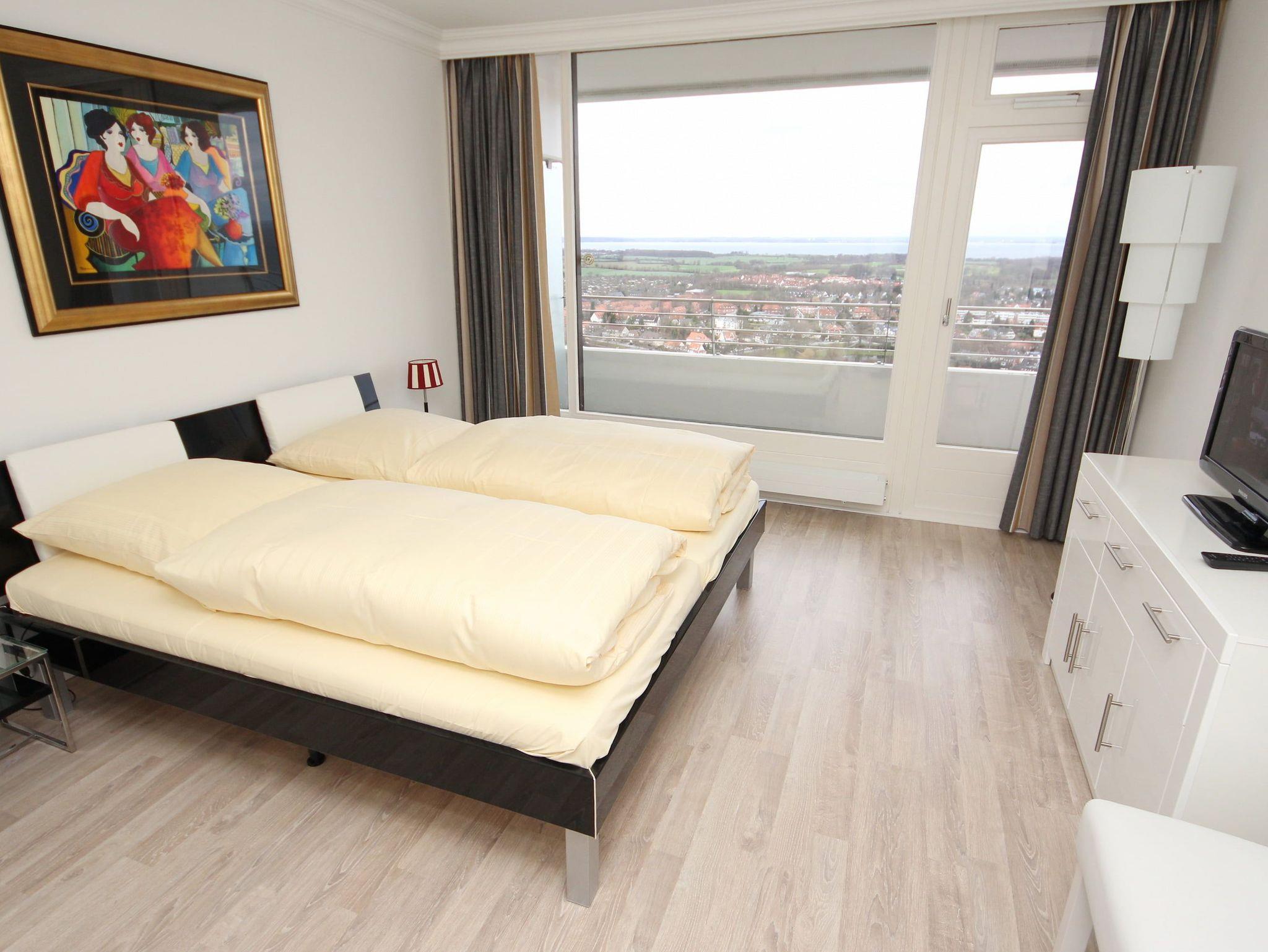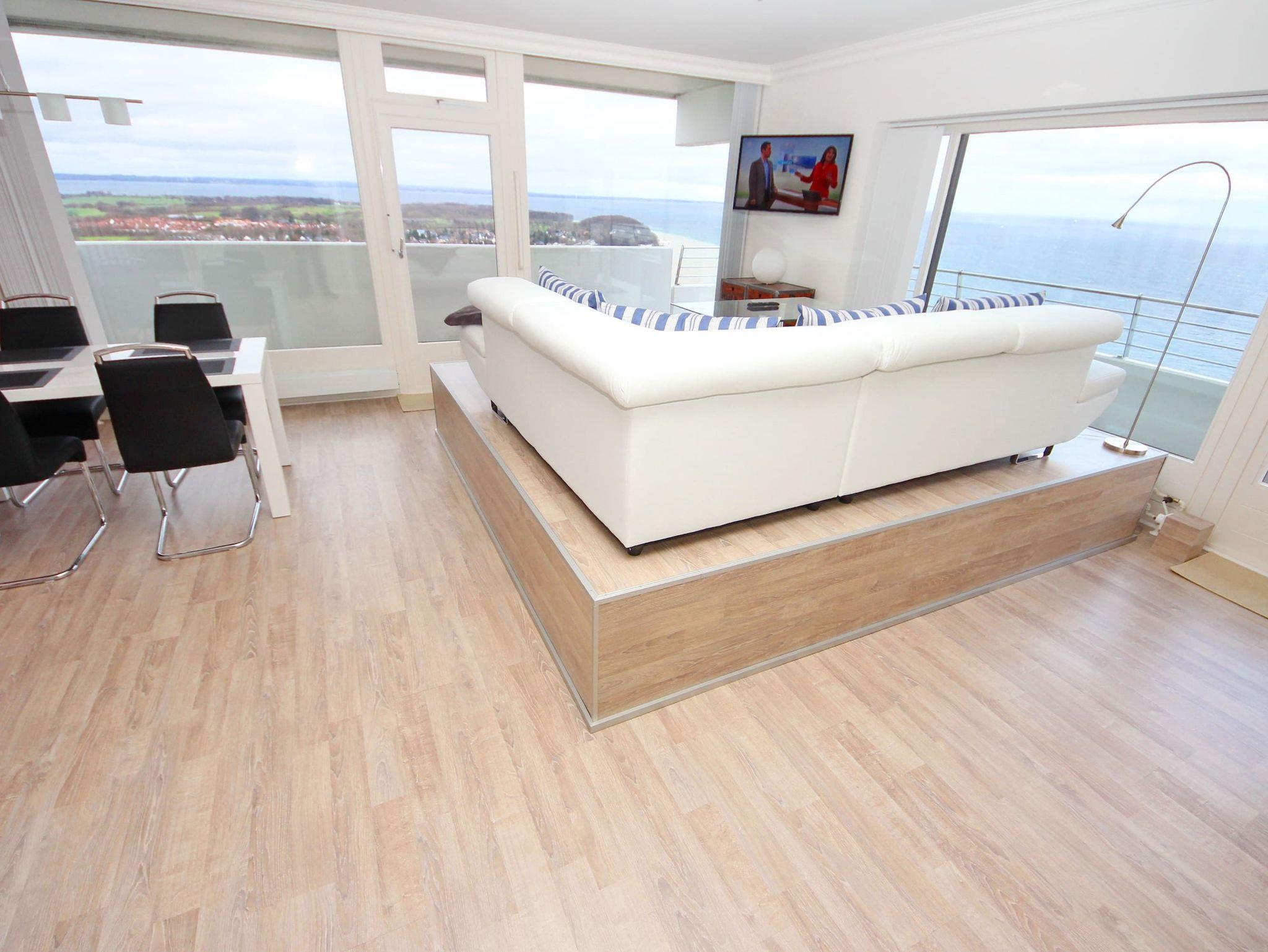 Es erwartet Sie ein elegantes Appartement mit vielen Extras. Diese exklusive Traumwohnung über den Wolken gehört zur absoluten Spitzenklasse, in der der Wohlfühlcharakter garantiert ist. Der großzügige, helle Wohnraum hat eine moderne, offene Einbauküche. Die weitere Einrichtung besteht aus einer hochwertigen Eckcouch mit Tisch auf einer Empore, einer schönen Essecke, einem schicken Glasvitrinen Schrank sowie einem hochwertigen Nehl-Doppelschrankbett (2x 80 cm x 200 cm). Im Schlafzimmer befinden sich ein großes, bequemes Doppelbett (2x 90 cm x 200 cm), ein Sideboard und ein großzügiger Einbaukleiderschrank. Das luxuriöse Duschbad erreichen Sie vom Flur. Beide Wohnräume sind hell und freundlich und haben einen Zugang zum großen Eckbalkon. Hier genießen Sie einen uneingeschränkten Panoramablick direkt auf die Ostsee und zur Lübecker Bucht mit lebhaftem Schiffsverkehr.