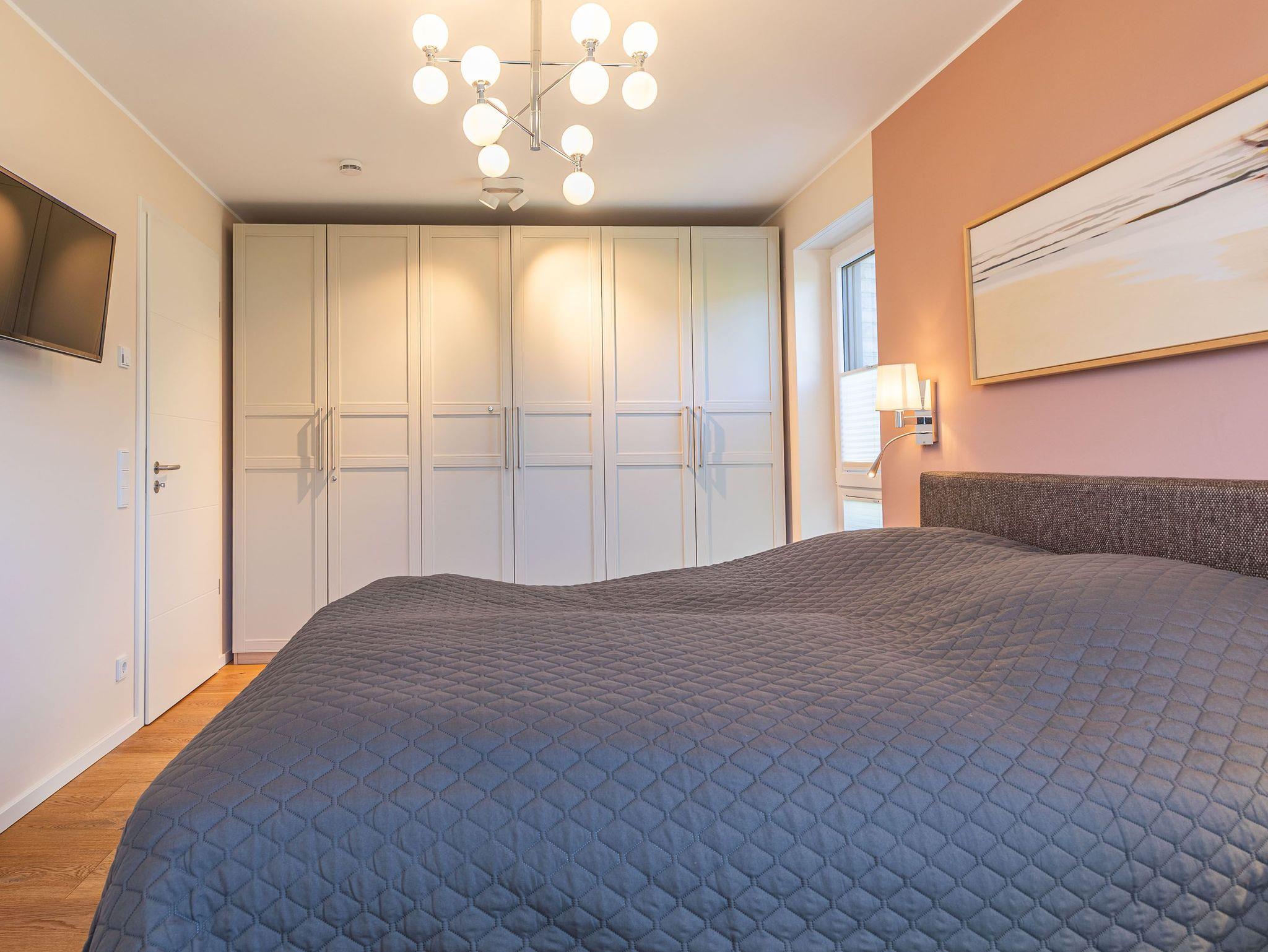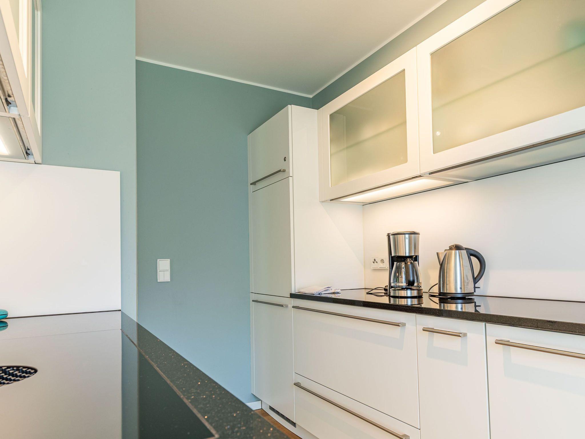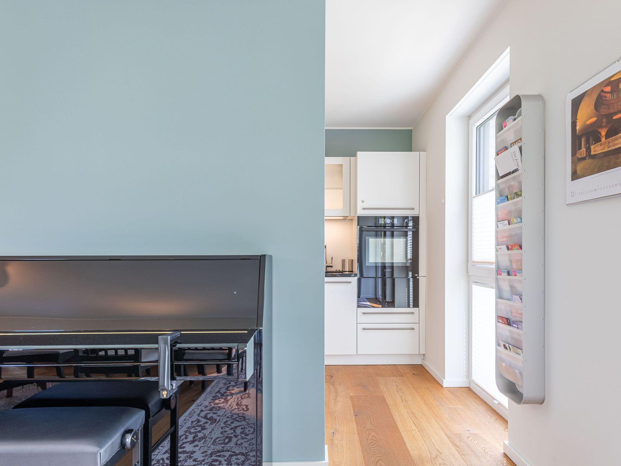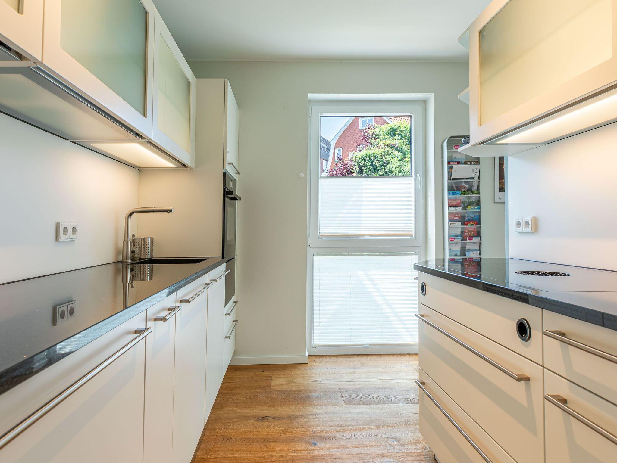Zwei Balkone, elektr. Außenjalousien, Küche, Geschirrspüler, Mikrowelle, 2x Duschbad/WC, Fön, 3x TV, Stereoanlage mit Bluetooth, kostenl. W-Lan, Klavier (gegen Gebühr), Aufzug, Fahrradkeller, inkl. Tiefgaragenstellplatz (Einfahrtshöhe: 1,85 m).