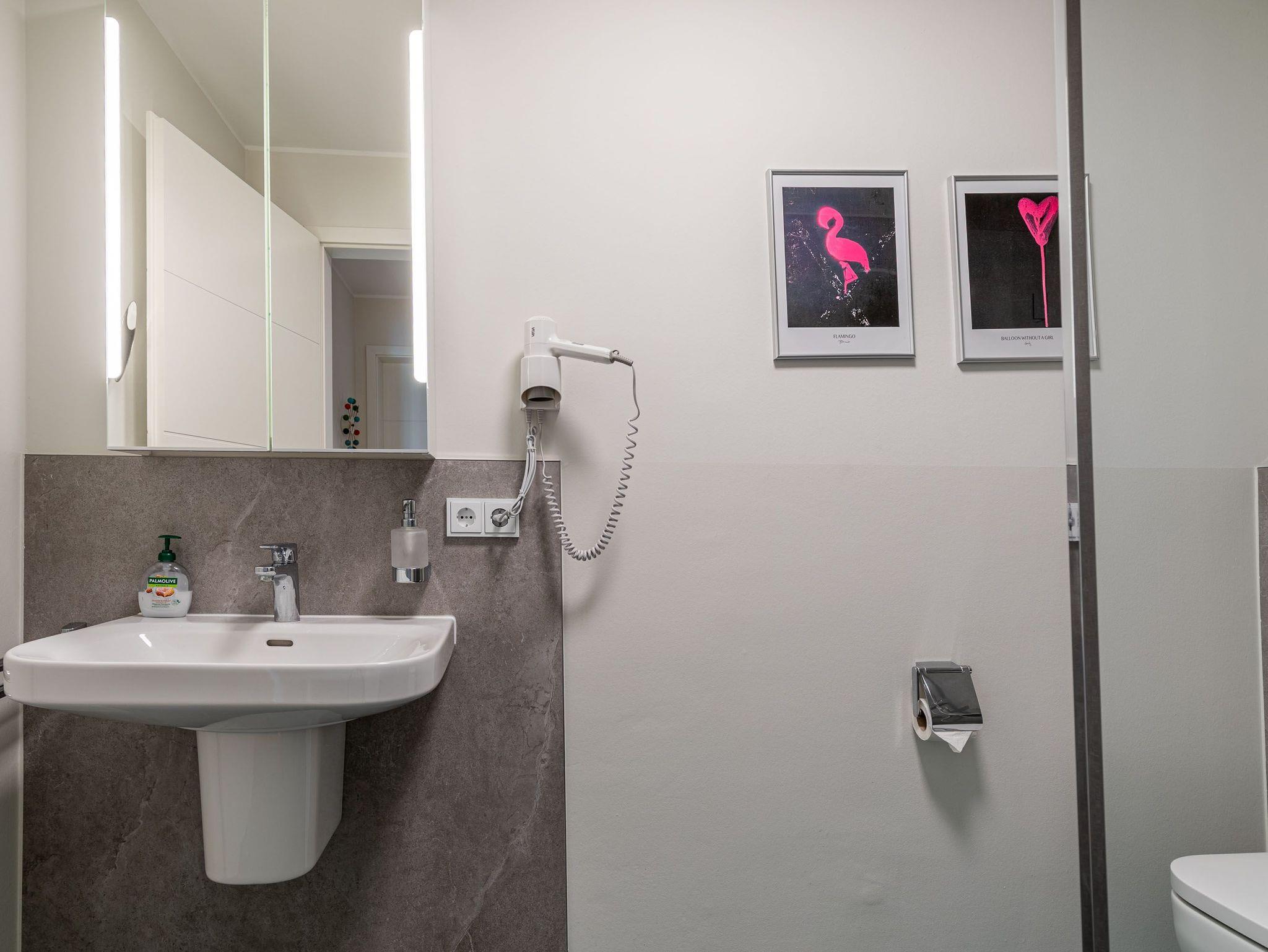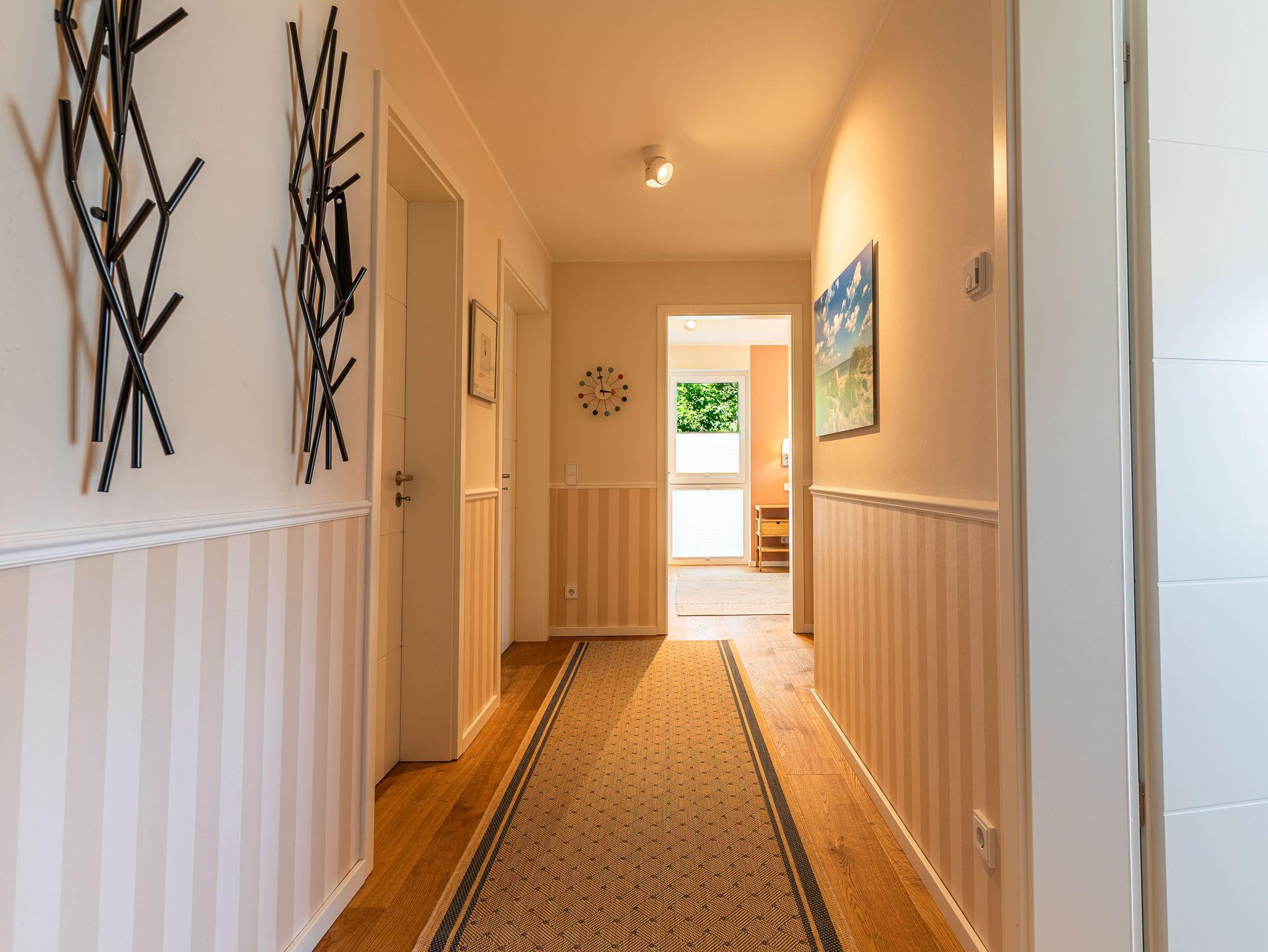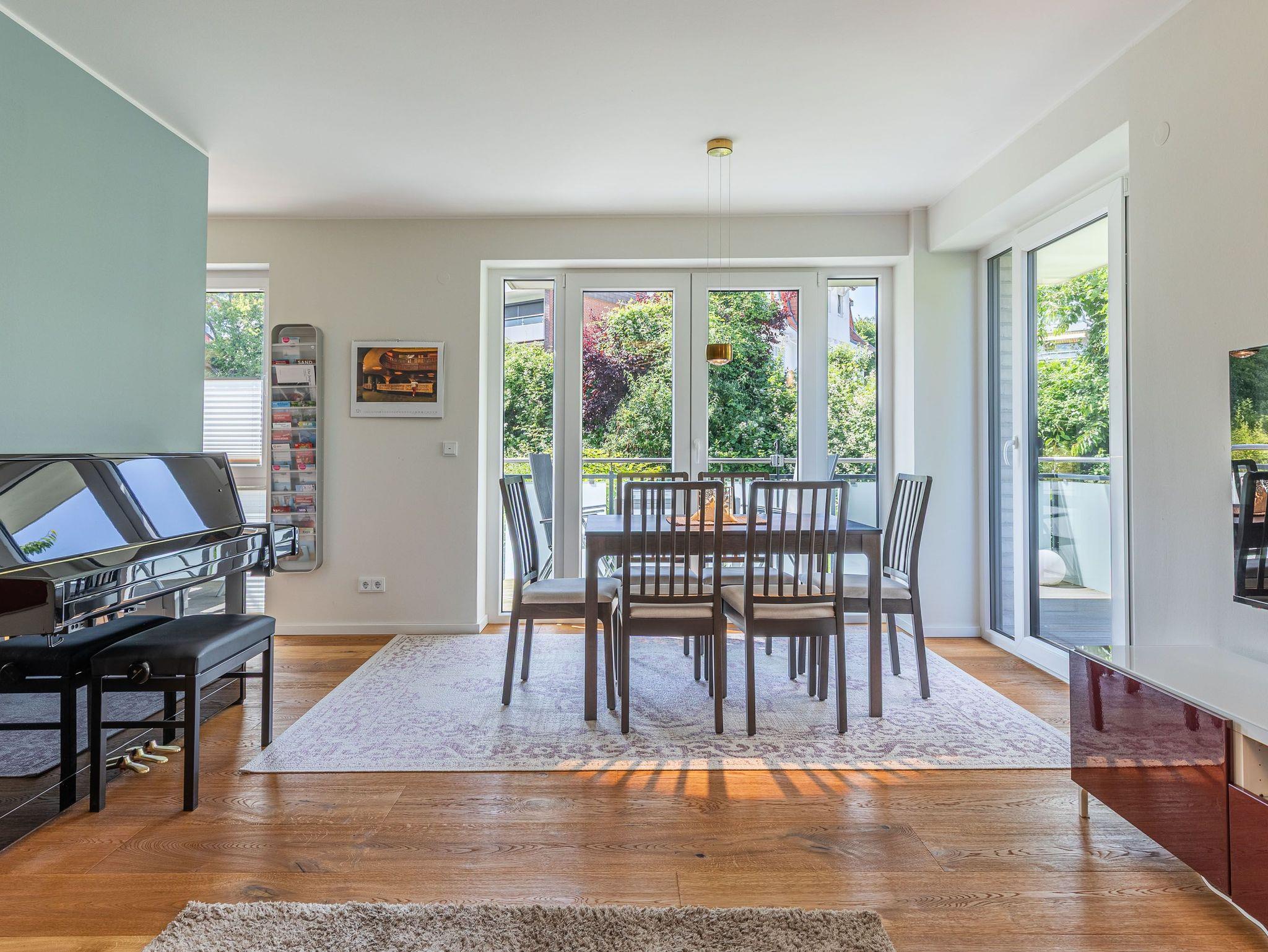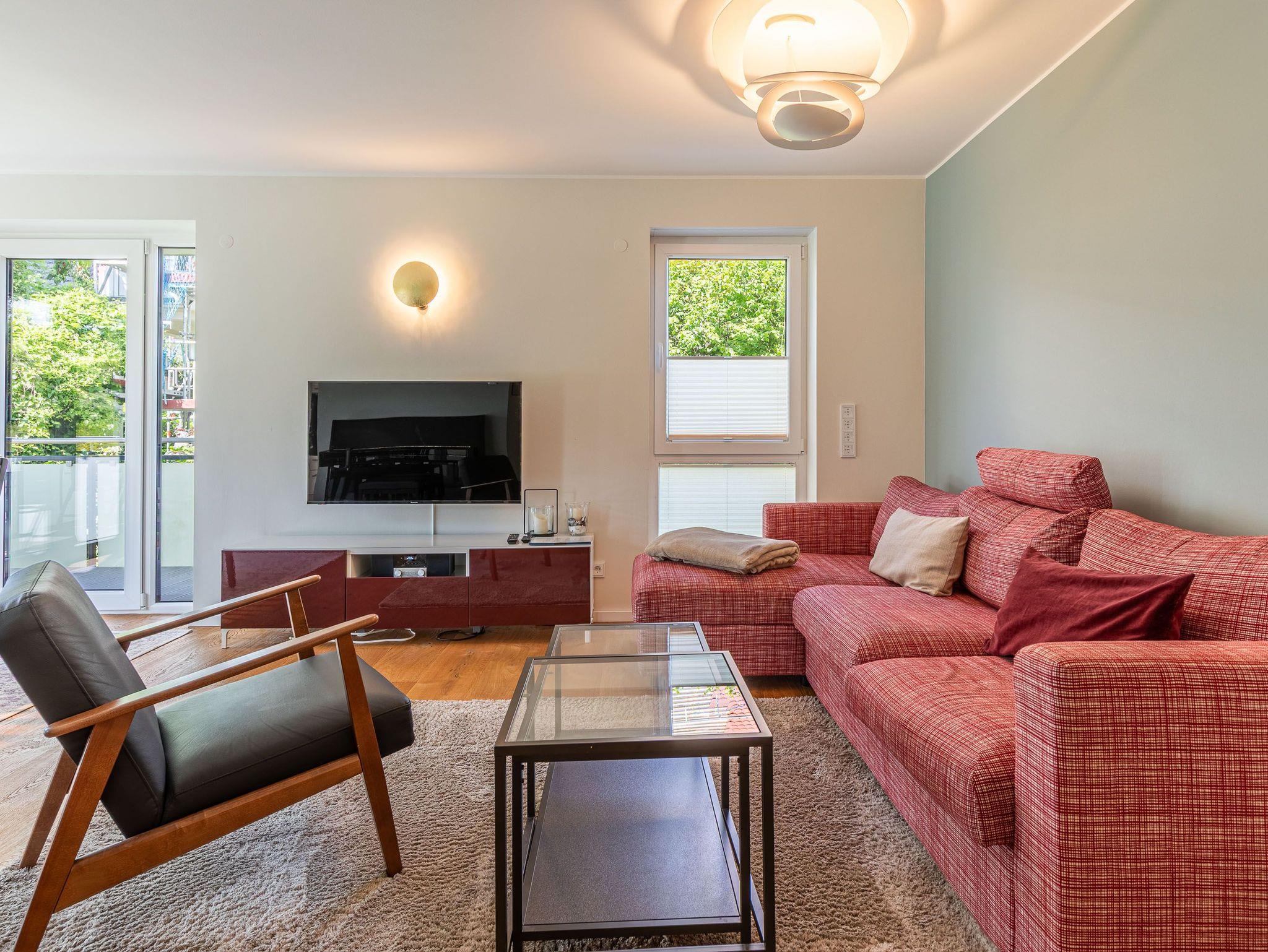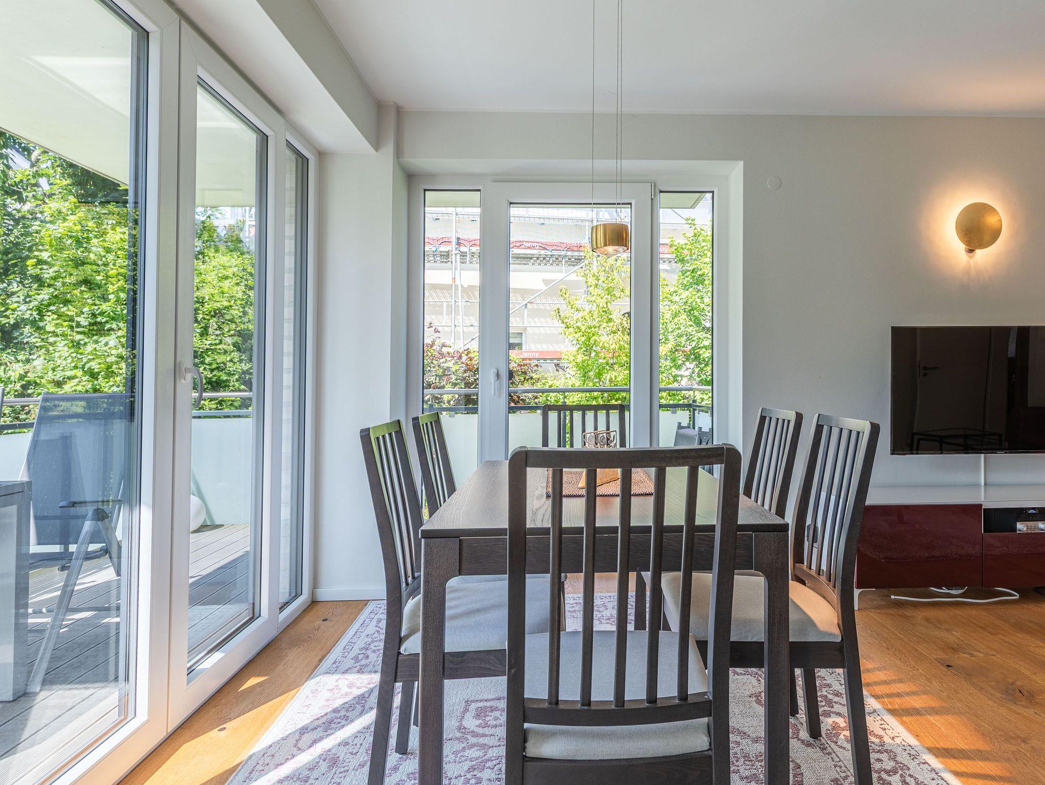 Zwei Balkone, elektr. Außenjalousien, Küche, Geschirrspüler, Mikrowelle, 2x Duschbad/WC, Fön, 3x TV, Stereoanlage mit Bluetooth, kostenl. W-Lan, Klavier (gegen Gebühr), Aufzug, Fahrradkeller, inkl. Tiefgaragenstellplatz (Einfahrtshöhe: 1,85 m).
