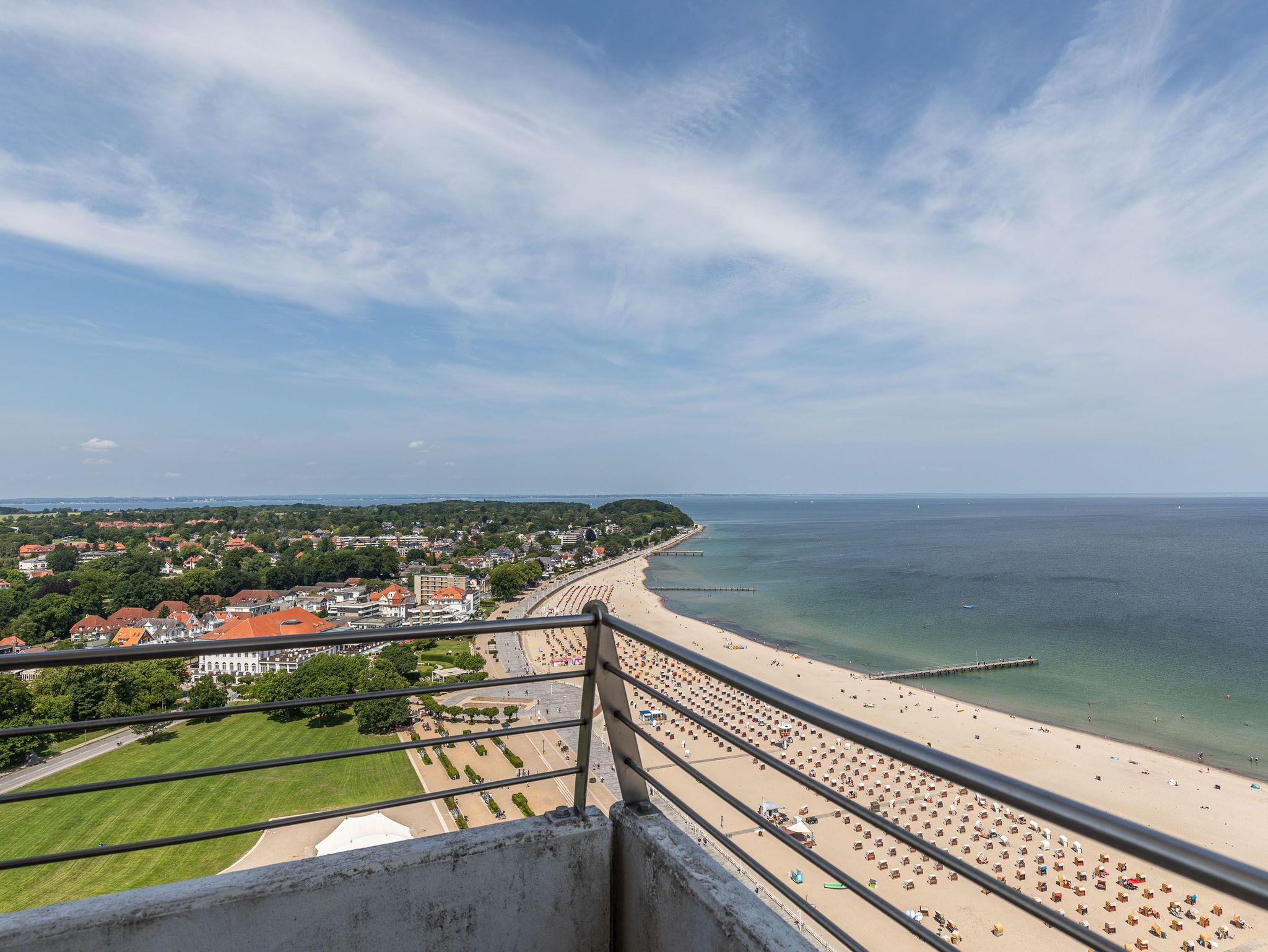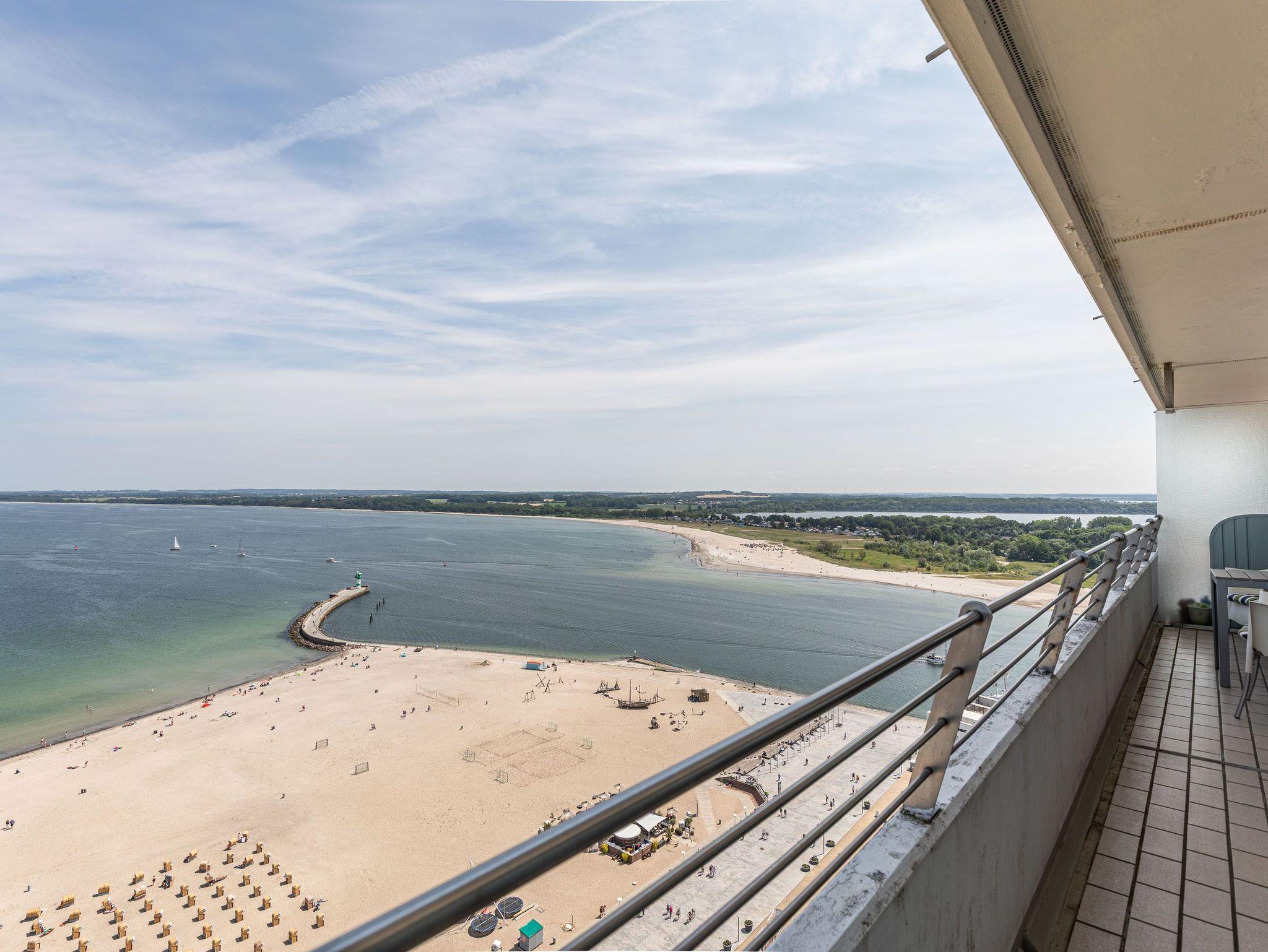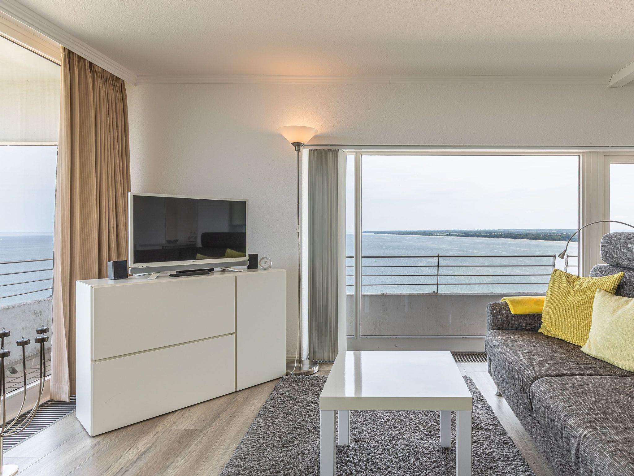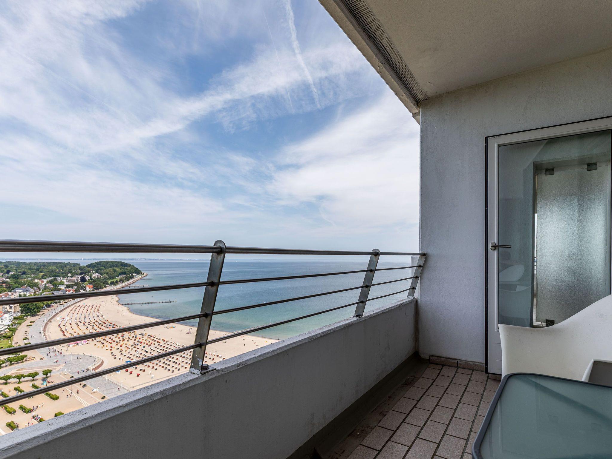 Dieses exzellente, hell eingerichtete Appartement gehört zur absoluten Spitzenklasse. Der erhöhte Podest im Wohnraum ermöglicht Ihnen von der bequemen Sitz-/Schlafcouch (55 cm x 200 cm) sowie von der Essecke einen herrlichen Meerblick. Des Weiteren befindet sich im Wohnraum eine schöne Schrankwand mit einem integrierten Einzelschrankbett (90 cm x 200 cm). Die moderne Einbauküche mit Tresen lässt die Herzen aller Kochfans höher schlagen. Im Schlafzimmer, abgehend vom Flur, befinden sich ein hochwertiges Boxspringbett (2x 90 cm x 200 cm) und ein Einbaukleiderschrank. Das hochmoderne Bad erreichen Sie vom Flur. Beide Wohnräume sind hell, lichtdurchflutet und haben einen Zugang zum großen Eckbalkon. Hier genießen Sie einen uneingeschränkten Panoramablick direkt auf die Ostsee und zur Lübecker Bucht mit lebhaftem Schiffsverkehr.
