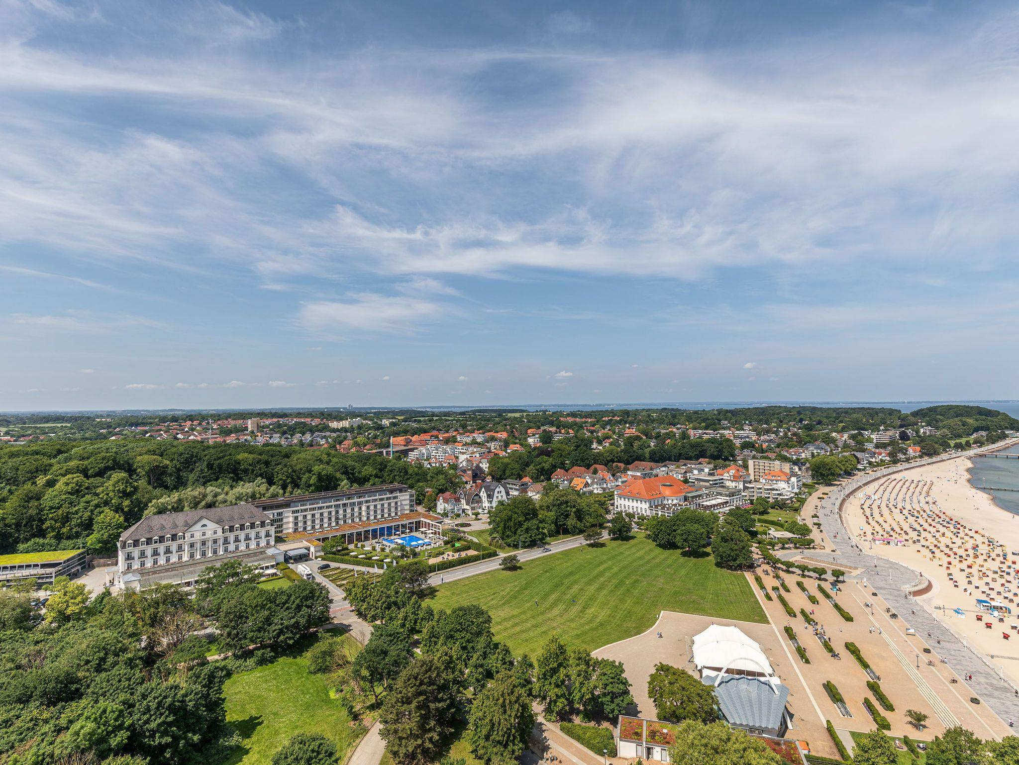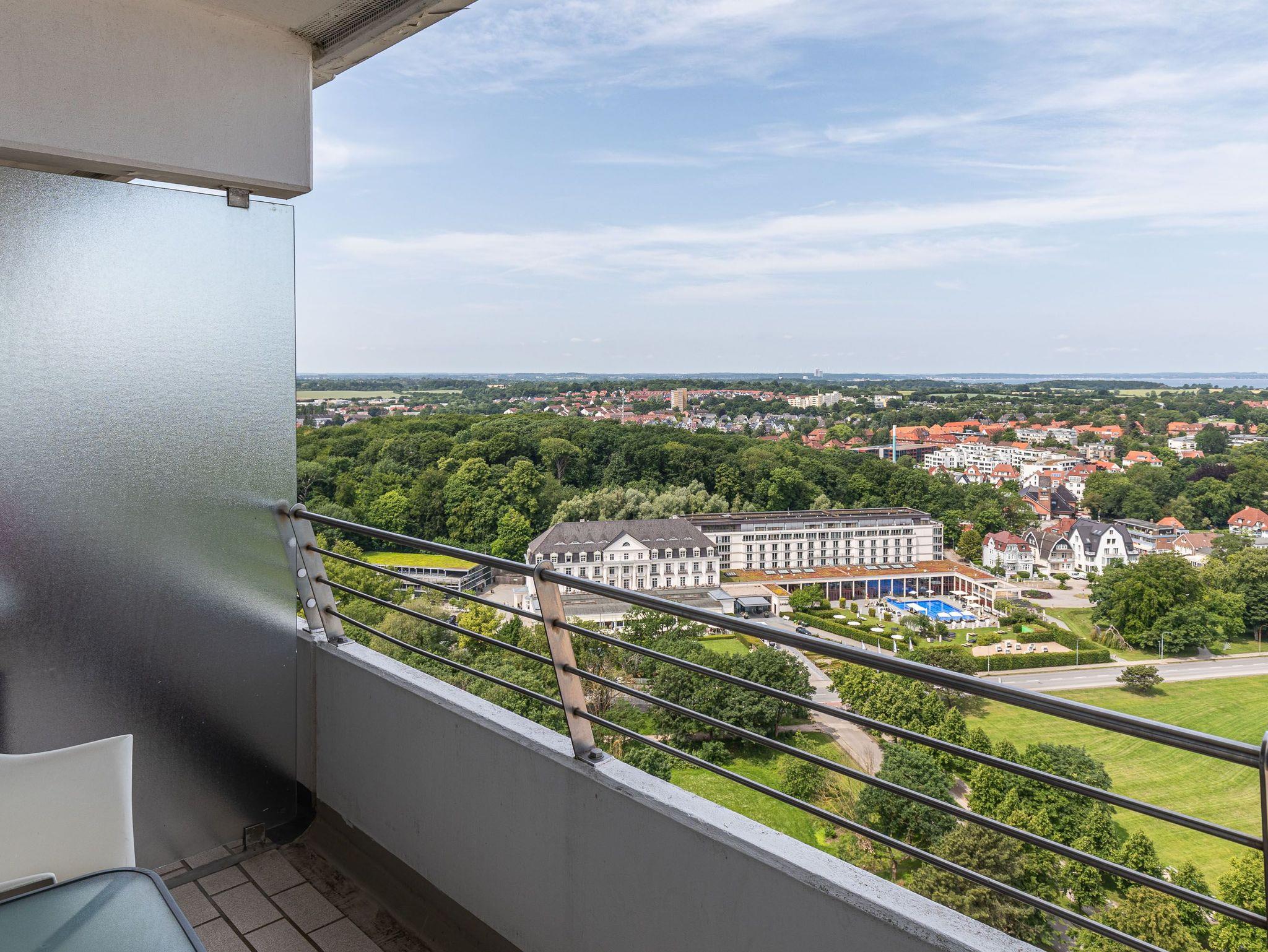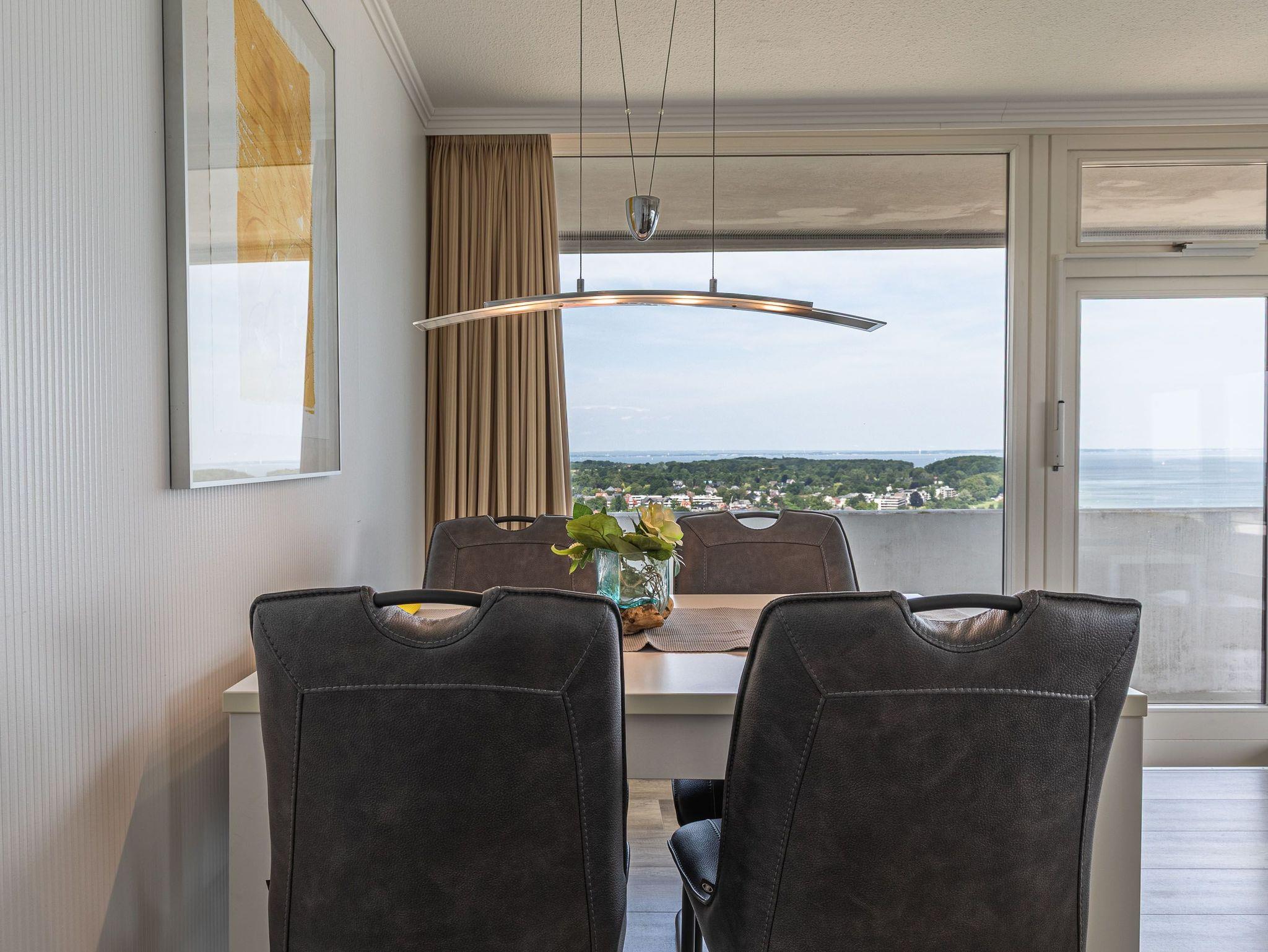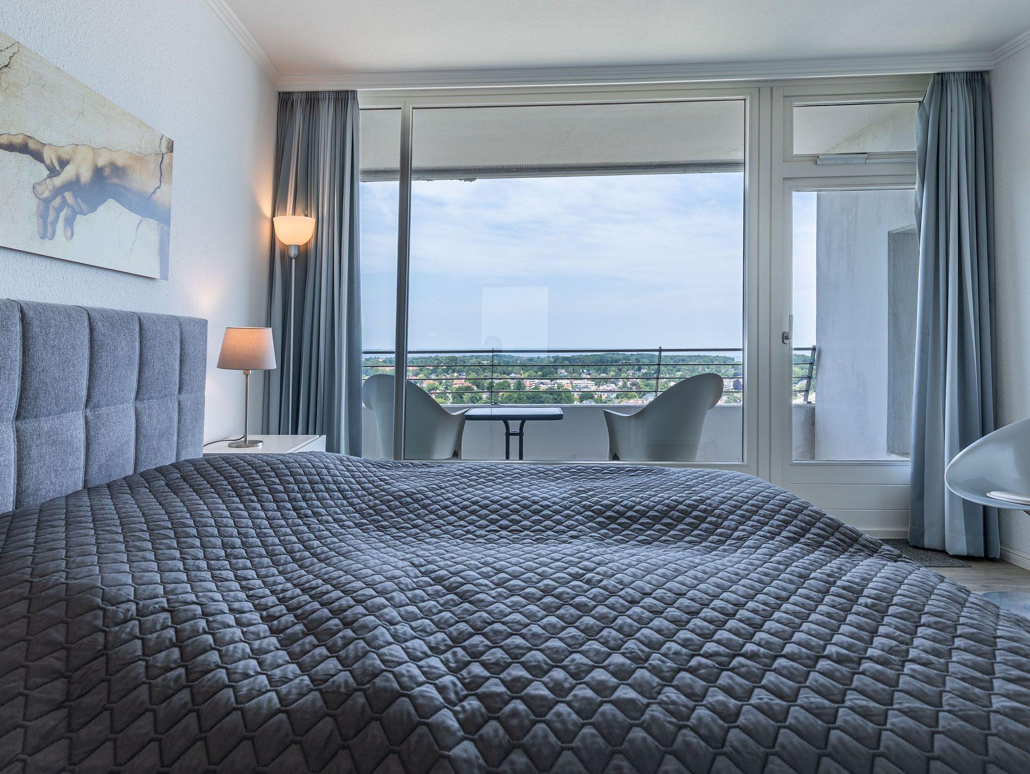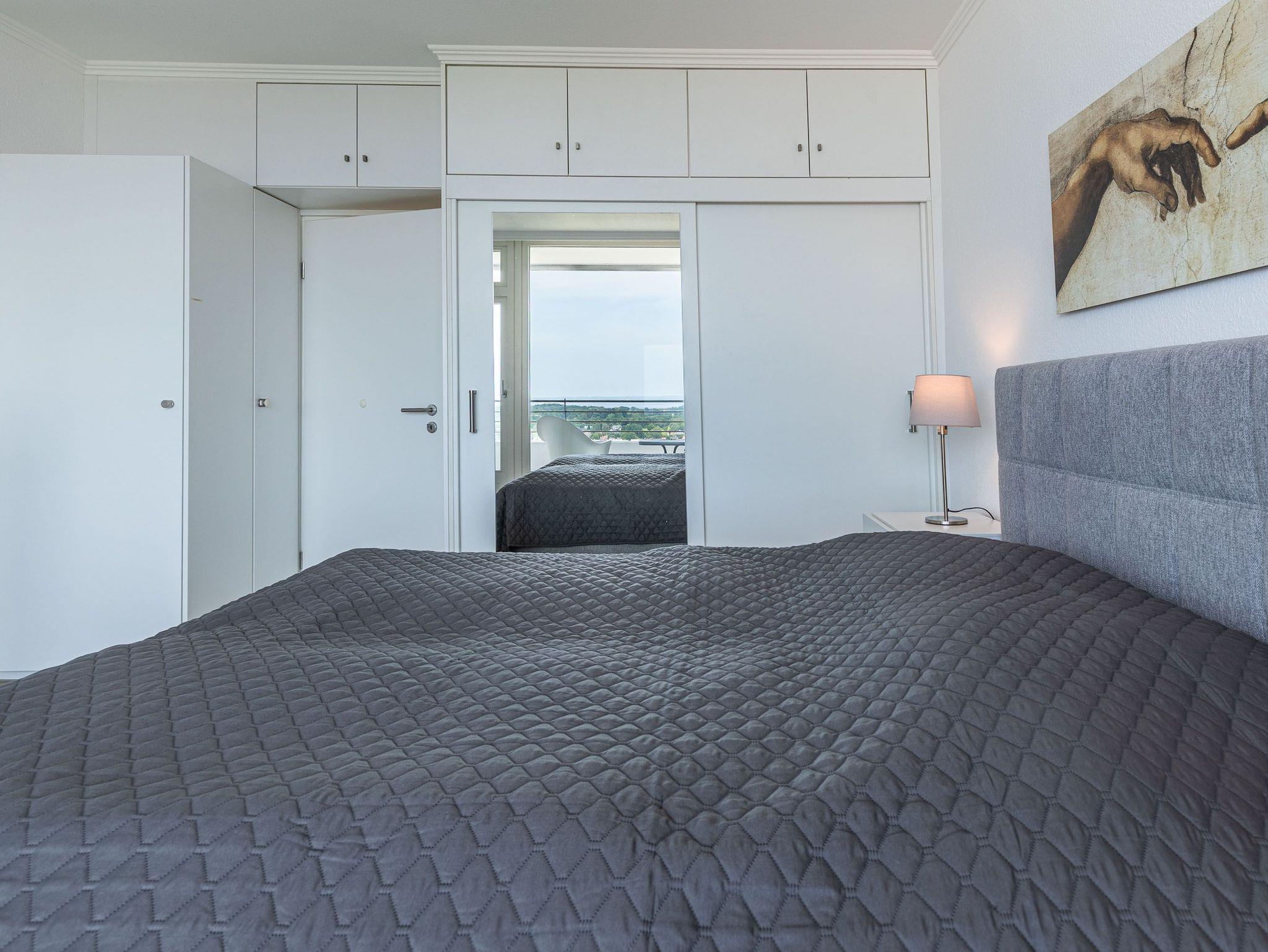 Dieses exzellente, hell eingerichtete Appartement gehört zur absoluten Spitzenklasse. Der erhöhte Podest im Wohnraum ermöglicht Ihnen von der bequemen Sitz-/Schlafcouch (55 cm x 200 cm) sowie von der Essecke einen herrlichen Meerblick. Des Weiteren befindet sich im Wohnraum eine schöne Schrankwand mit einem integrierten Einzelschrankbett (90 cm x 200 cm). Die moderne Einbauküche mit Tresen lässt die Herzen aller Kochfans höher schlagen. Im Schlafzimmer, abgehend vom Flur, befinden sich ein hochwertiges Boxspringbett (2x 90 cm x 200 cm) und ein Einbaukleiderschrank. Das hochmoderne Bad erreichen Sie vom Flur. Beide Wohnräume sind hell, lichtdurchflutet und haben einen Zugang zum großen Eckbalkon. Hier genießen Sie einen uneingeschränkten Panoramablick direkt auf die Ostsee und zur Lübecker Bucht mit lebhaftem Schiffsverkehr.