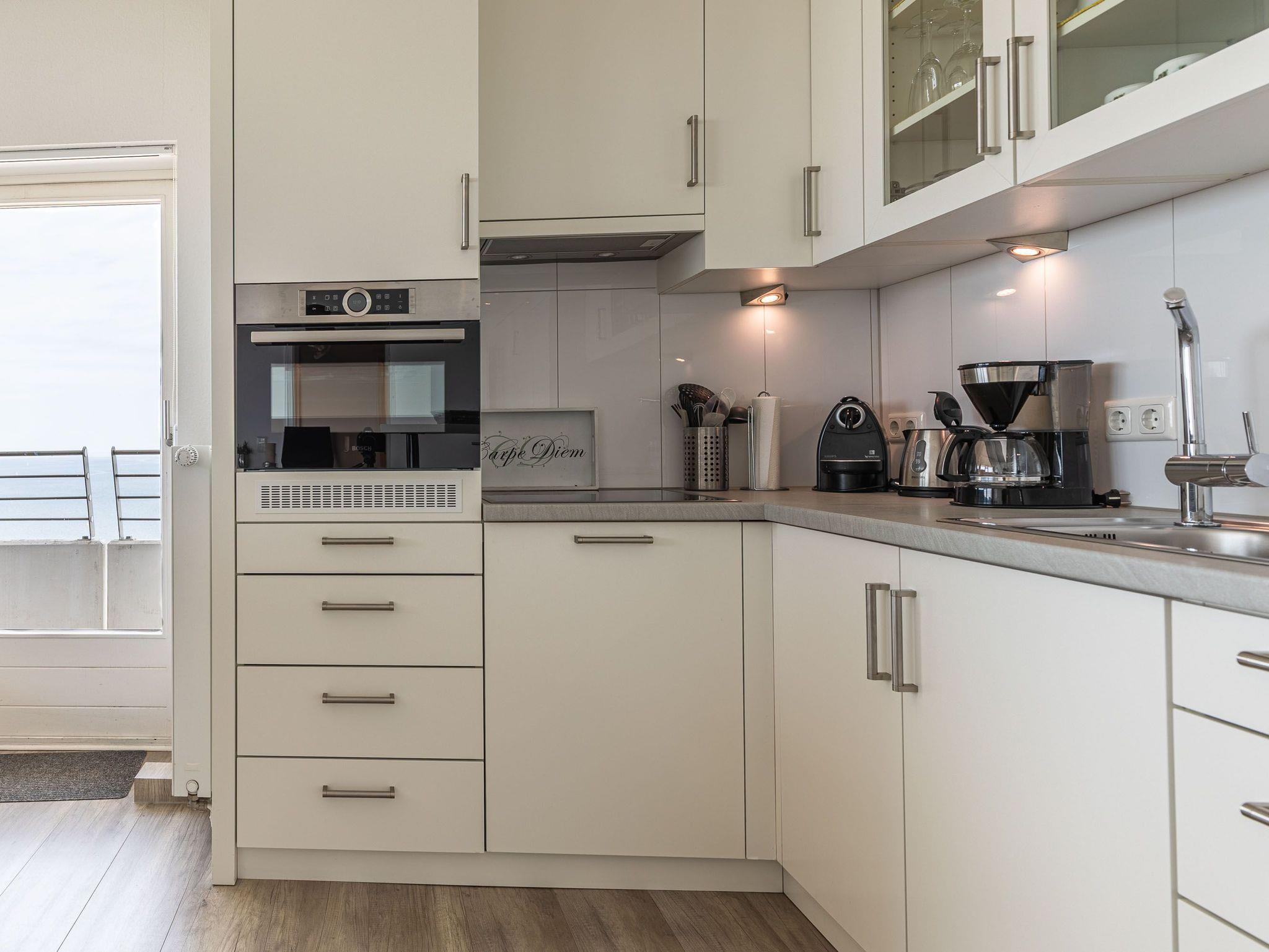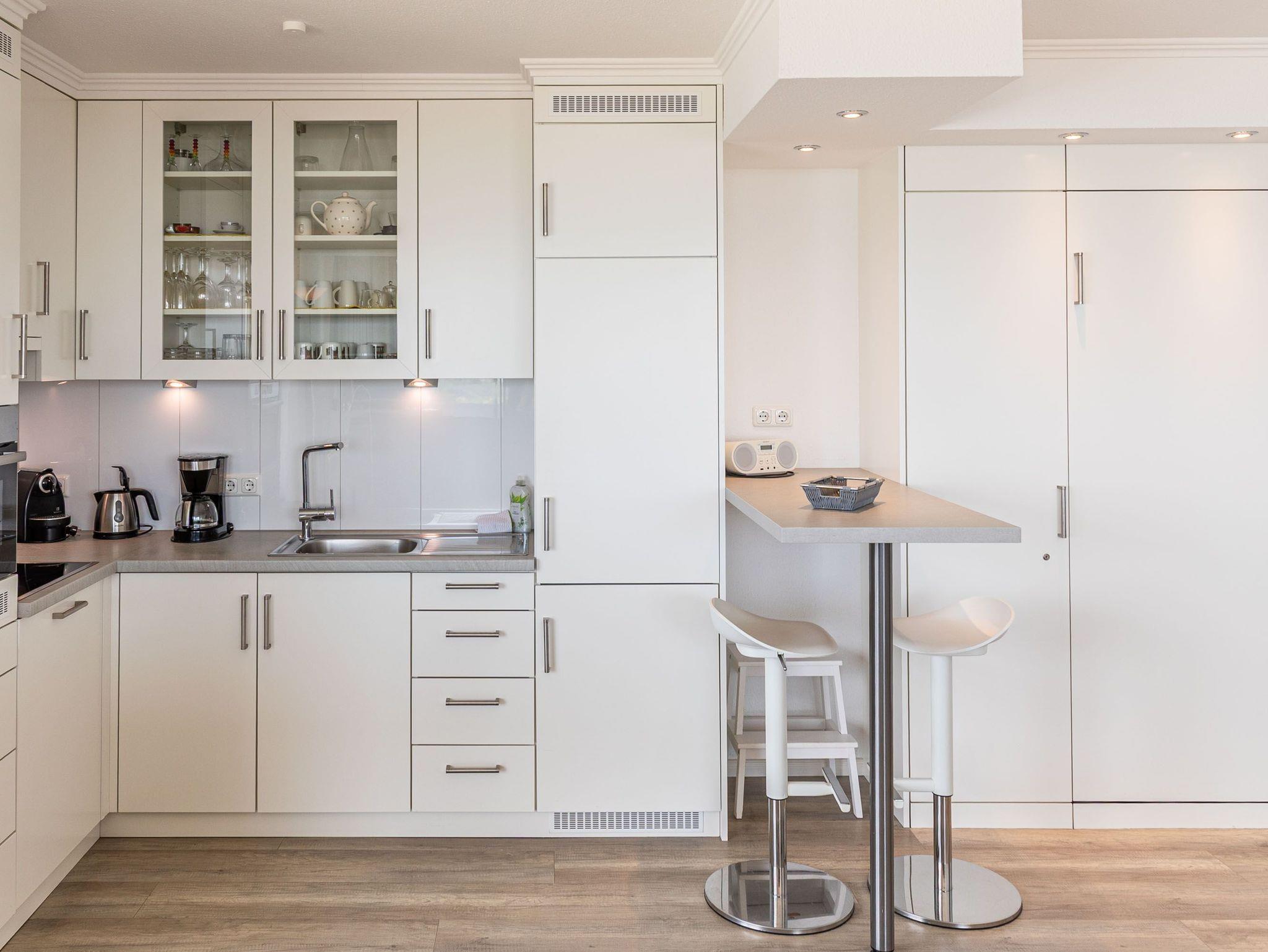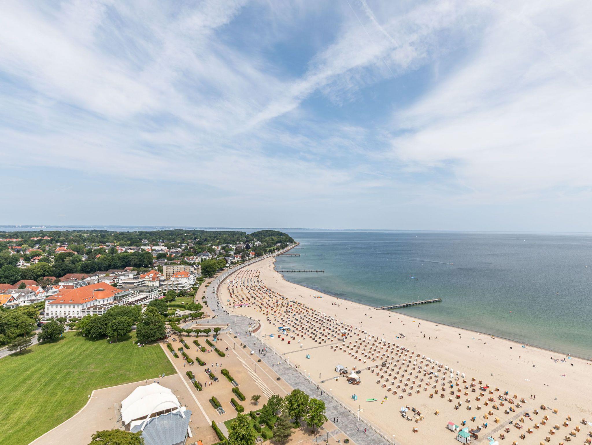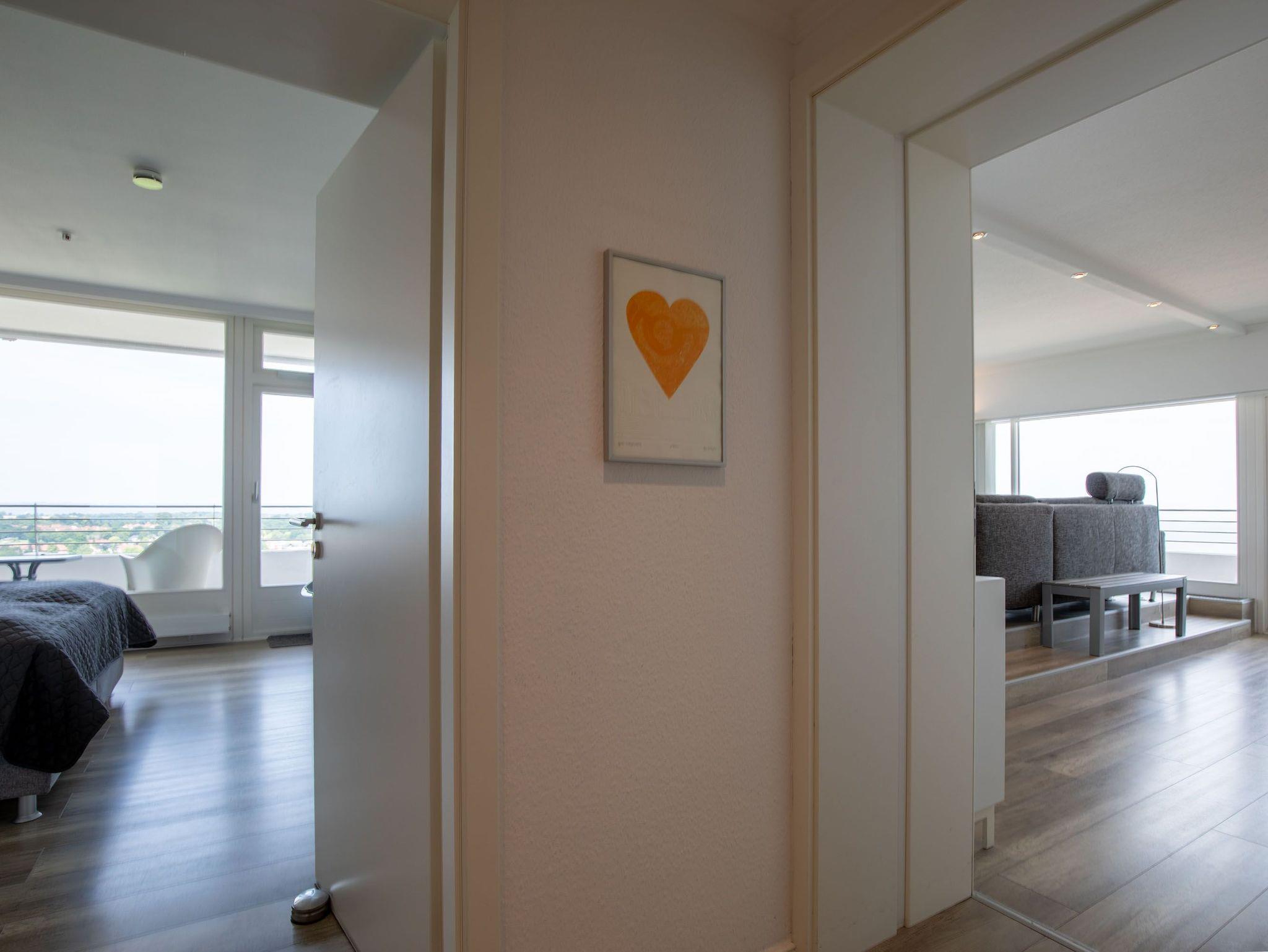 Dieses exzellente, hell eingerichtete Appartement gehört zur absoluten Spitzenklasse. Der erhöhte Podest im Wohnraum ermöglicht Ihnen von der bequemen Sitz-/Schlafcouch (55 cm x 200 cm) sowie von der Essecke einen herrlichen Meerblick. Des Weiteren befindet sich im Wohnraum eine schöne Schrankwand mit einem integrierten Einzelschrankbett (90 cm x 200 cm). Die moderne Einbauküche mit Tresen lässt die Herzen aller Kochfans höher schlagen. Im Schlafzimmer, abgehend vom Flur, befinden sich ein hochwertiges Boxspringbett (2x 90 cm x 200 cm) und ein Einbaukleiderschrank. Das hochmoderne Bad erreichen Sie vom Flur. Beide Wohnräume sind hell, lichtdurchflutet und haben einen Zugang zum großen Eckbalkon. Hier genießen Sie einen uneingeschränkten Panoramablick direkt auf die Ostsee und zur Lübecker Bucht mit lebhaftem Schiffsverkehr.