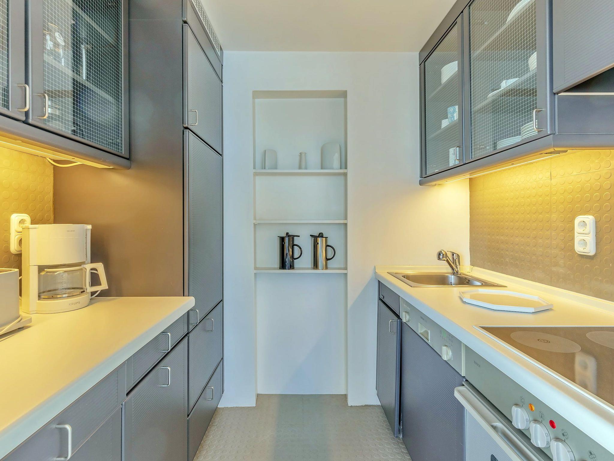 Umlaufende Loggia von ca. 26 m², Einbauküche, Geschirrspüler, Vollbad/WC, Fön, 1x TV, kostenl. W-Lan, Aufzug, inkl. Tiefgaragenstellplatz (Einfahrtshöhe: 1,85 m).