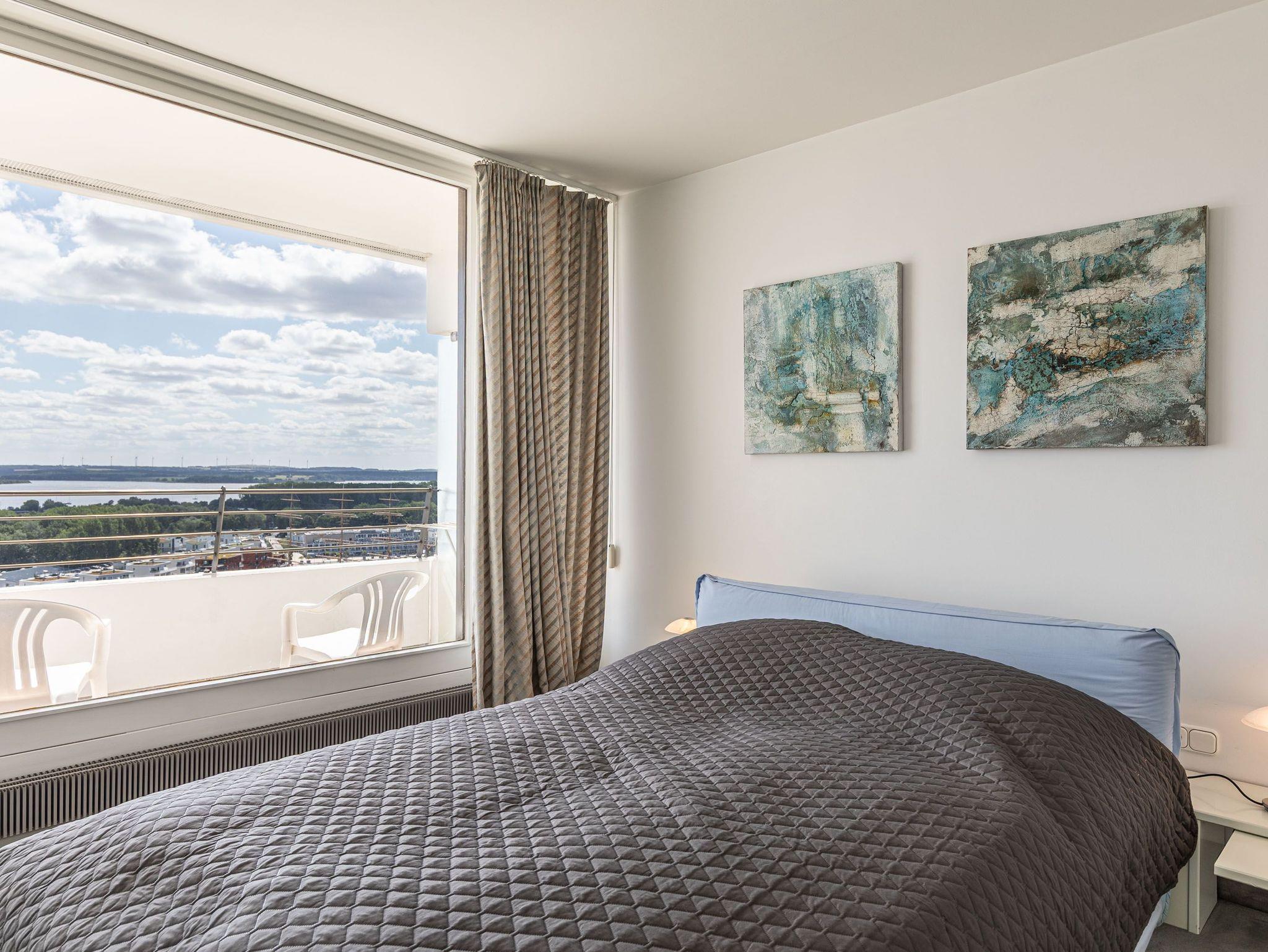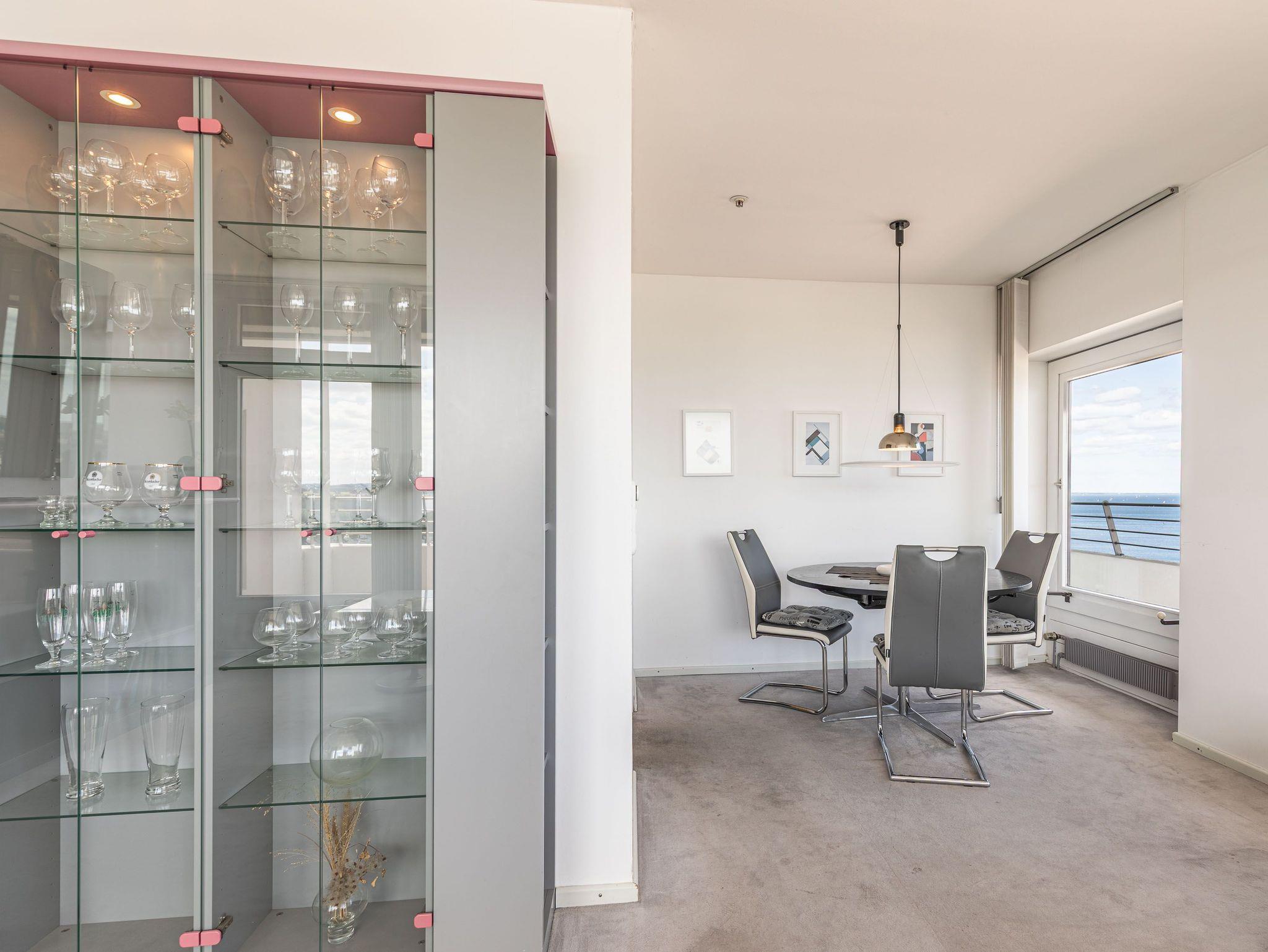 Ihr Traumurlaub in Travemünde. Direkt an der Spitze von Travemünde, liegt die neue Ferienwohnung in der Maritim Residenz. Auf 100 m² haben Sie aus der Eckwohnung im 17. Stock des Hauses einen traumhaften Blick auf die Lübecker Bucht. Beobachten Sie die Schiffe am Horizont oder beim Einlaufen in den Hafen. Genießen Sie die Weite des Meeres und den Sonnenaufgang, wenn die ersten Strahlen in die großen Panoramafenster scheinen. Auf der ca. 26 m² großen Loggia mit Balkonmobiliar haben Sie Travemünde im Blick und können ganztägig auch in Ihrer Wohnung die Sonne genießen. Natürlich können Sie direkt unten im Gebäude, in der Tiefgarage, parken[nbsp][nbsp]und ein Aufzug bringt Sie und Ihr Gepäck ganz bequem nach oben. Die großzügige Wohnung hat zwei getrennte Schlafzimmer für bis zu 4 Personen und allen anderen exklusiven Komfort, den Sie von Dzulko Ferienwohnungen kennen.