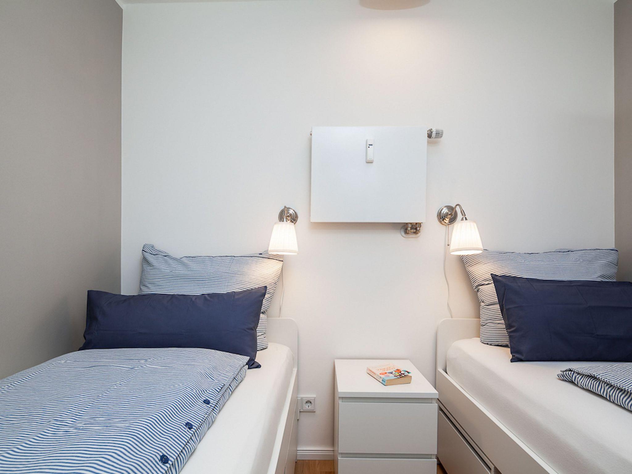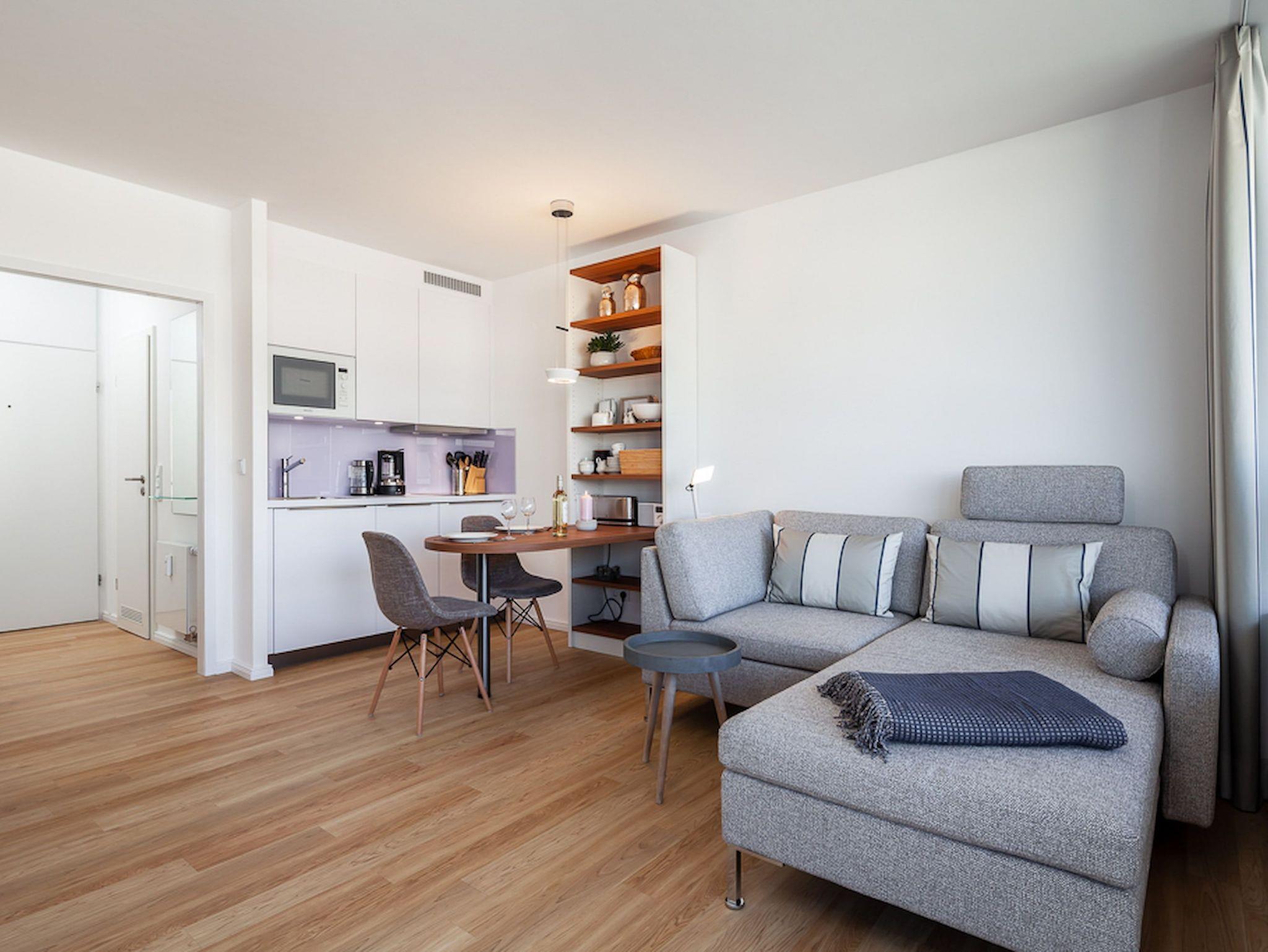 Die erfrischend und hochwertig ausgestattete 1,5 Zimmer Wohnung „Strandkorb besticht mit schönen warmen Farben und modernem Design. In 2. Reihe vom Meer gelegen, lädt dieses Appartement in ruhiger und gepflegter Wohnanlage zu einem schönen erholsamen Urlaub ein. Die feine, kleine Wohnung „Strandkorb hat einen großen Wohn-Essraum mit integrierter Küchenzeile. Eine gemütliche Sofaecke mit Liegemöglichkeit (177cm x 166cm) für eine Person lädt zum Lesen oder einem Abend am TV ein. W-Lan ist natürlich auch vorhanden. Die Steh-Leselampe können Sie mit einem Griff von der Ladestation überall mit hinnehmen. Der kleine Schlafraum verfügt über zwei Einzelbetten (90cm x 200 cm) und hat ein Oberlicht, das geöffnet bzw. auch verdunkelt werden kann. Das hochwertige Badezimmer ist getrennt vom WC. Der überdachte Balkon mit Sonne von morgens bis in den Nachmittag (je nach Jahreszeit) hat zwei bequeme Sessel, einen Esstisch, sowie Außenlicht.