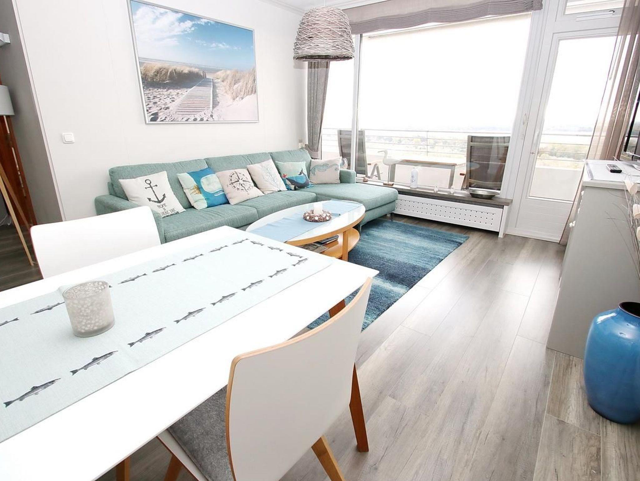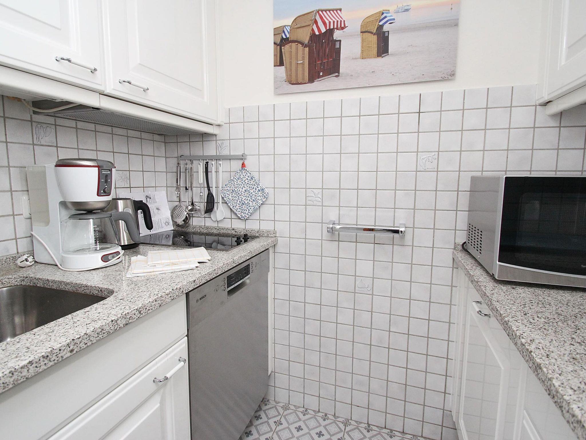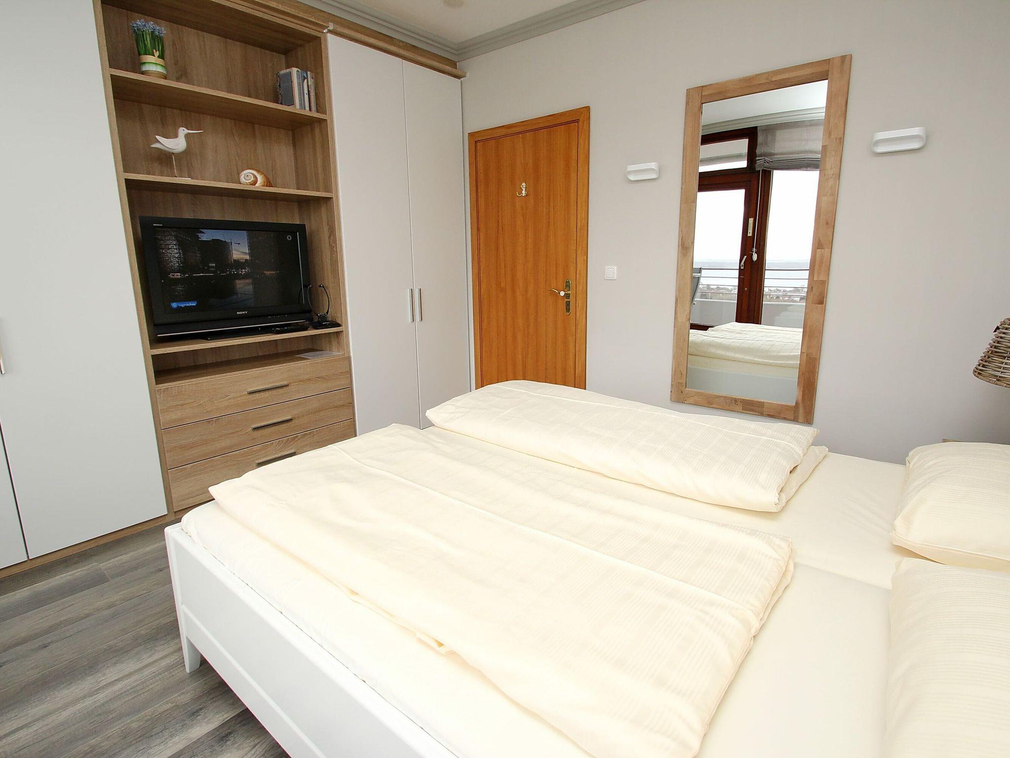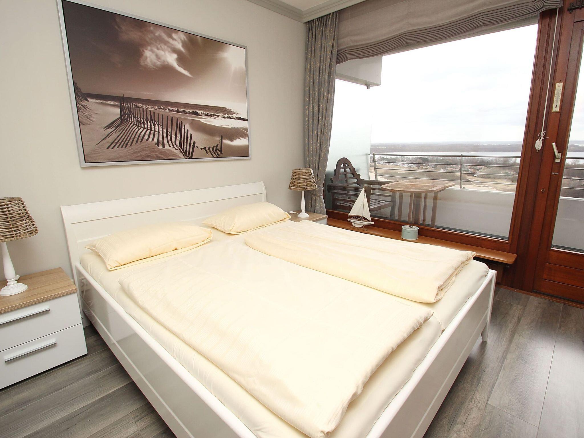 Diese liebevoll dekorierte Wohnung ist bis ins kleinste Detail hervorragend ausgestattet. Im Wohnzimmer befinden sich eine gemütliche Couch mit Ottomane und ein Tisch. Die weitere Einrichtung besteht aus einer schönen Anrichte und einem Esstisch mit vier Stühlen. Abgehend vom Wohnzimmer finden Sie in der Wohnraumnische eine Sitz-/Schlafcouch (155 cm x 200 cm) vor. Im Schlafzimmer erwarten Sie ein hochwertiges Doppelbett (2x 90 cm x 200 cm) und ein Kleiderschrank. In das moderne Bad sowie in die Küche mit Durchreiche zum Wohnzimmer, gelangen Sie vom Flur aus. Den sonnigen Balkon erreichen Sie von beiden Wohnräumen. Hier genießen Sie einen herrlichen Panoramablick auf die Trave mit der Passat und lebhaftem Schiffsverkehr, zur Lübecker Bucht sowie zum Hafen.