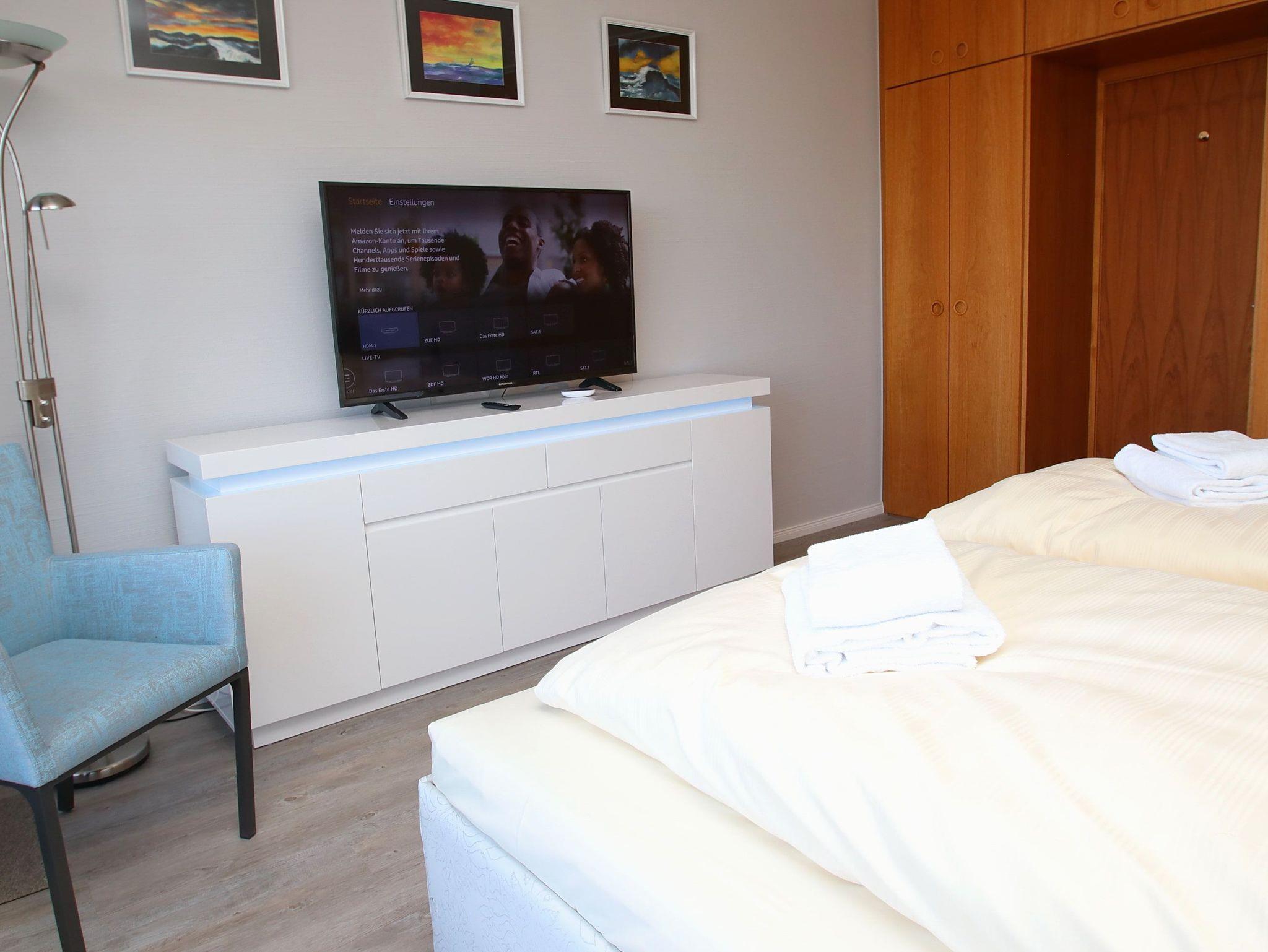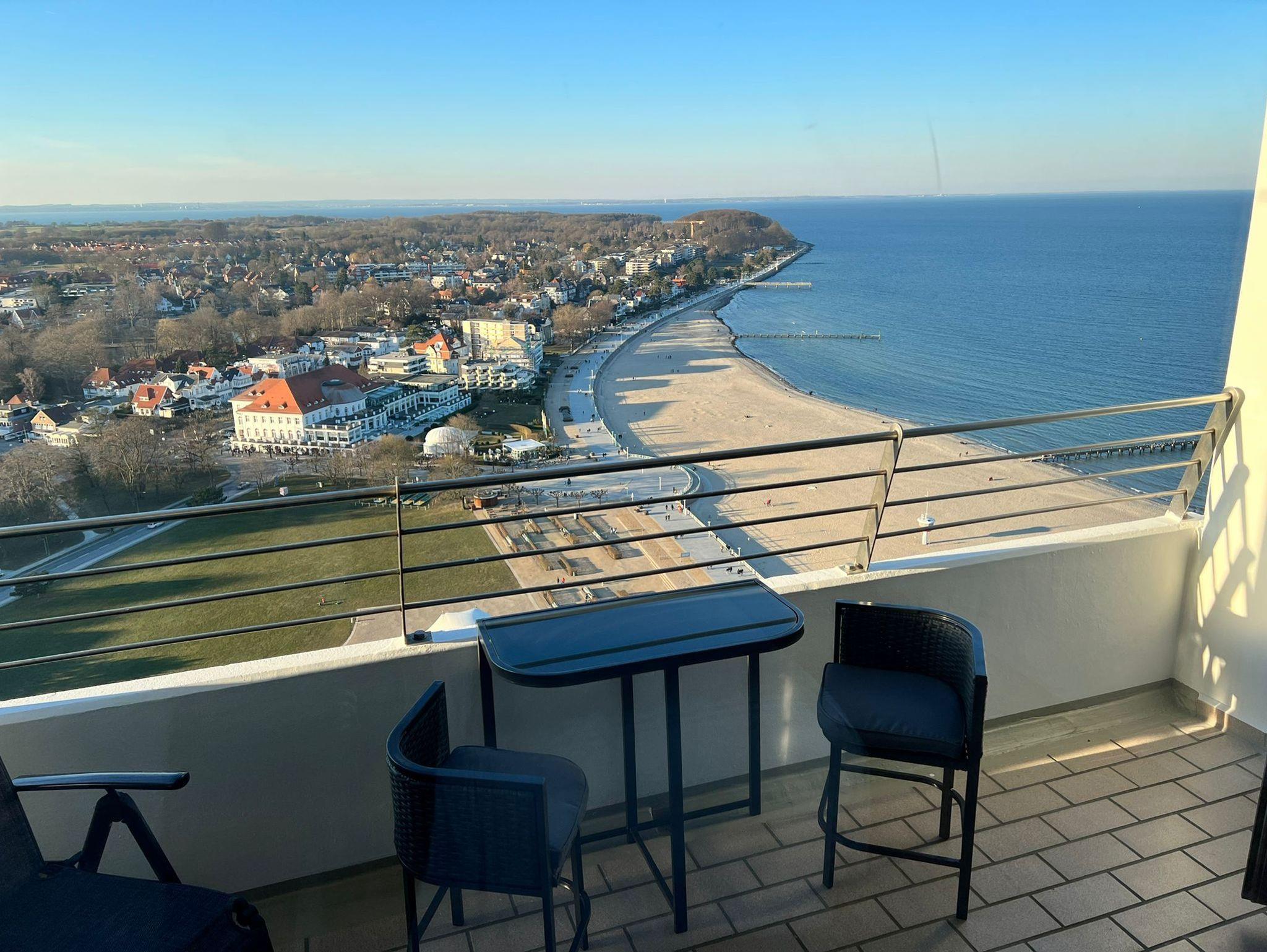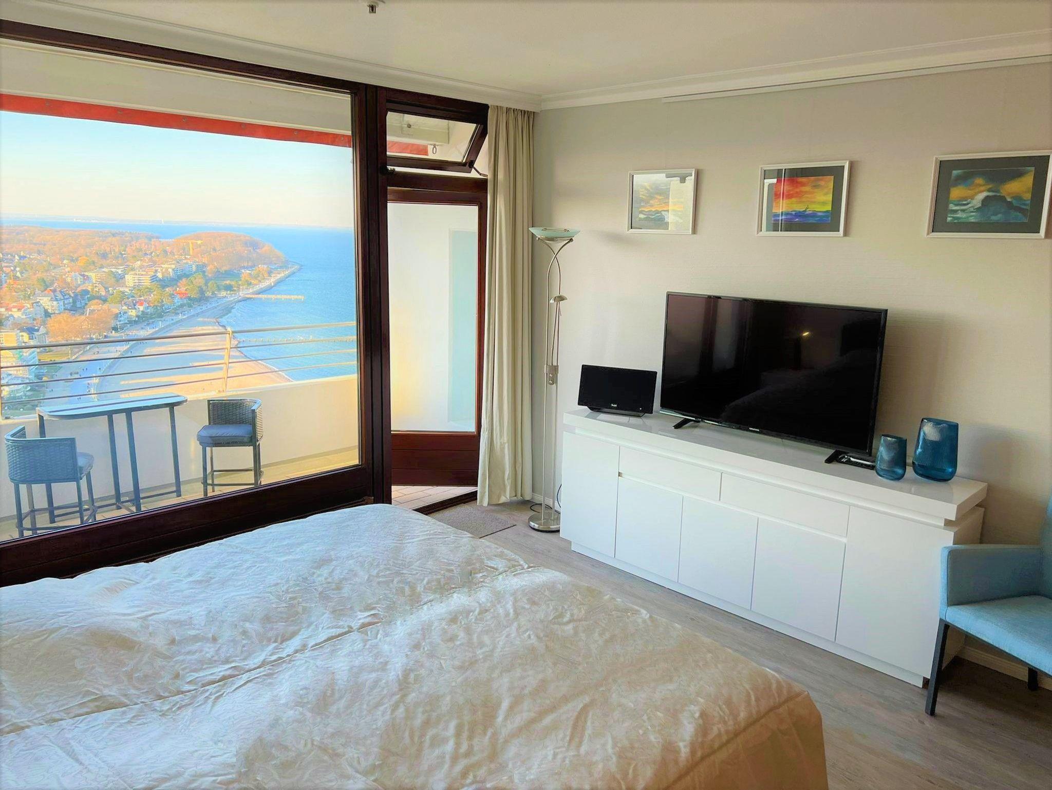 Dieses komfortable und elegante Appartement bietet ein Wohnerlebnis für höchste Ansprüche und lädt zum Wohlfühlen und Entspannen fern des Alltags ein. Highlight dieser, im Jahr 2021 komplett renovierten Ferienwohnung, ist der traumhafte Blick über die Lübecker-Bucht mit lebhaftem Schiffsverkehr. Der großzügige Wohnraum besteht aus einer bequemen Eck-Couch mit Tisch, einem Sideboard, einem großen Smart-TV, sowie einem Esstisch mit 6 bequemen Lounge-Stühlen. Im großen Schlafzimmer befindet sich ein gemütliches Doppelbett (2x 90 cm x 200 cm) und ein großer Einbauschrank sowie ein Smart-TV. Das zweite Schlafzimmer ist ebenfalls mit einem bequemen Doppelbett (160x cm x 200 cm) und einem Kleiderschrank ausgestattet. In der Küche finden Sie unteranderem einen Geschirrspüler sowie einen amerikanischen Designer-Kühlschrank vor. Das modernisierte Duschbad, erreichen Sie vom Eingangsbereich aus . Alle Wohn- und Schlafräume verfügen über einen direkten Zugang auf den überdimensionalen Eckbalkon mit herrlichem Blick über die Ostsee. Zusätzlich steht Ihnen das Schwimmbad im Haus kostenlos zu Verfügung.