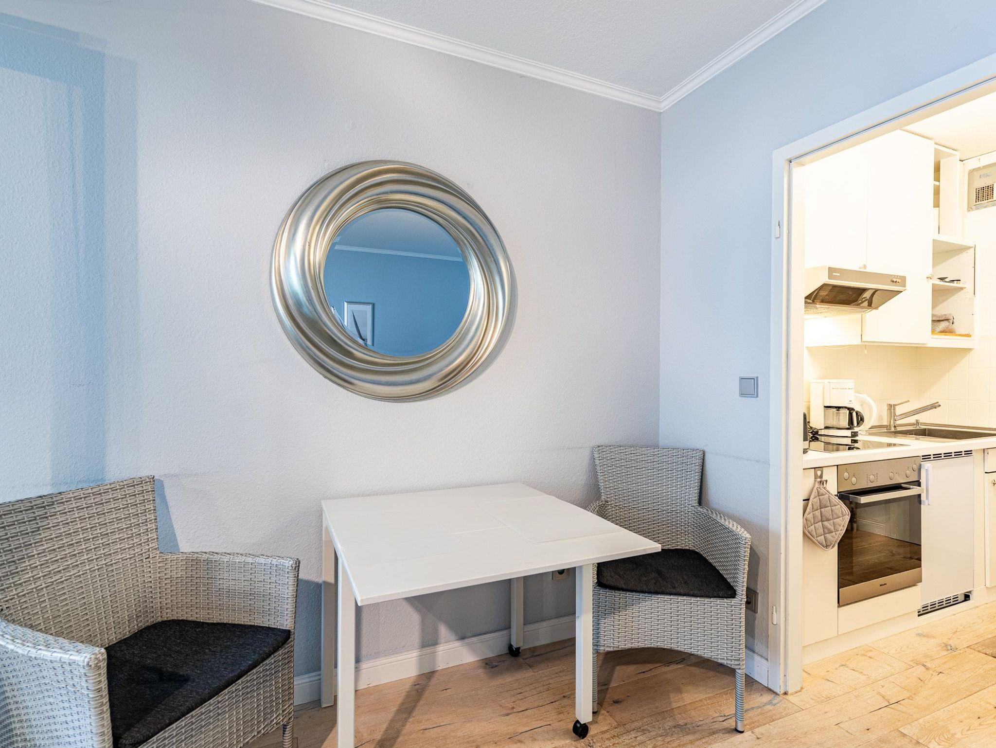 1-Zimmer-Ferienwohnung, 1. OG, ca. 35 m² mit Teilblick auf das Meer.