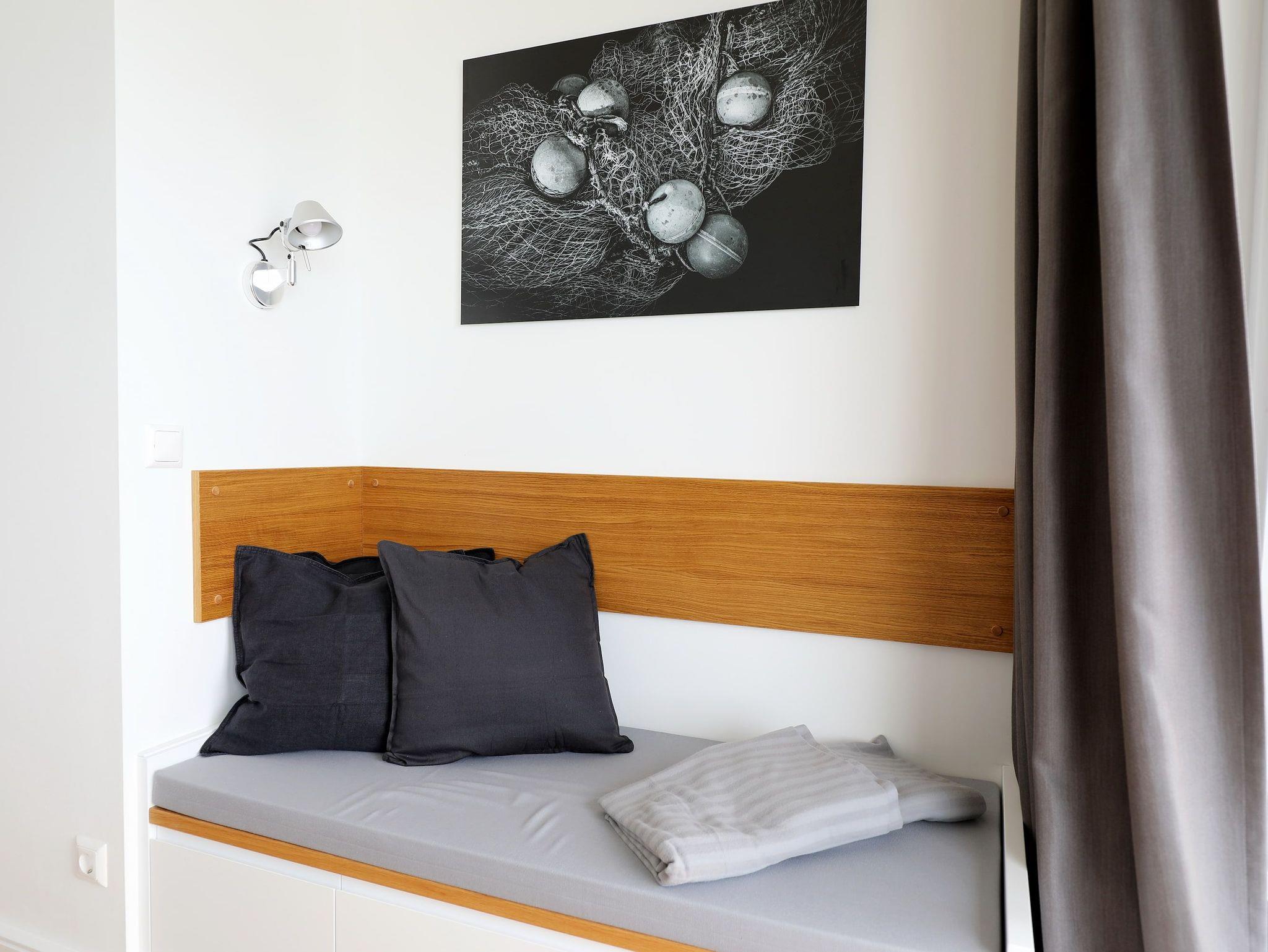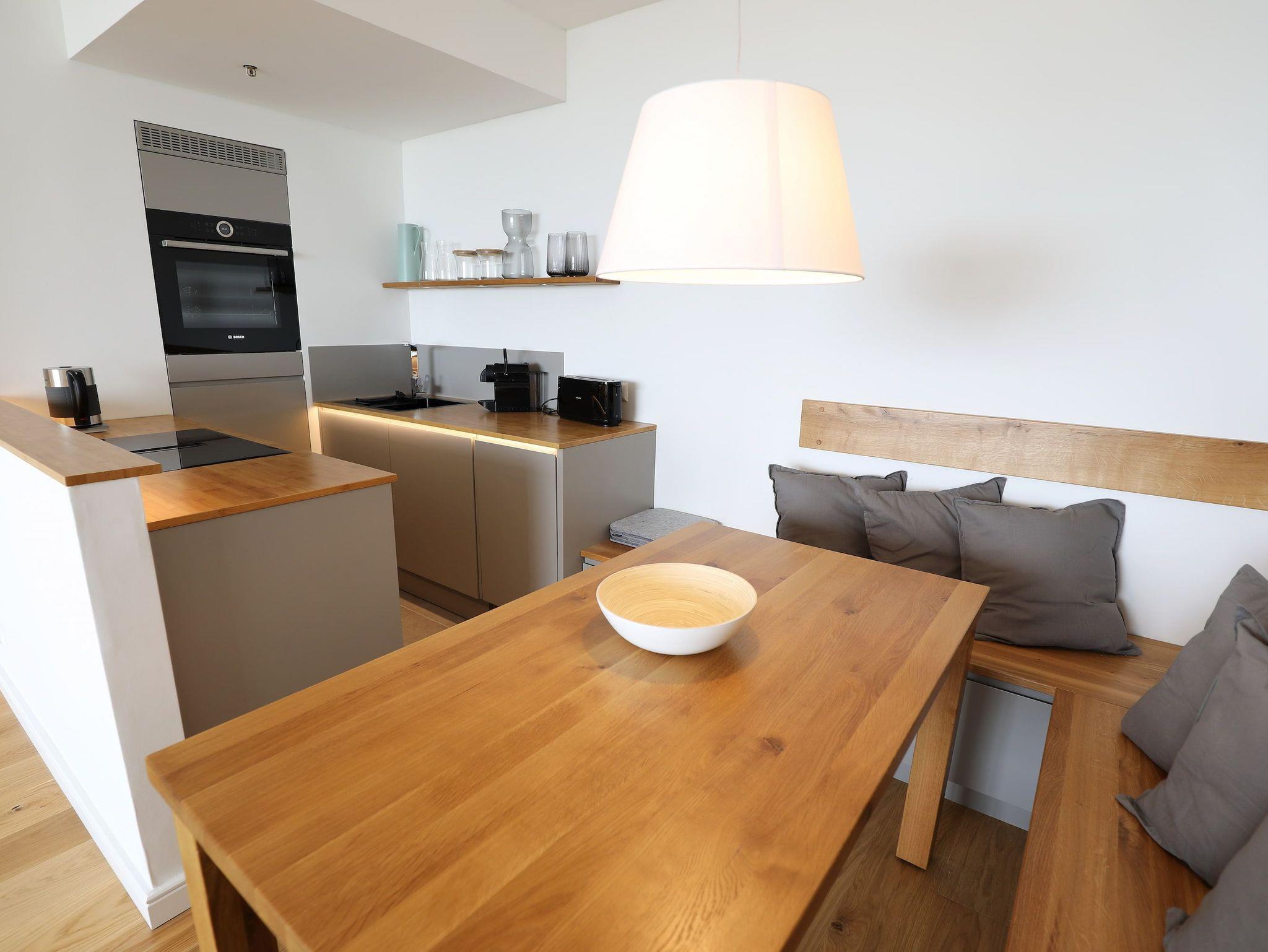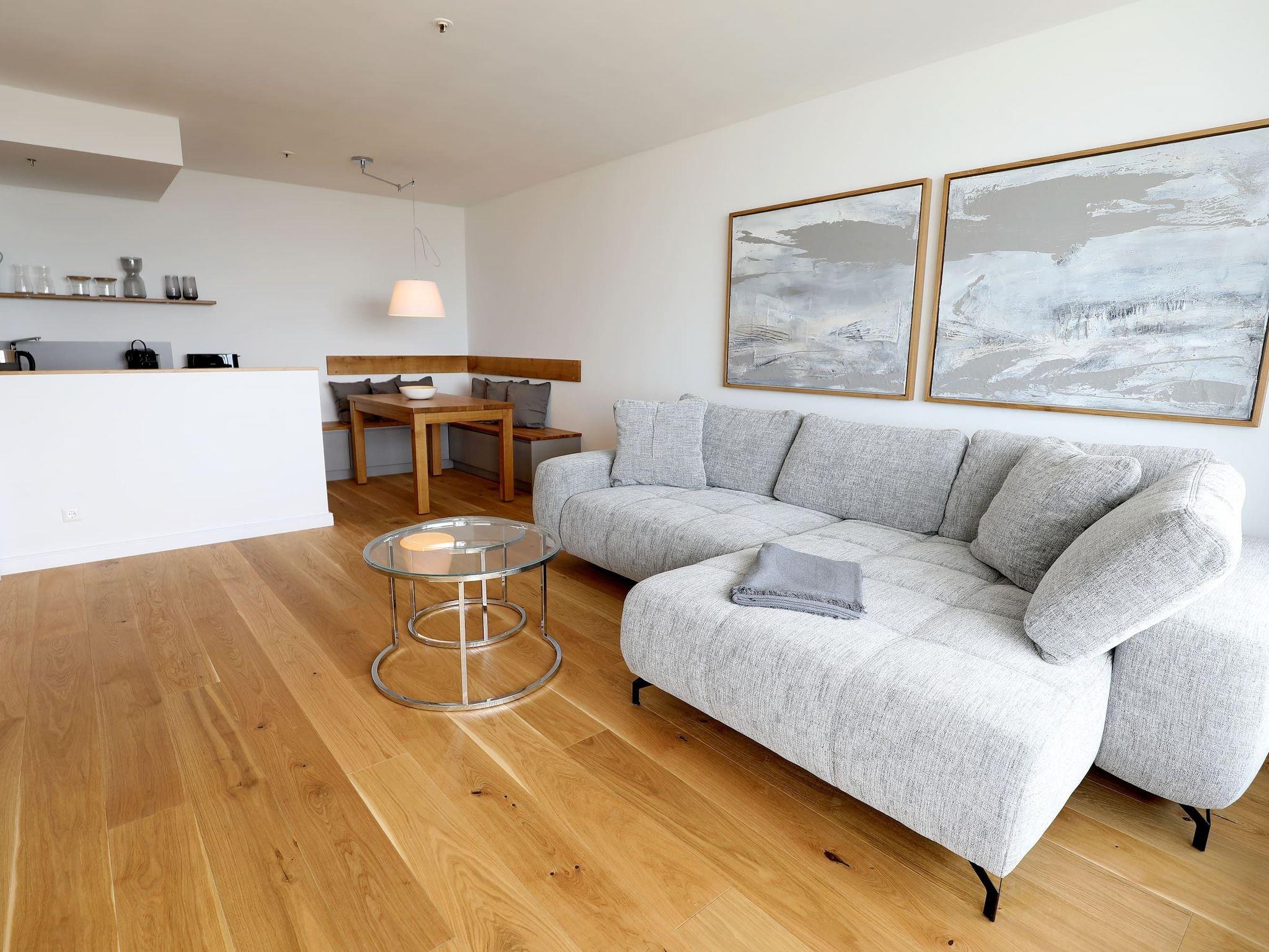 Dieses komfortabel und elegant eingerichtete Design-Appartement ist im Jahr 2023 vollständig saniert worden und bietet Ihnen neben einigen Highlights und einer Einrichtung mit Liebe zum Detail, ein Wohnerlebnis für aller-höchste Ansprüche. Genießen Sie den Atemberaubenden Blick auf die Lübecker-Bucht und den Travemünder-Strand direkt vom Wohnzimmer und vom Schlafzimmer. Das Wohnzimmer besteht aus einer großen gemütlichen Eck-Couchgarnitur in modernen Grautönen und zwei kleinen gläsernen Tischchen sowie einem großen Smart-TV. Die offene Küche mit Tresen und indirekter Beleuchtung der Arbeitsfläche ist in das Wohnzimmer intrigiert. In Ihrer Küche ist ein Bora-Abzug in das Kochfeld eingebaut, so dass sie selbst beim kochen den direkten Blick auf die Ostsee genießen können. Der Essbereich befindet sich angrenzend an der Küche und besteht aus einer Eckbank sowie einem Holztisch. In Ihrem Schlafzimmer befindet sich ein gemütliches Boxspringbett (180 cm x 200 cm), ein großer Kleiderschrank und eine kleine Sitzbank. Das komfortable Badezimmer mit der großzügigen ebenerdigen-Dusche erreichen Sie vom Eingangsbereich. Die gesamte Wohnung ist mit edlem Echtholz Eichenparket ausgelegt. Genießen Sie auf Ihrem großen Balkon den herrlichen Blick auf die Ostsee und den Strand. Diese exklusive Ferienwohnung ist in hellen Farbentönen und modernen grau-Akzenten eingerichtet und lässt für Ihren erholsamen Ostseeurlaub in Travemünde keinerlei Wünsche offen.