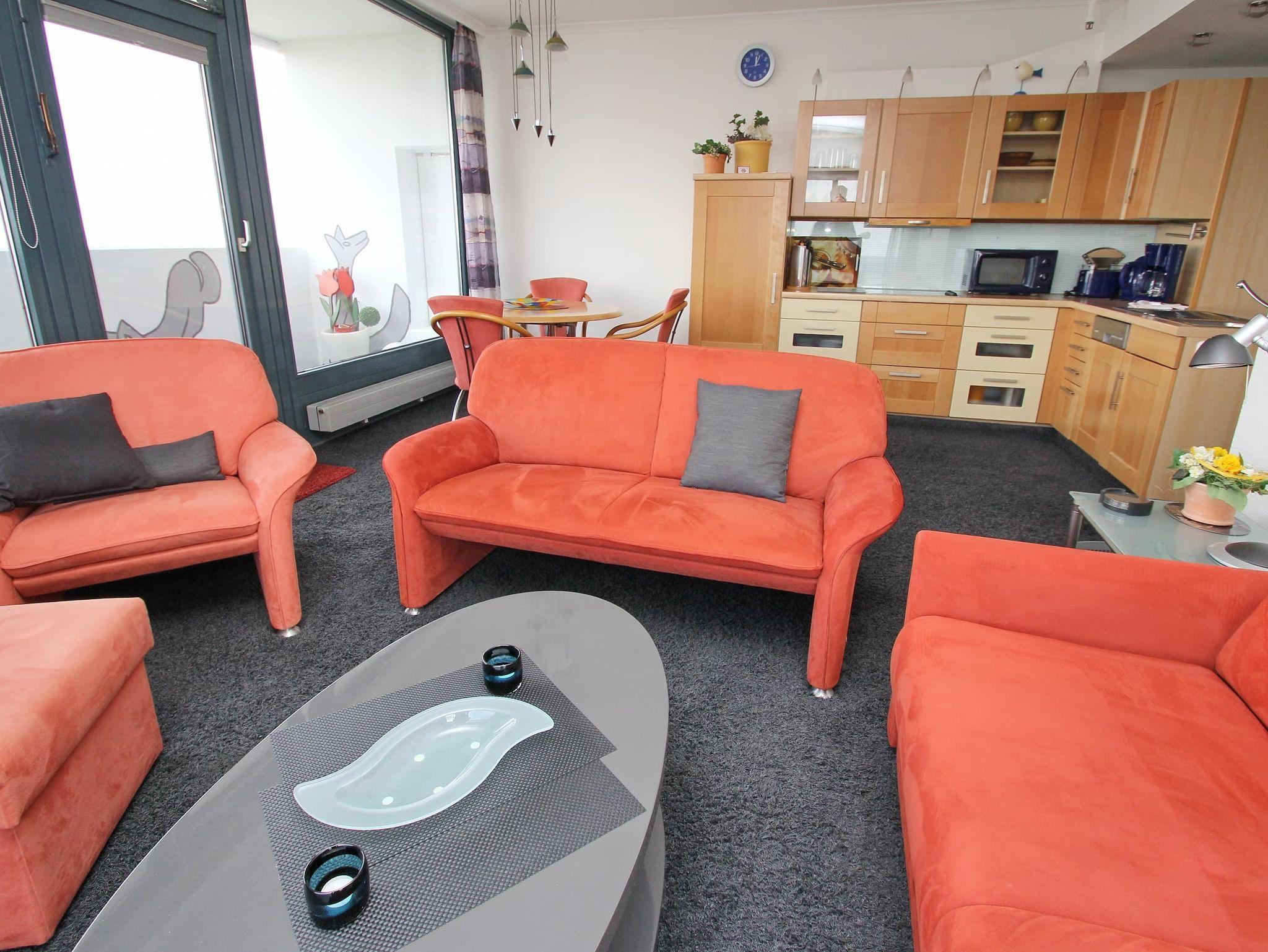 Umlaufende Loggia von ca. 21 m², Markise, Küche, Geschirrspüler, Mikrowelle, Duschvollbad/WC, Fön, 2x TV, Stereoanlage, Telefon, kostenl. W-Lan, Aufzug, inkl. Tiefgaragenstellplatz (Einfahrtshöhe: 1,85 m).