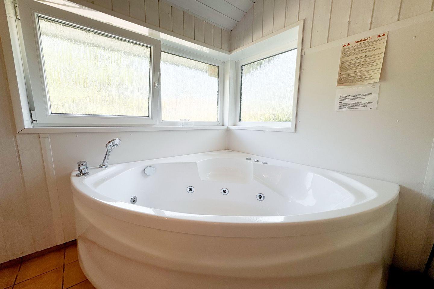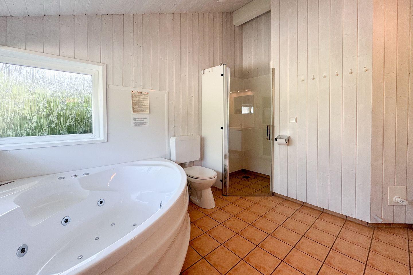 Das Badezimmer bietet eine Sauna, einen Whirlpool (für bis zu 2 Personen), eine bodengleiche Dusche, WC und ein Waschbecken.