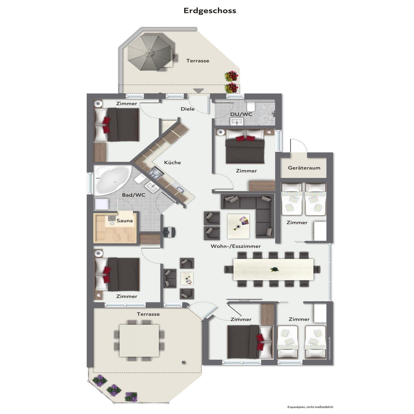 - 4 Schlafzimmer mit Doppelbetten