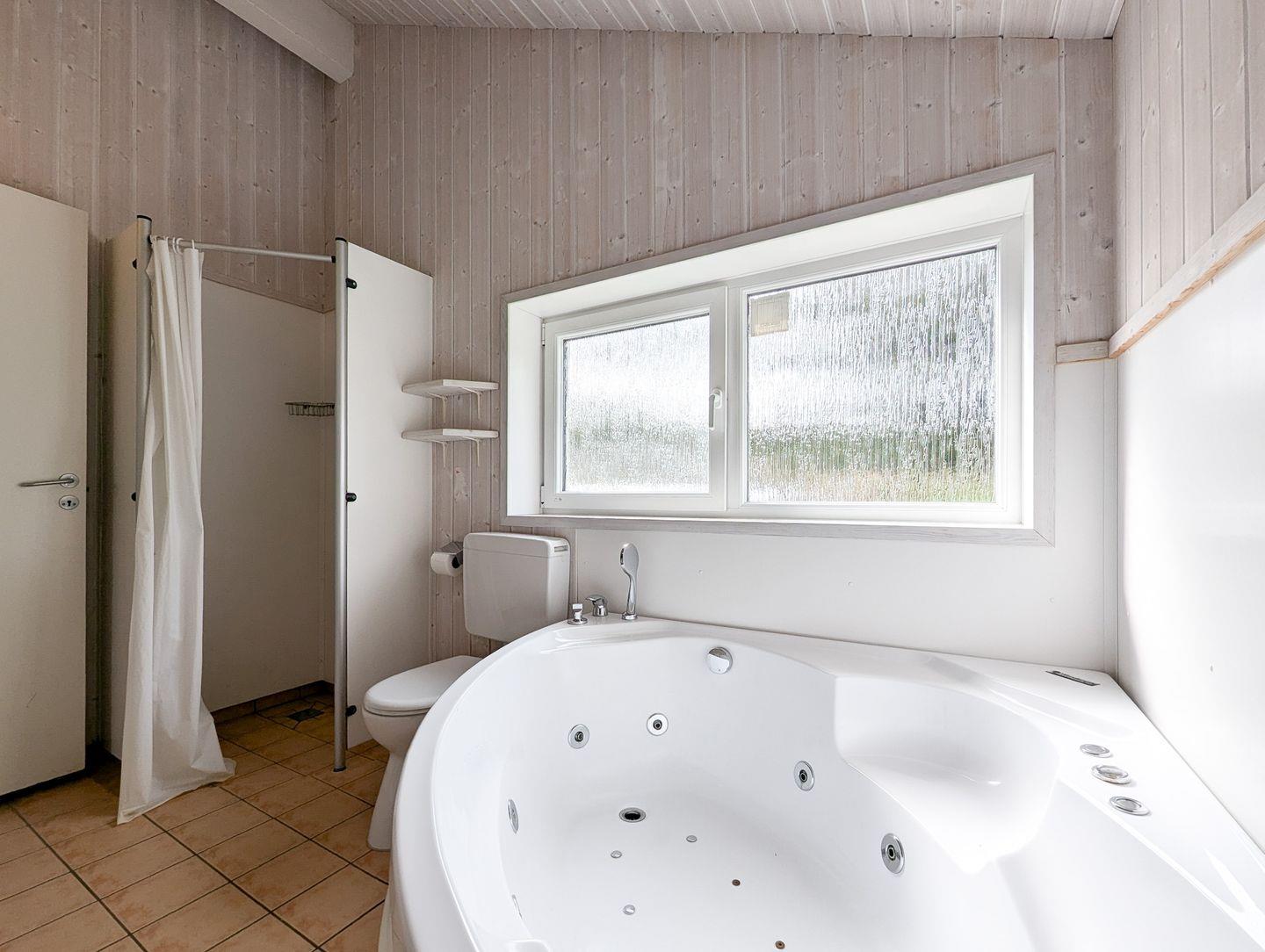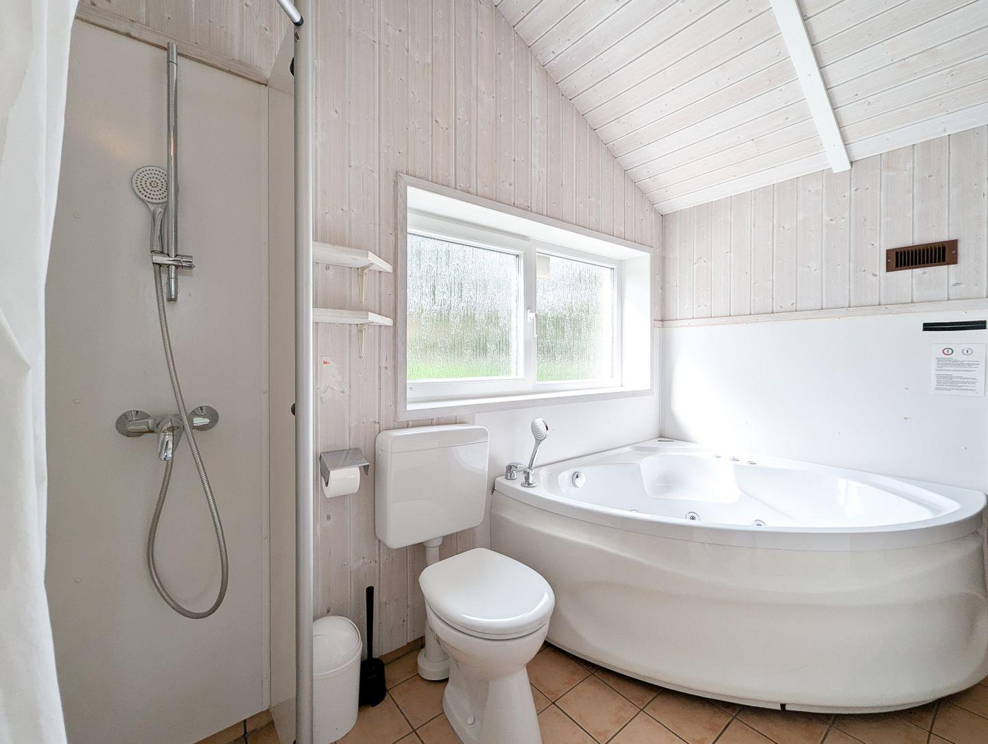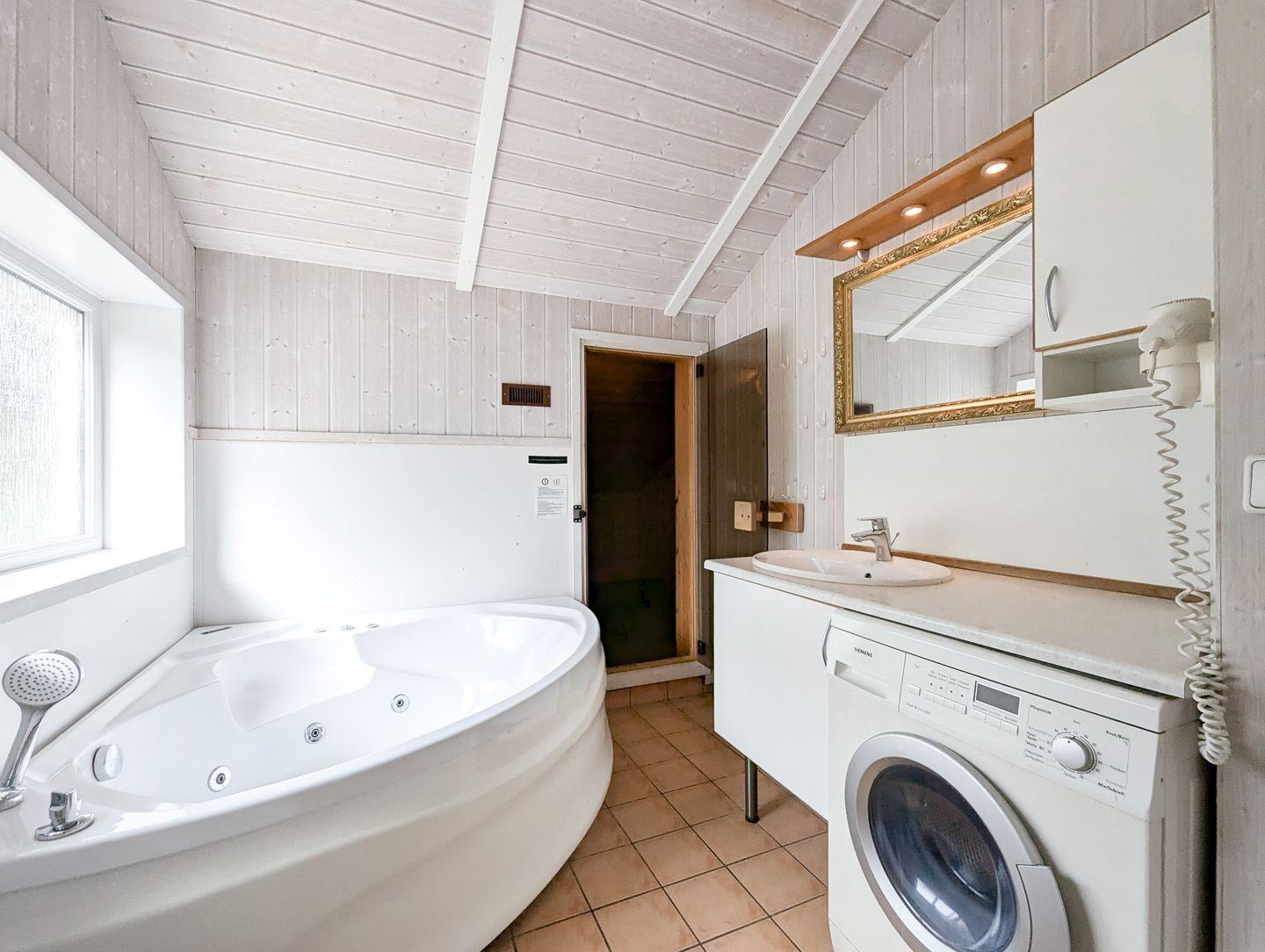 Das Badezimmer bietet eine Sauna, einen Whirlpool (für bis zu 2 Personen), eine bodengleiche Dusche, ein WC und ein Waschbecken.