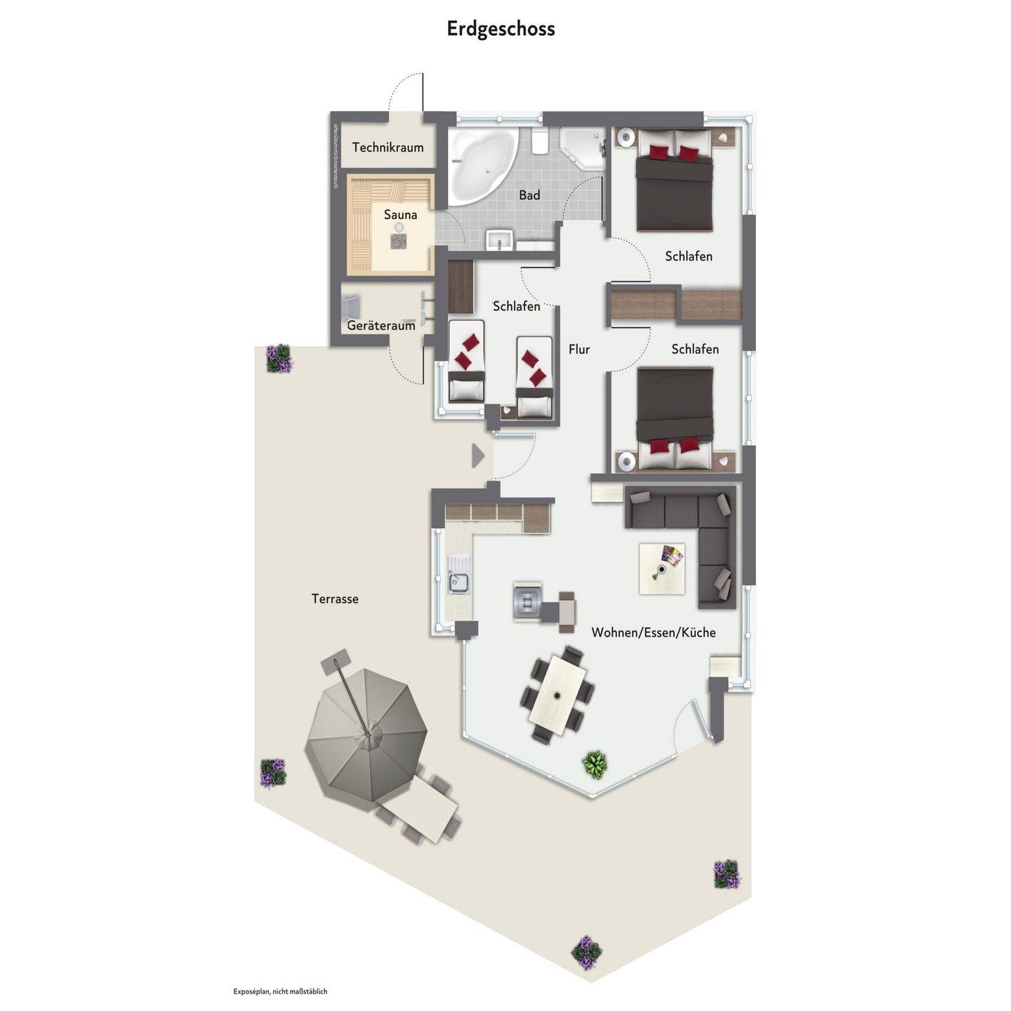 Der offene und großzügige Wohnbereich lädt zu gemeinsamen Stunden mit der Familie oder den Freunden ein. Die lichtdurchflutete Gestaltung schafft ein angenehmes Ambiente, in dem Du Dich sofort wohlfühlen wirst.