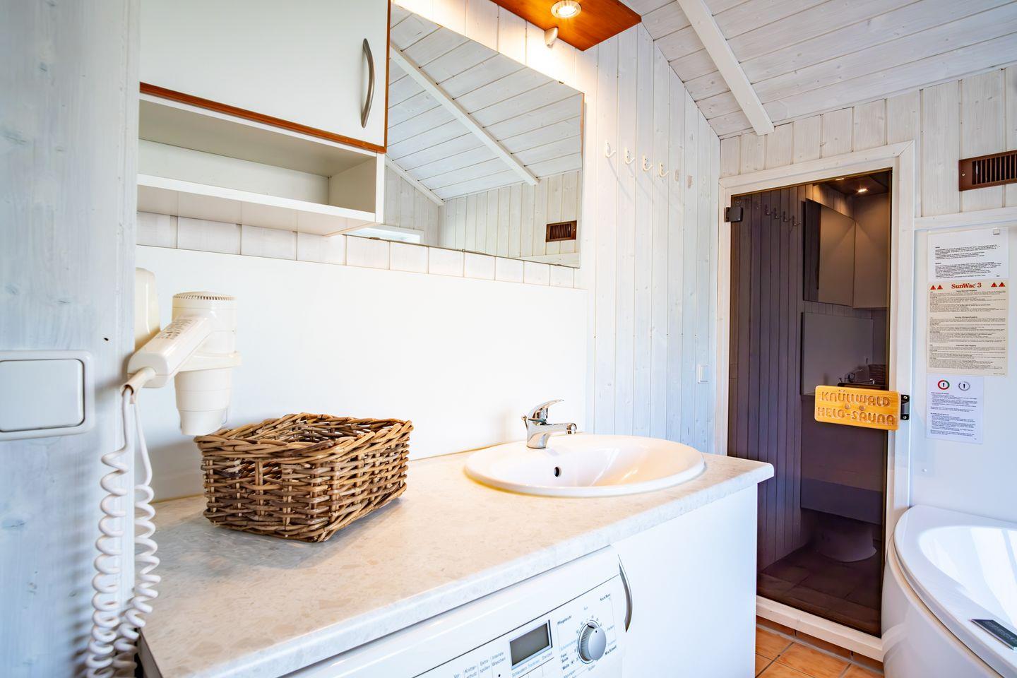 Das Badezimmer bietet eine Sauna, einen Whirlpool (für bis zu 2 Personen), eine bodengleiche Dusche, WC und ein Waschbecken.