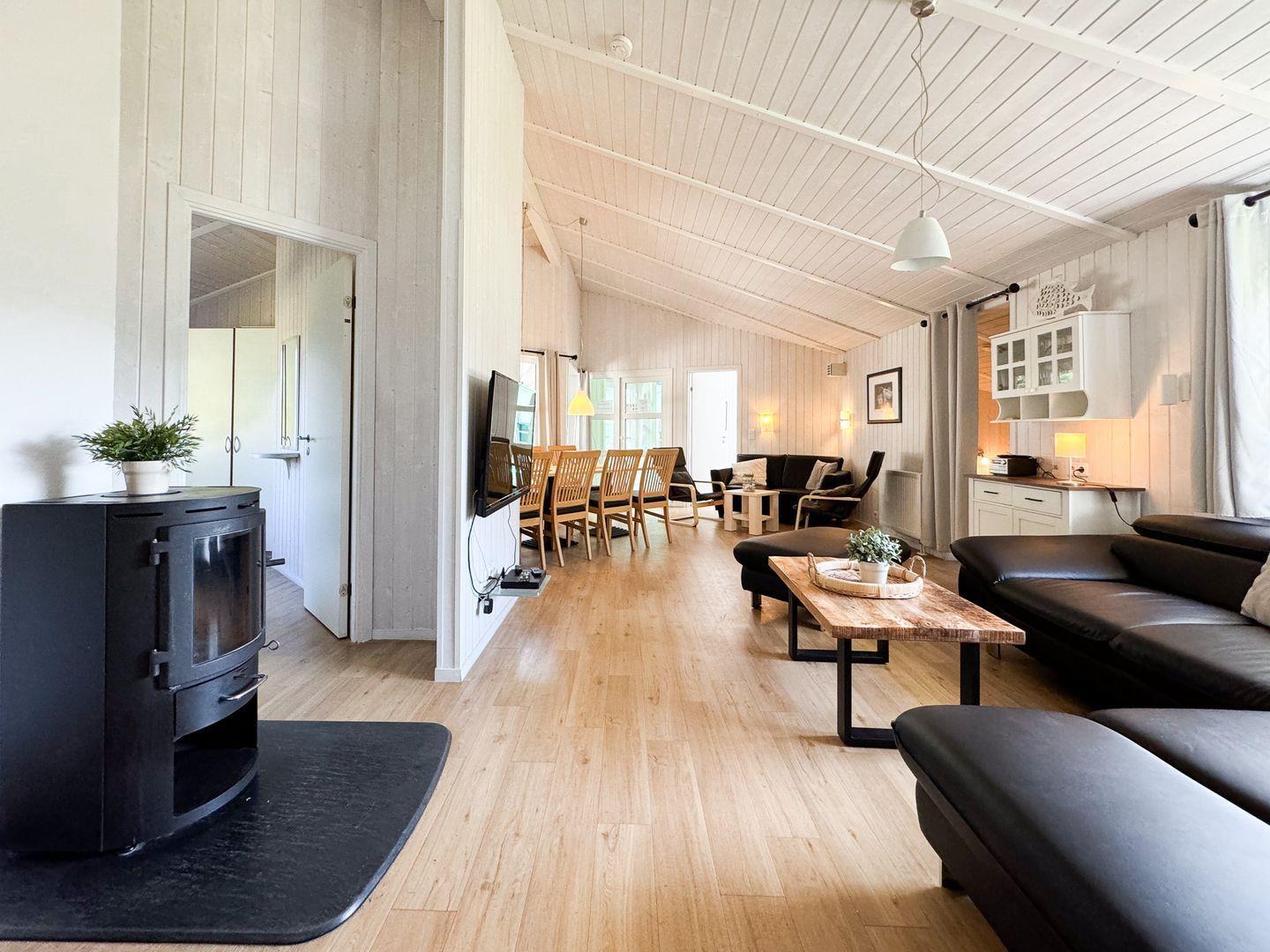 Der offene Wohn- und Essbereich ist der perfekte Ort, um zusammenzukommen. Zwei Sofaecken und ein einladender Essbereich schaffen eine gemütliche Atmosphäre. Der Kaminofen sorgt für wohlige Wärme, während der Flachbild-TV, das Radio mit CD-Spieler und der DVD-Player für Unterhaltung sorgen. Große Fenster mit Vorhängen garantieren eine angenehme Privatsphäre.