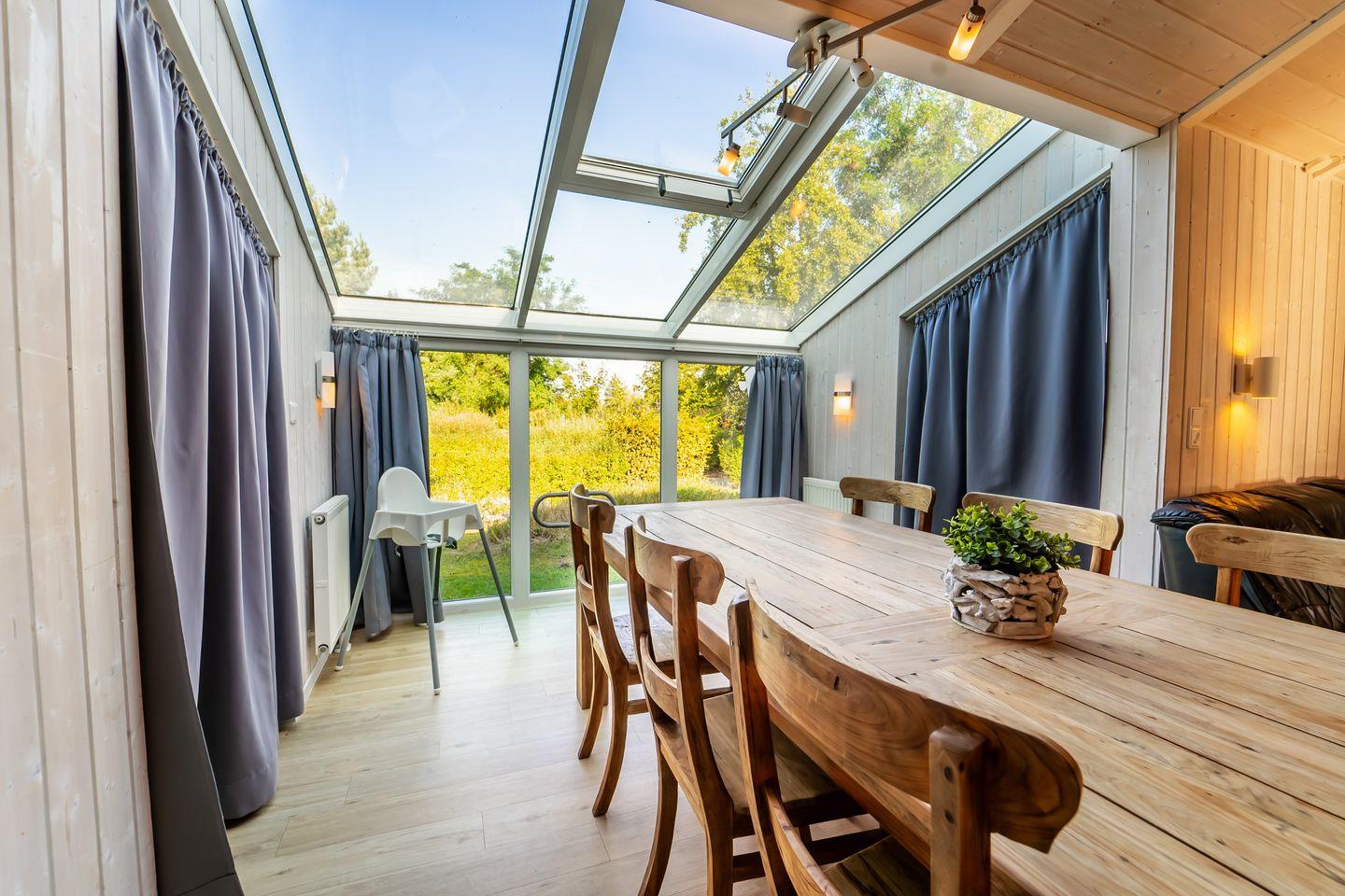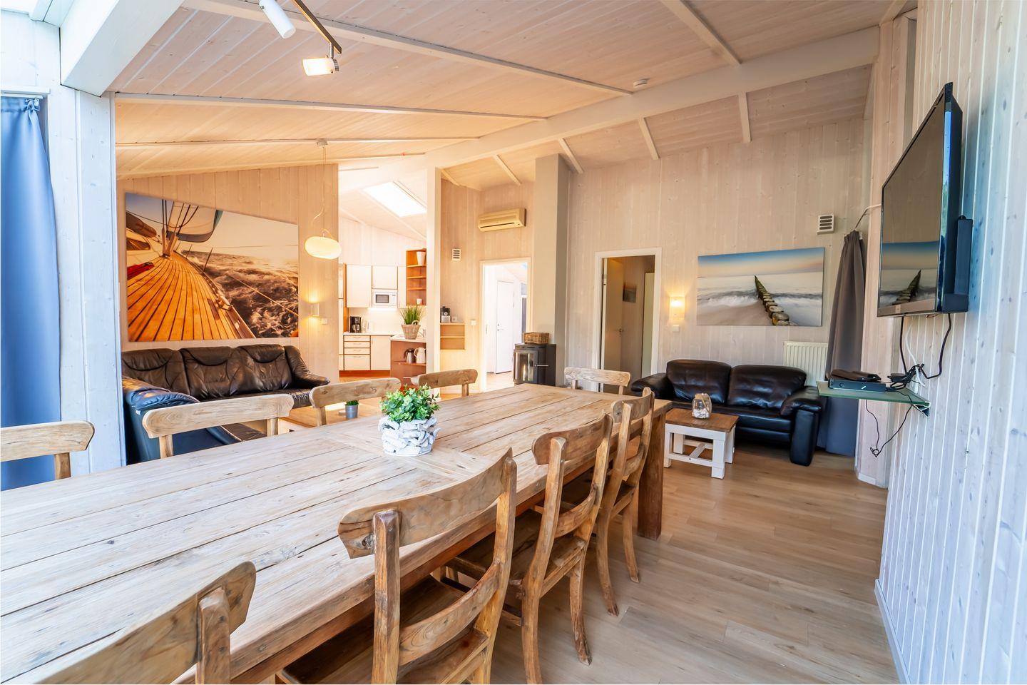 Für ein gemütliches Zusammenkommen eignen sich die offene Küche mit großem Wohn- und Essbereich. Zwei Sofas und ein einladender Essbereich schaffen viele Sitzgelegenheiten und eine gemütliche Atmosphäre. Der Kaminofen sorgt für Wärme in den kälteren Jahreszeiten, während der Flachbild-TV, das Radio mit CD-Spieler und der DVD-Player für Unterhaltung sorgen. Große Fenster mit Vorhängen garantieren eine angenehme Privatsphäre.