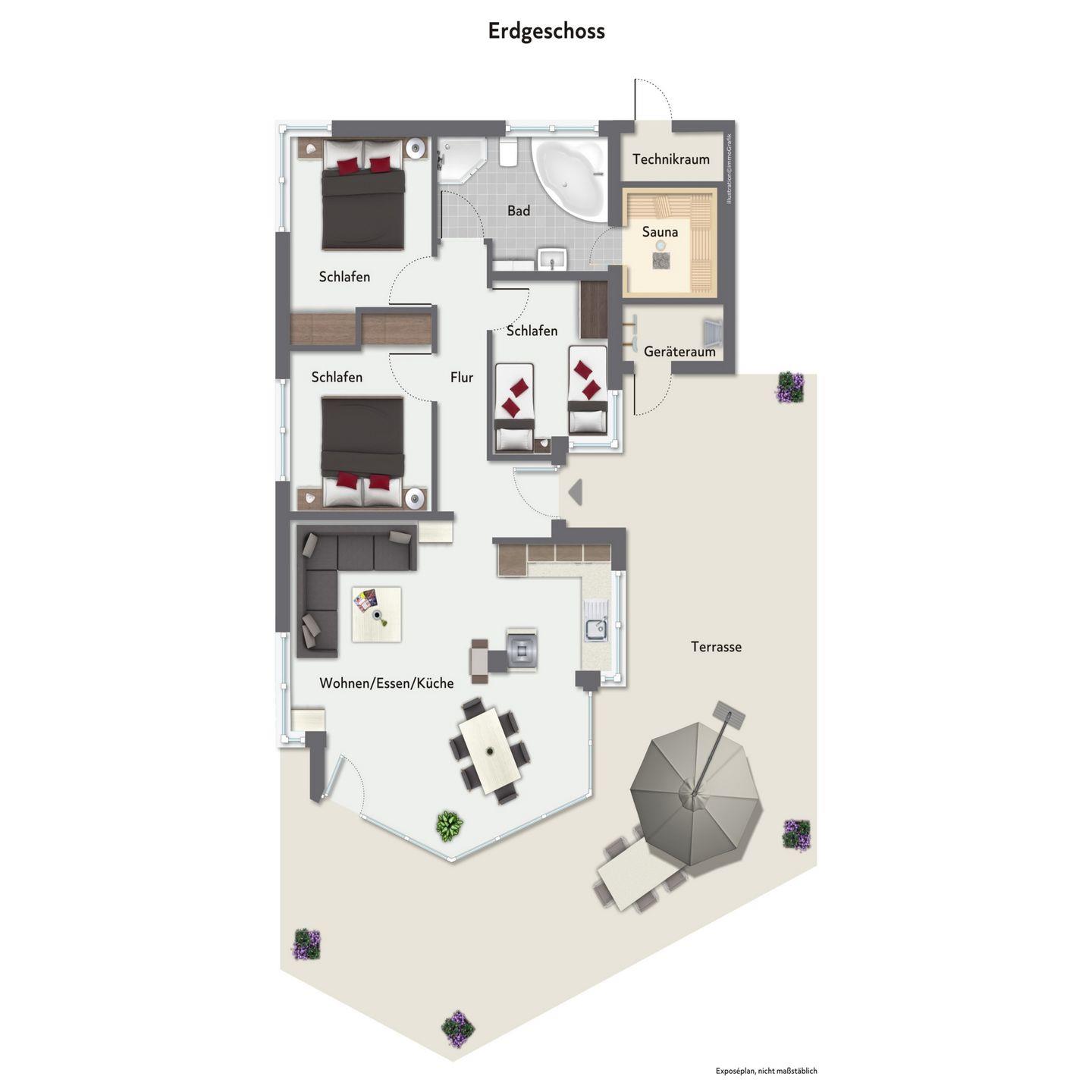 Ob Grillen, Buch lesen oder einfach nur Sonnen: Die riesige Terrasse bietet die maximale Urlaubsentfaltung und schafft das Höchstmaß an Erholung!