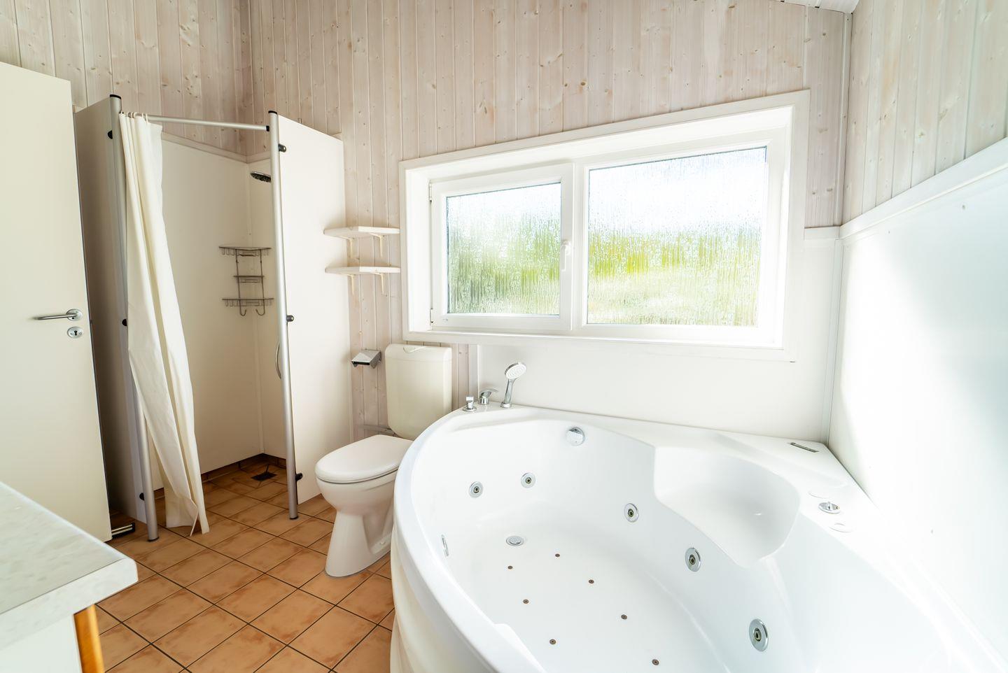 Das Badezimmer bietet eine Sauna, einen Whirlpool (für bis zu 2 Personen), eine bodengleiche Dusche, ein WC und ein Waschbecken.