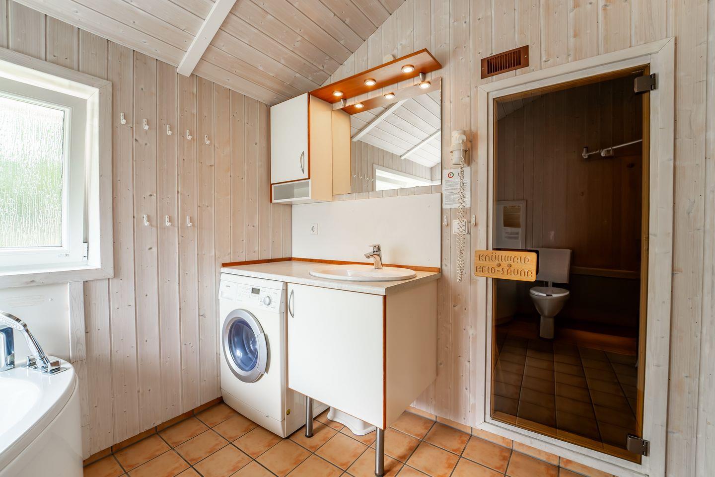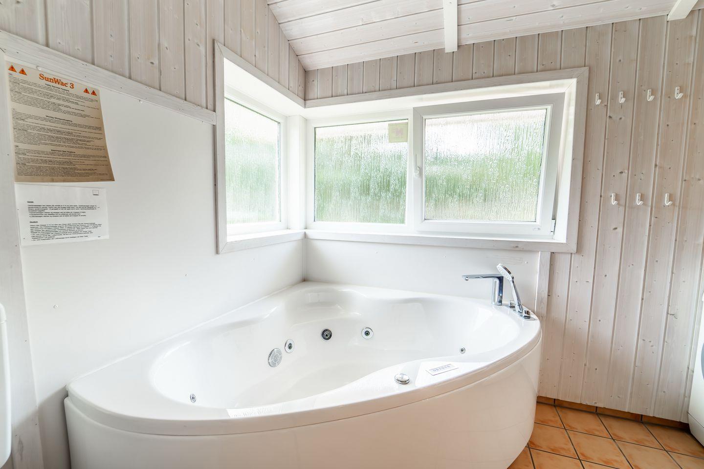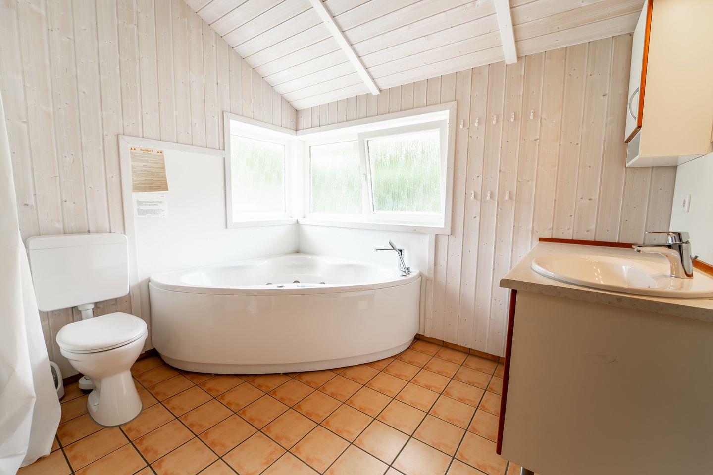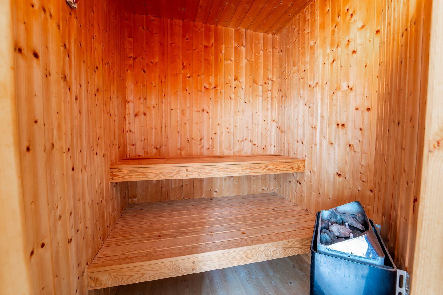 Das Badezimmer bietet eine Sauna, einen Whirlpool (für bis zu 2 Personen), eine bodengleiche Dusche, ein WC und ein Waschbecken.