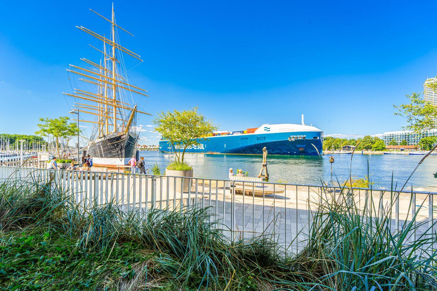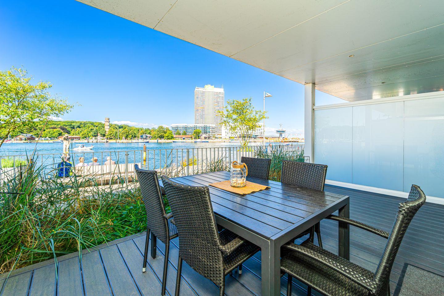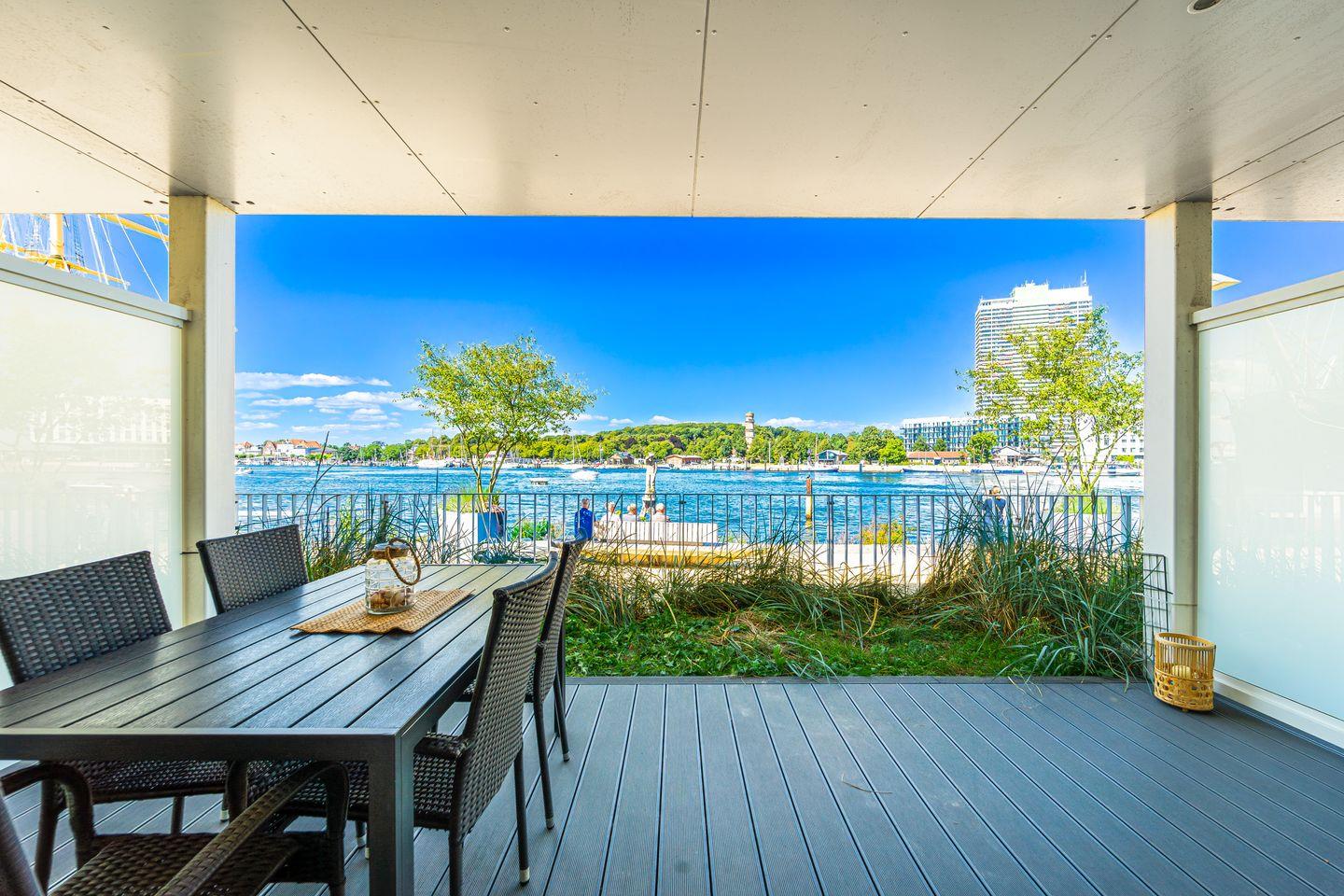 Der Wohnbereich ist hochwertig eingerichtet mit einem Sofa, HiFi-Anlage, Blu-ray-Player und zwei Flachbild-TVs. Ein besonderes Highlight ist der Bioethanolkamin, der abends für eine warme und behagliche Atmosphäre sorgt. Das Sofa lässt sich bei Bedarf in zwei bequeme Schlafplätze verwandeln. Durch die großen Fenster kannst Du jederzeit den traumhaften Panoramablick über den Segelhafen, die Travemündung, das Museumsschiff „Passat“ und die vorbeiziehenden Skandinavienfähren genießen.