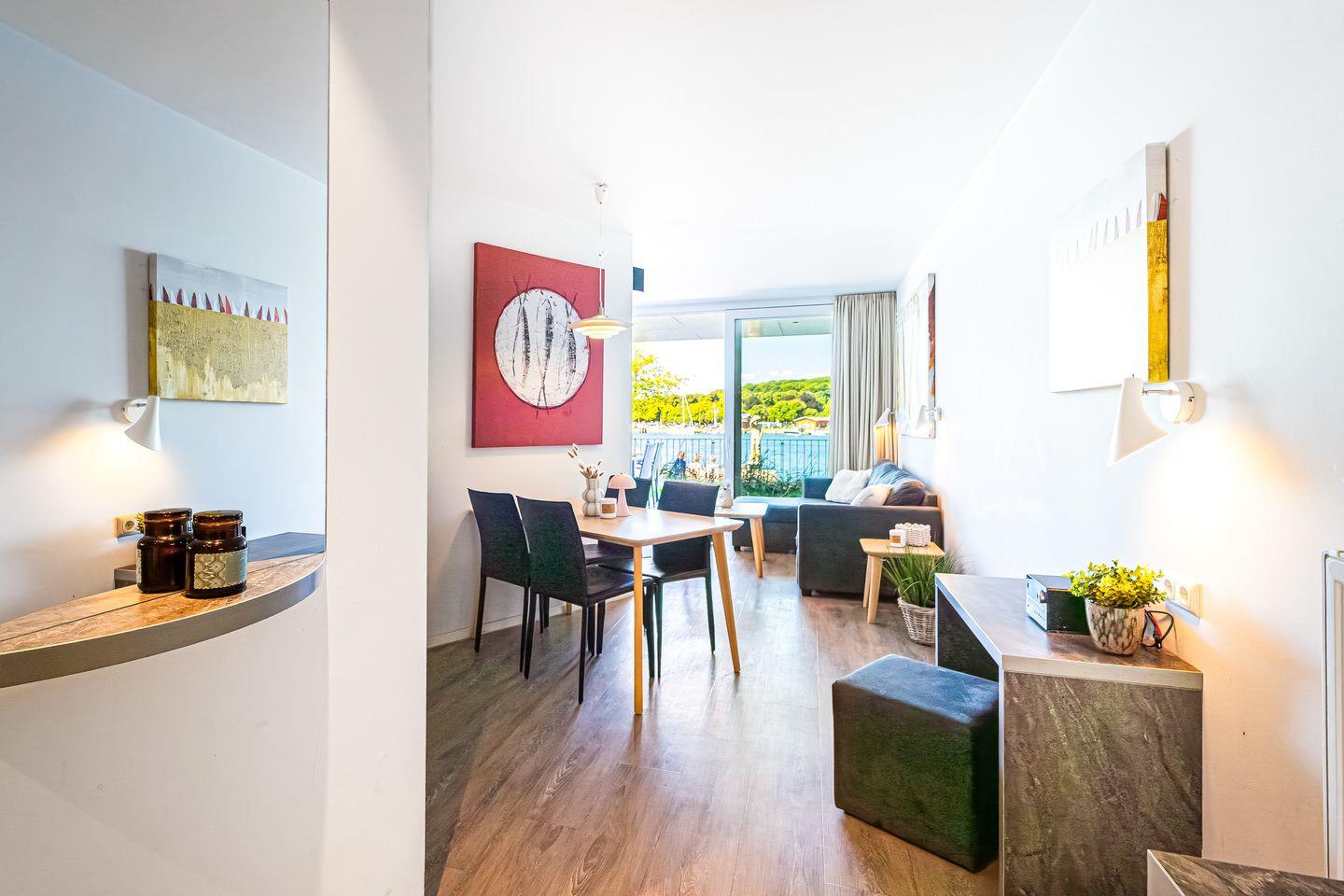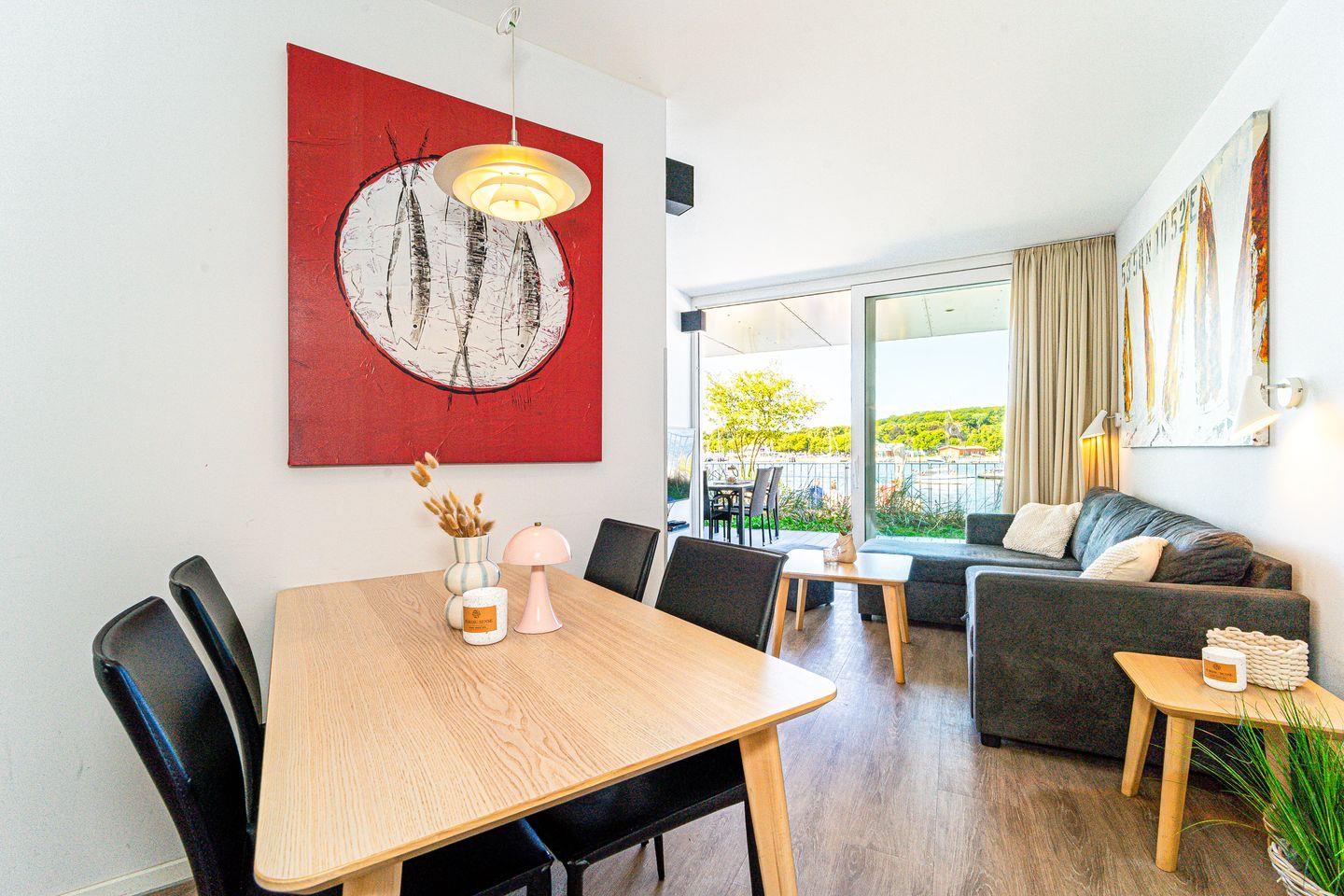 Das Schlafzimmer bietet ein komfortables Doppelbett sowie ausreichend Stauraum. Von hier aus hast Du ebenfalls einen wunderbaren Blick aufs Wasser – und dank einer eigenen Terrassentür gelangst Du direkt ins Freie. So kannst Du morgens die frische Meeresluft genießen oder den Abend entspannt mit Aussicht ausklingen lassen.
