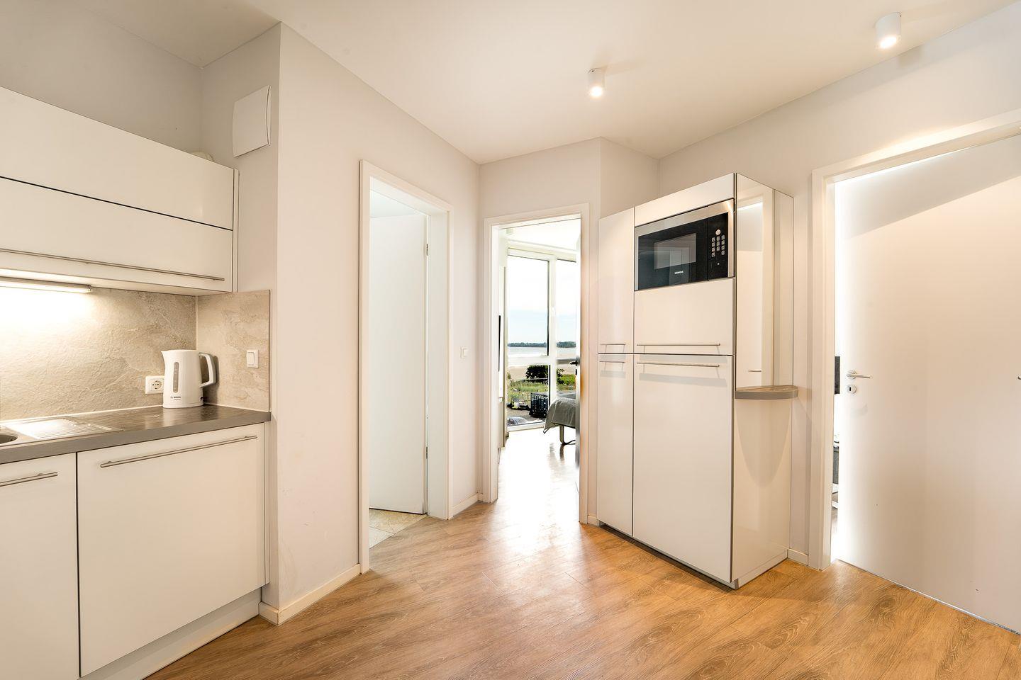 Der Wohnbereich ist hochwertig ausgestattet mit Sofa, Sesseln, HiFi-Anlage, Blu-ray-Player und einem Flachbild-TV. Für stimmungsvolle Abende sorgt der Bioethanolkamin, der den Raum in gemütliches Licht taucht. Durch die Panoramafenster und vom Sofa aus hast Du einen beeindruckenden Blick auf den Segelhafen, die Travemündung, das Museumsschiff „Passat“ und die vorbeiziehenden Skandinavienfähren.