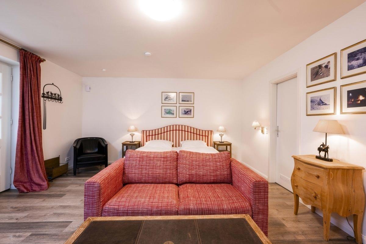 Das gemütlich eingerichtete Ferienappartement für zwei Personen verfügt über einen großzügigen Wohn-, Schlaf- und Essbereich mit voll ausgestatteter Einbauküche. Im Wohn- und Schlafbereich befinden sich ein bequemes Doppelbett, ein gemütliches Sofa und ein Flachbild-TV.