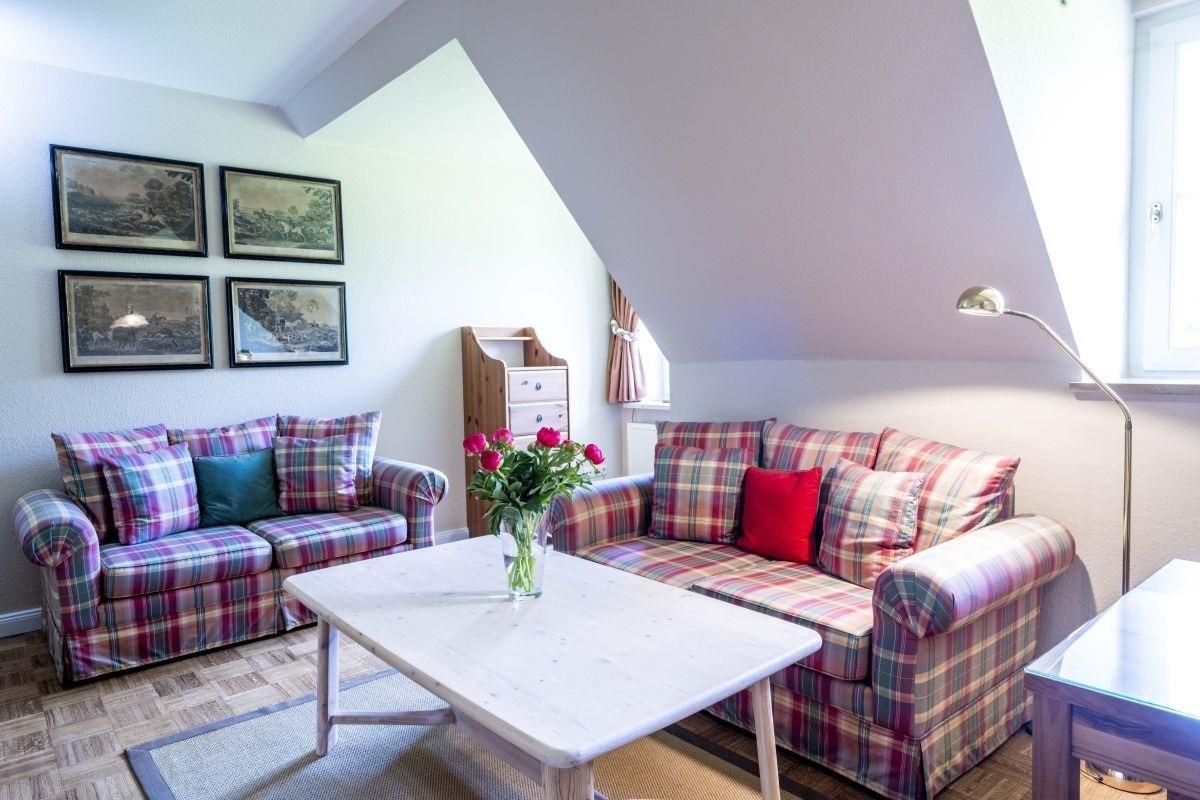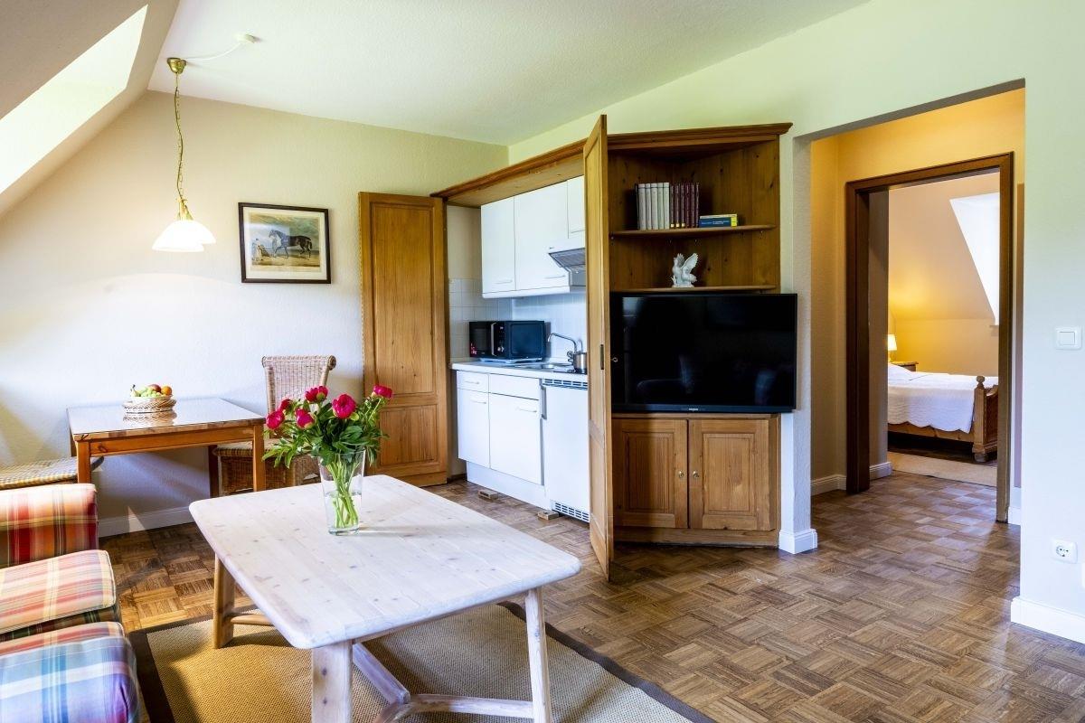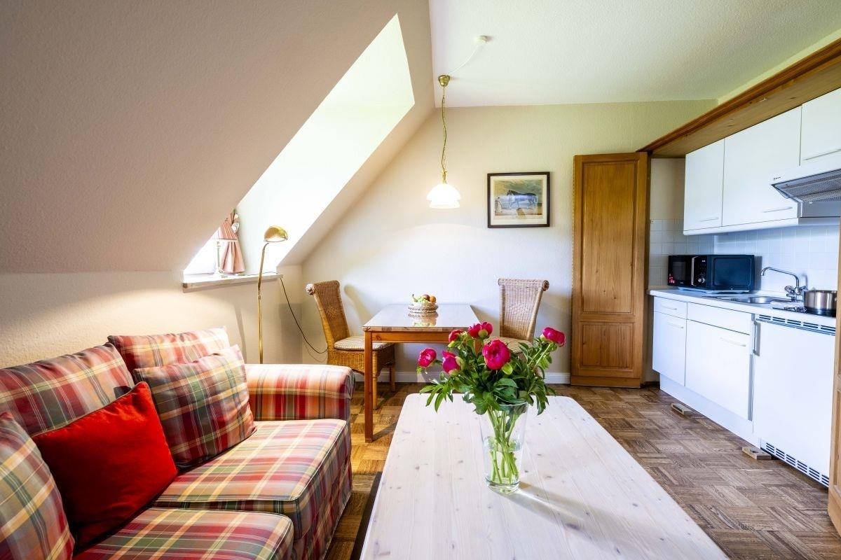 Die Ferienwohnung für zwei Personen befindet sich im 1. OG in einem von zwei Kavaliershäusern innerhalb des Ensembles von Schloss Lüdersburg. Sie verfügt über ein helles Wohnzimmer sowie einen Essbereich mit voll ausgestatteter Einbauküche und gemütlichem Tisch für zwei Personen.