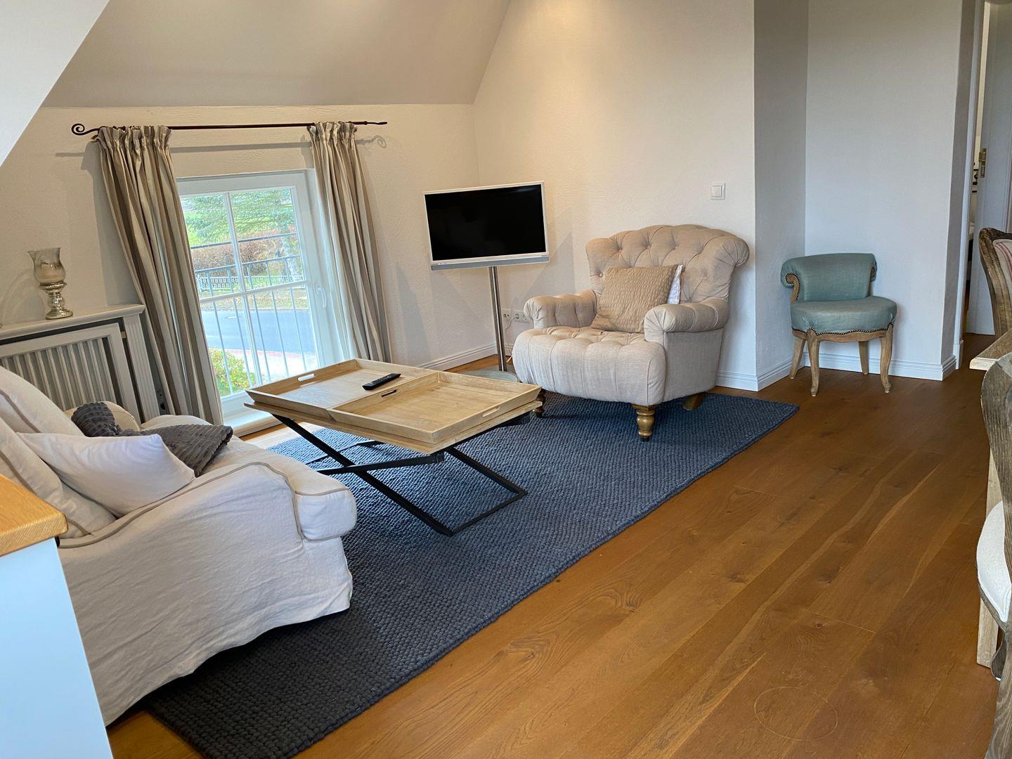 Der großzügige Wohn- und Essbereich ist mit einem Sofa sowie einem Sessel und einem Esstisch ausgestattet. Für einen gemütlichen Fernsehabend steht ein 32“ Fernseher mit Satellitenanschluss für dich bereit. In der gesamten Wohnung stellen wir dir selbstverständlich kostenlos einen schnellen, kabellosen Internetzugang zur Verfügung.