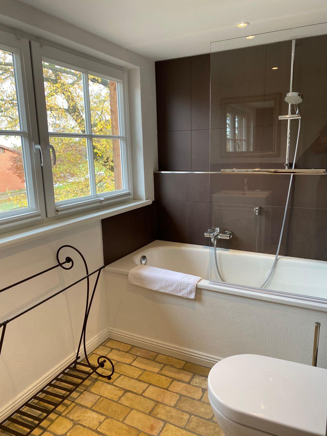 Das in erdnahen Tönen gestaltete Badezimmer mit Badewanne und Duschabtrennung verfügt über eine Handtuchheizung und ausreichend Ablagemöglichkeiten für deine persönlichen Kosmetikprodukte. Handtücher und einen Haartrockner bekommst du von uns gestellt.