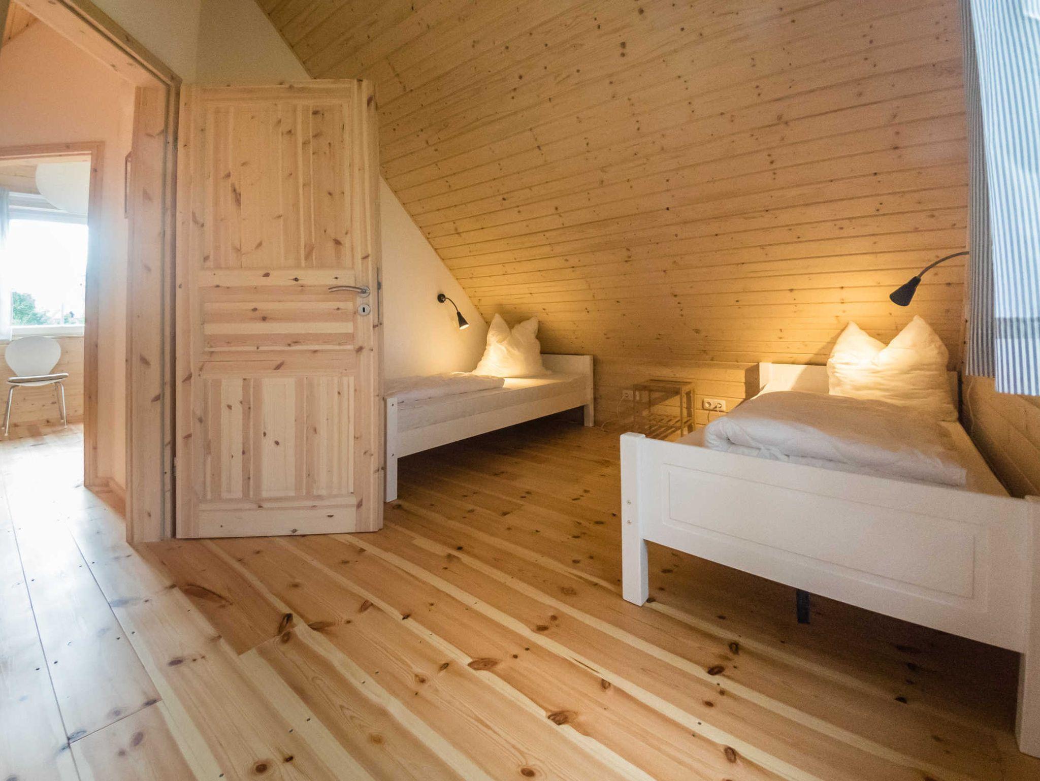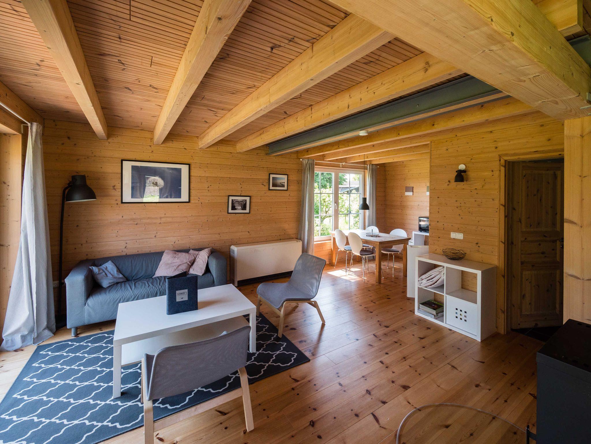 Die zwei separaten Schlafzimmer (eine Aufbettung pro Schlafzimmer möglich) befinden sich im Obergschoss. Sie sind über eine normale Treppe zu erreichen. Der großzügige Wohnraum im Erdgeschoss ist mit Kaminofen, Nachtspeicherheizung und einem Esstisch mit 4 Stühlen ausgestattet.