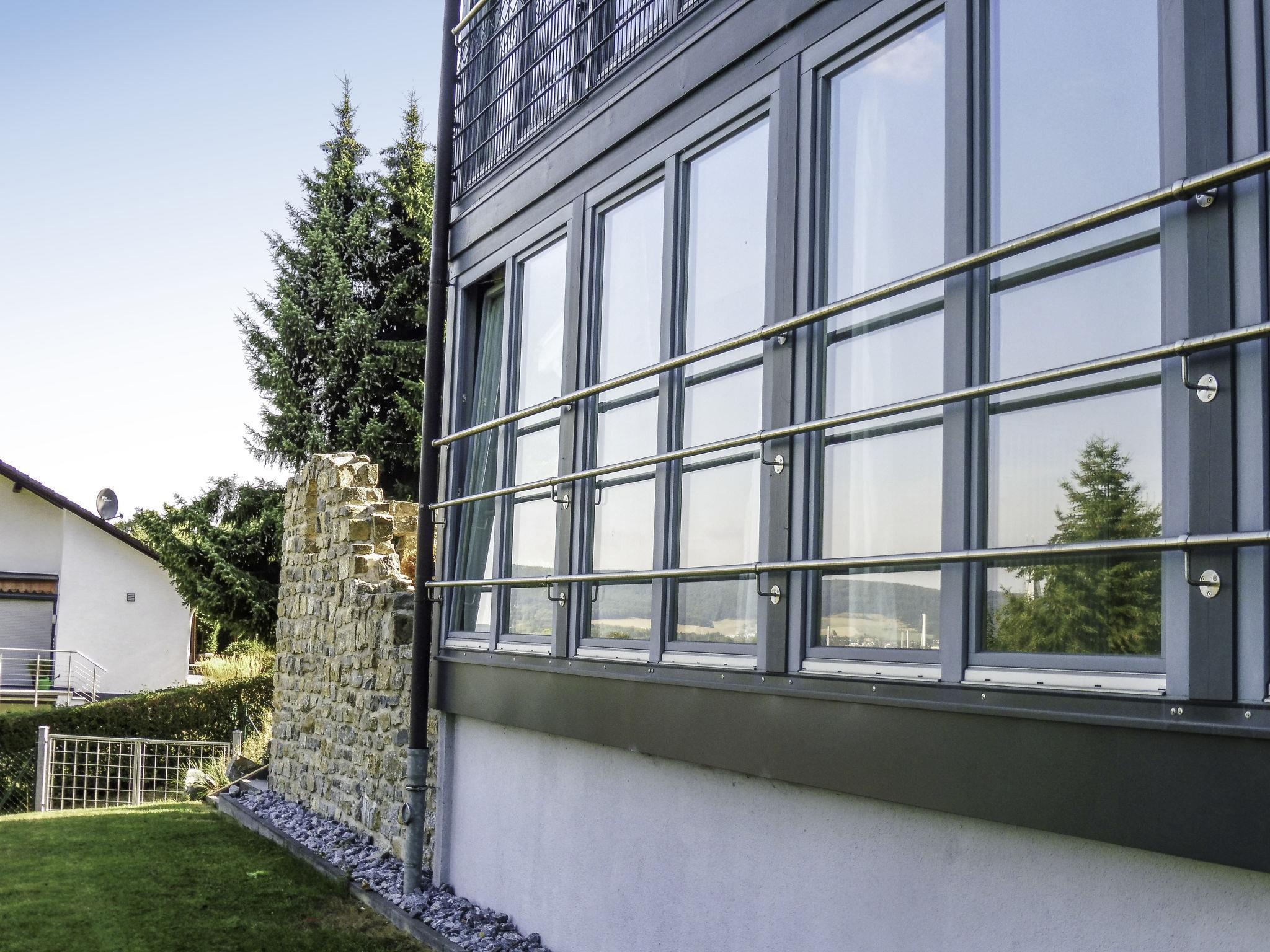 Modern 3-family house semi-detached, surrounded by trees and meadows. Above Lügde (Altstadt), on the outskirts, 800 m from the centre, in a quiet position on a slope, 100 m from the edge of the forest, 8 km from the lake, 1 km from the river, in a cul-de-sac. Stepped path (18 steps) to the house. Parking on the premises. Shop 1 km, grocery 1 km, supermarket 1 km, restaurant 800 m, bakery 1 km, café 800 m, bus stop 300 m, railway station "Lügde" 300 m, outdoor swimming pool 3 km, indoor swimming pool 5 km, thermal baths 5 km, lake Schiedersee 8 km. Golf course (18 hole) 1.5 km, walking paths from the house 200 m. Nearby attractions: Stadtmauer, Wehrtürme, Altstadt Lügde, Schloss Hämelschenburg 12 km, Externsteine Bad Meinberg 30 km, Hermannsdenkmal 40 km. Please note: car recommended.