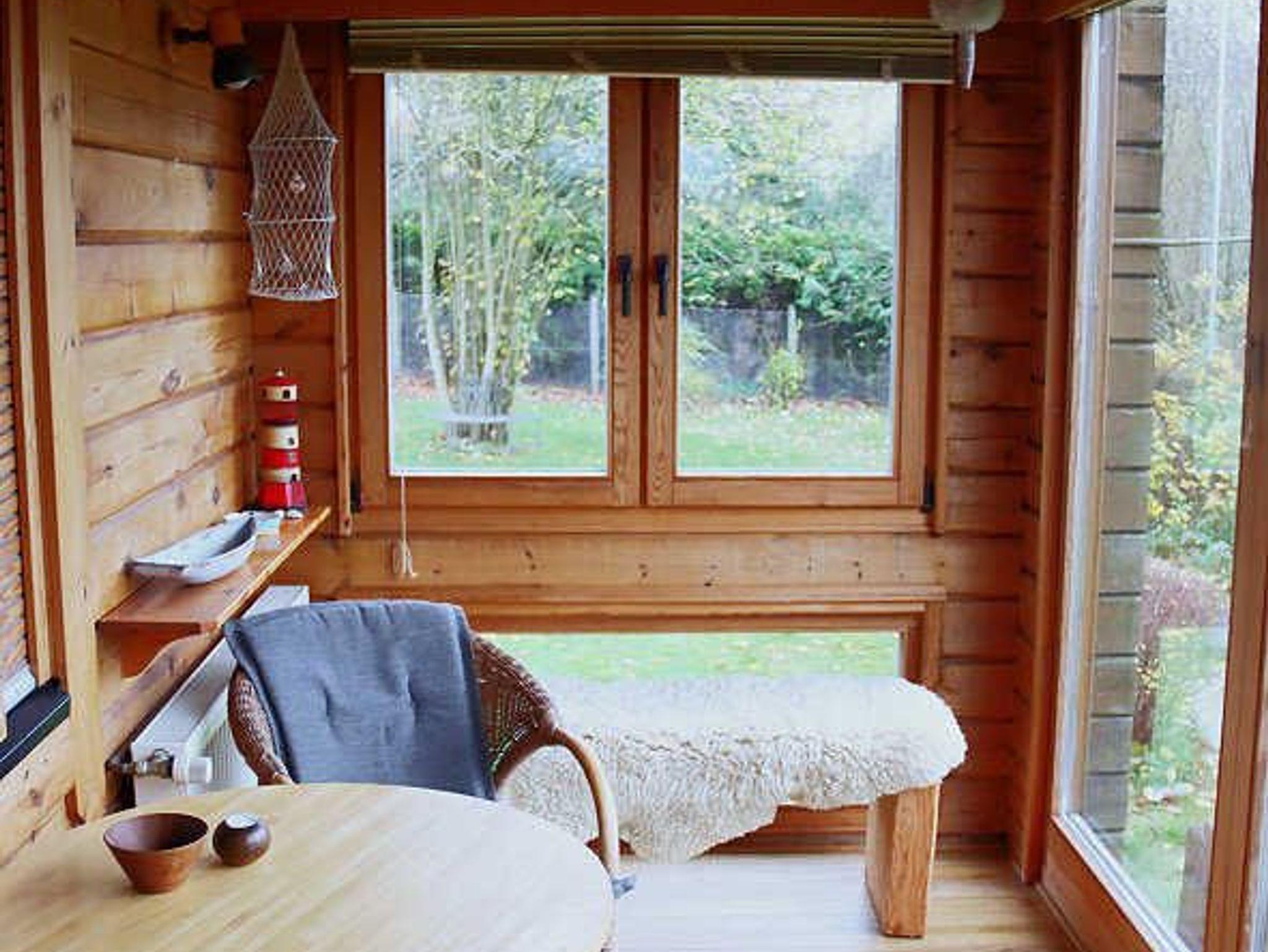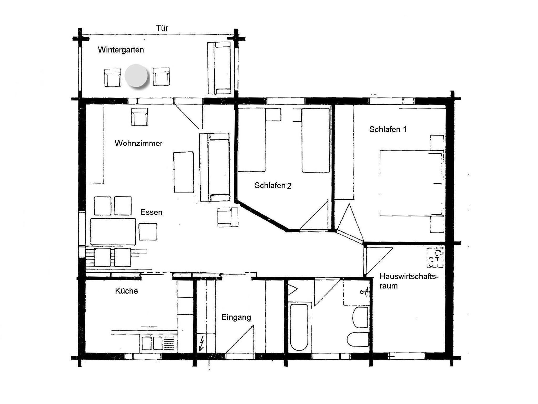 Unser Ferienhaus hat ein großes Wohn-Esszimmer, zwei Schlafzimmer, eine Küche, ein Badezimmer, einen verglasten beheizten Wintergarten und einen Hauswirtschaftsraum.