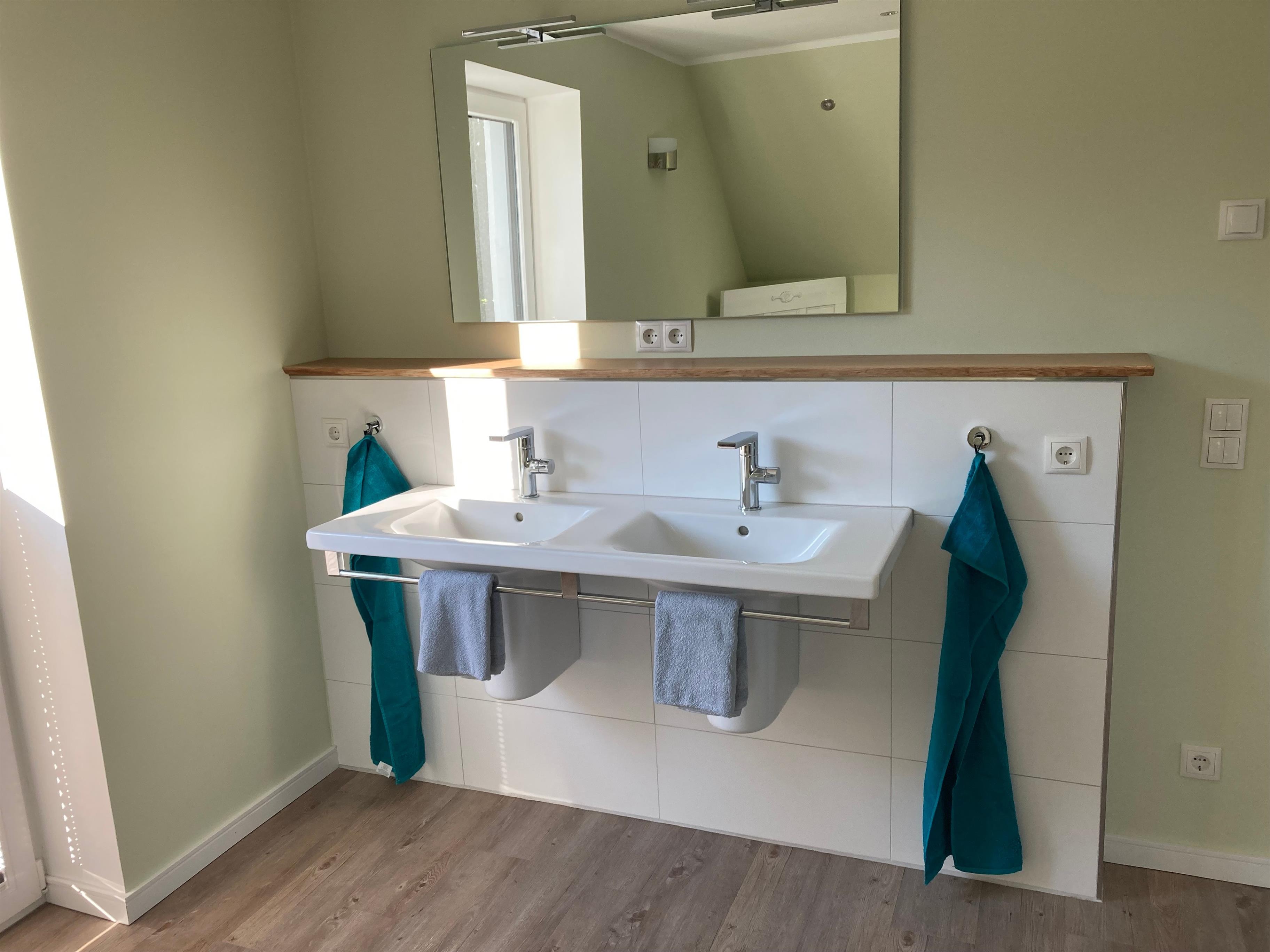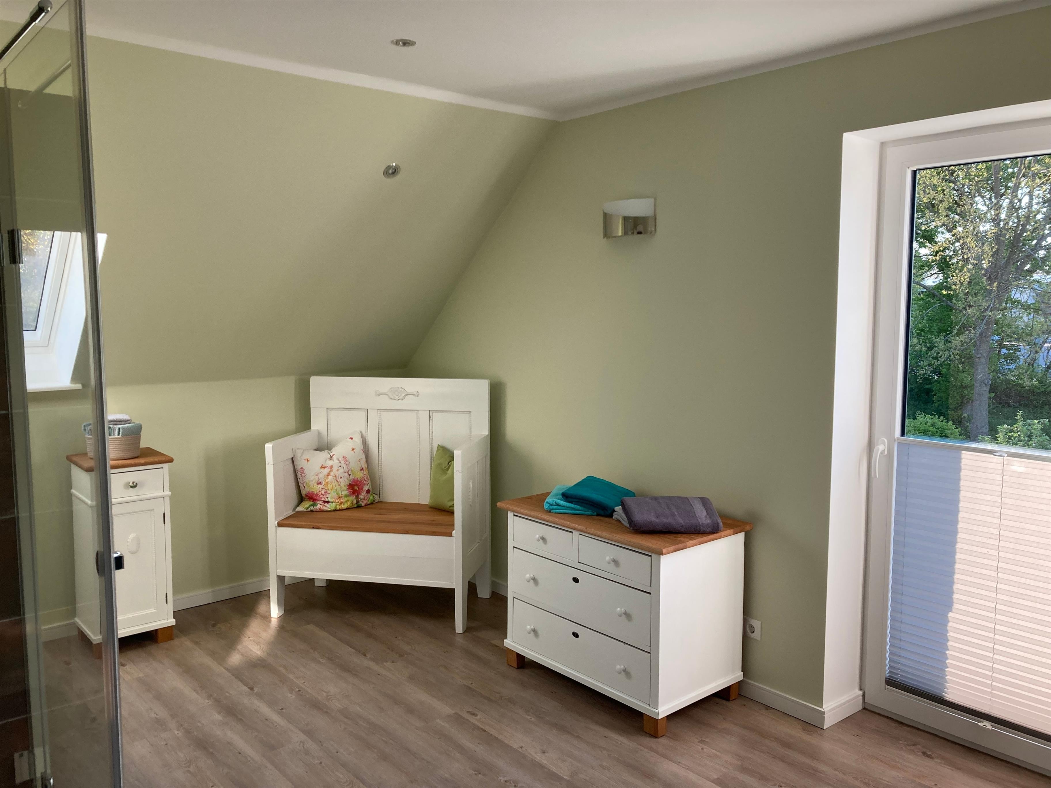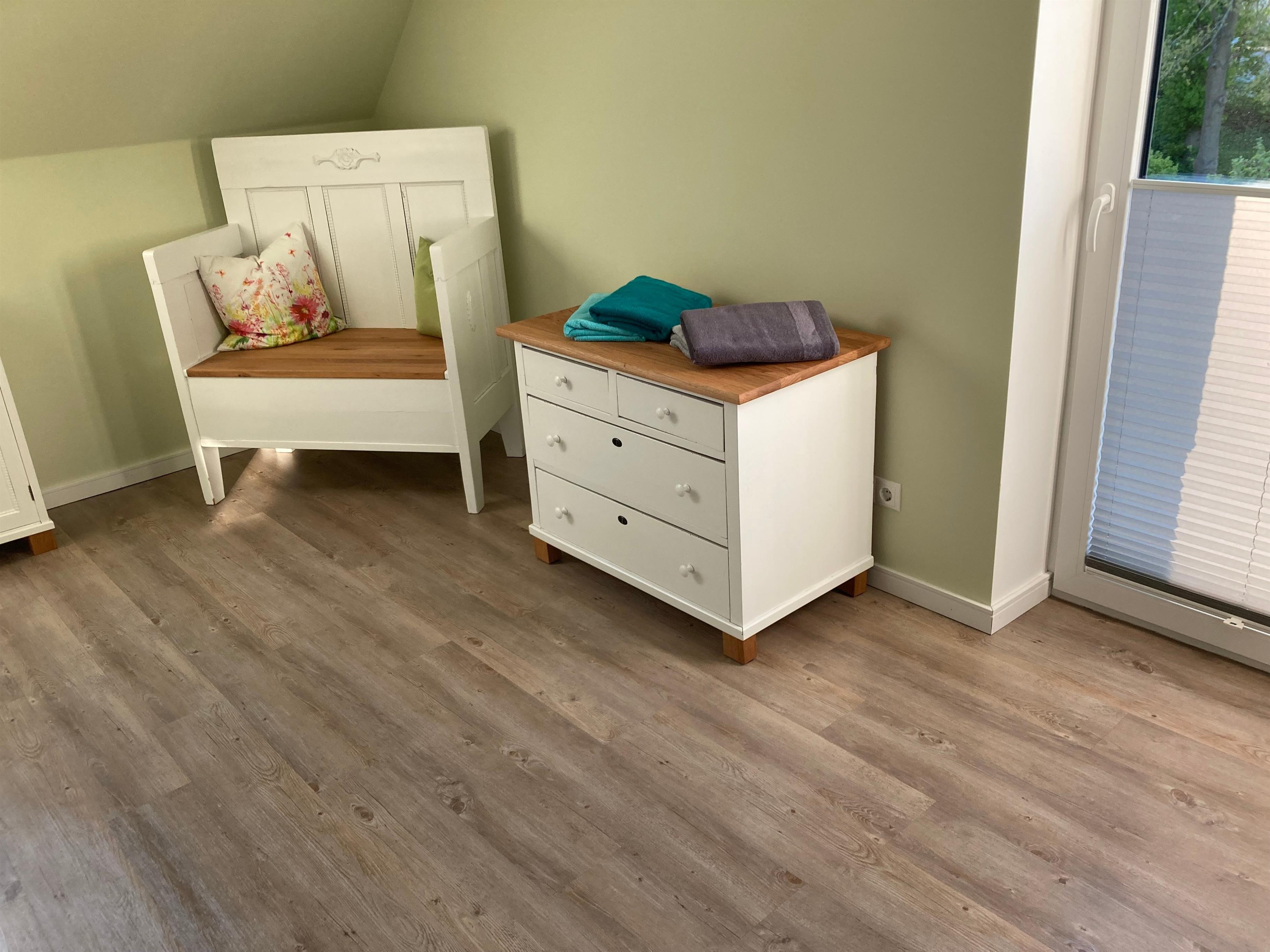 2 geräumige Schlafräume, einmal mit Doppelbett, Schrank und Kommode. Sowie ein Schlafraum mit zwei Einzelbetten, Schrank und Kommode. Ein großes Bad mit Dusche, WC und doppelten Waschbecken.